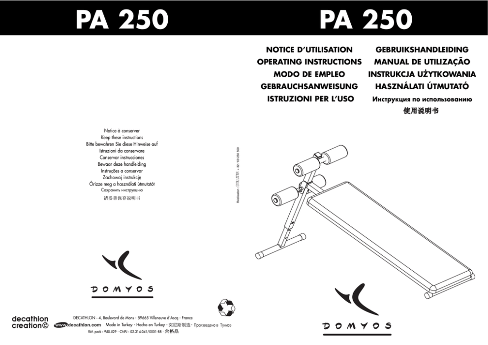 PA 250 PA 250 Réalisation : EVOLUTION + 32 / 69 250 500 Notice à conserver Keep these instructions Bitte bewahren Sie diese Hinweise auf Istruzioni da conservare Conservar instrucciones Bewaar deze handleiding Instruções a conservar Zachowaj instrukcję Őrizze meg a használati útmutatót Сохранить инструкцию DECATHLON - 4, Boulevard de Mons - 59665 Villeneuve d'Ascq - France Made in Turkey - Hecho en Turkey Réf. pack : 950.529 - CNPJ : 02.314.041/0001-88 - - NOTICE D’UTILISATION GEBRUIKSHANDLEIDING OPERATING INSTRUCTIONS MANUAL DE UTILIZAÇÃO MODO DE EMPLEO INSTRUKCJA UŻYTKOWANIA GEBRAUCHSANWEISUNG HASZNÁLATI ÚTMUTATÓ ISTRUZIONI PER L’USO Инструкция по использованию 8 FRANÇAIS .............................................................................................. 4-5 14 ENGLISH ................................................................................................. 6-7 4 8 ESPAÑOL ................................................................................................ 8-9 15 14 15 DEUTSCH ............................................................................................ 10-11 17 16 8 5 13 7 PORTUGUÊS...................................................................................... 16-17 15 17 14 11 7 NEDERLANDS ................................................................................... 14-15 14 15 1 ITALIANO ........................................................................................... 12-13 11 10 6 19 5 WJĘZYKU POLSKIM ...................................................................... 18-19 7 9 5 2 7 ....................................................................................................... 24-25 3 8 5 Русский язык ...................................................................................... 22-23 3 2 MAGYAR ............................................................................................ 20-21 P O L S K I Dziękujemy za wybór urządzenia marki DOMYOS. Markę DOMYOS utworzyliśmy w celu umożliwienia wszystkim zainteresowanym u prawianiem sportu zachowanie dobrej kondycji fizycznej. Produkt ten został stworzony przez sportowców dla sportowców. Będziemy wdzięczni za wszelkie nadesłane komentarze i dotyczące wyrobów marki DOMYOS. Oczekują ich nie tylko pracownicy sklepu, ale również dział projektowania firmy DOMYOS. Jeśli chcesz do nas napisać, wyślij mail na następujący adres :[email protected]. Życzymy doskonałych wyników przy uprawianiu sportu i mamy nadzieję, iż ten wyrób DOMYOS stanie się dla Państwa synonimem jakości. UWAGA • Nieprawidłowe użytkowanie produktu może być przyczyną wypadków. • Przeczytaj instrukcję obsługi i przestrzegaj wszystkich zaleceń i instrukcji. • Nie zezwalaj dzieciom na zabawę na i w pobliżu urządzenia. • Wymień etykiety w przypadku uszkodzenia, nieczytelności lub ich braku. • Keep hands, feet and hairs away from O L S K I OPIS Deska PA250 służy do wzmacniania mięśni brzucha. Deska do ćwiczenia mięśni brzucha służy do wykonywania skłonów tułowia. Ćwiczenia te mają na celu przede wszystkim trening mięśni prostych i skośnych brzucha. BEZPIECZEŃSTWO • Montażem i ustawieniem urządzenia powinna zajmować się osoba dorosła. należy użytkować do czasu zakończenia naprawy. • Przed rozpoczęciem programu ćwiczeń należy skonsultować się z lekarzem. • Ustawiaj urządzenie do ćwiczeń fitnessowych w miejscu o wystarczająco dużej powierzchni, aby można było użytkować je w pełni bezpiecznie. Umieszczaj je na stabilnym, wyrównanym podłożu. • Przed rozpoczęciem treningu przeczytaj uważnie wszystkie wskazówki dotyczące użytkowania urządzenia. • Nie pozwalaj dzieciom używać deski ani bawić się w jej pobliżu podczas treningu. • Użytkowania tego urządzenia jest całkowicie bezpieczne pod warunkiem, że deska przechodzi regularne kontrole. Wszelkie uszkodzone elementy należy natychmiast wymienić. Urządzenia nie • Dla osób o wadze do 110 kg. U Ż Y T K O WA N I E UWAGA • Nie wchodzić! MAXI 110 kg / 240 lbs 11 kg 25 lbs X/XXX.XXX PA 250 P nego poziomu trudności i intensywności ćwiczeń. Połóż się na plecach, trzymając się górnych uchwytów. PRZEBIEG ĆWICZENIA: Zegnij nogi. Na początku ćwiczenia uda powinny być ustawione do tułowia pod kątem 90°. Odchylanie nóg zbyt nisko nie jest konieczne. Ponadto grozi to nadmiernym napięciem pleców. Przysuń kolana do ramion, jednocześnie wydychając powietrze. Nogi powinny być cały czas zgięte. Pośladki powinny oderwać się nieco od deski, tak aby napięły się mięśnie brzucha. Należy koniecznie pamiętać o napinaniu mięśni brzucha. W tym celu należy przybliżyć kość łonową do mostka: to właśnie powoduje napięcie brzucha. Powróć do pozycji początkowej, wdychając jednocześnie powietrze i pamiętając o tym, by nie opuszczać zbytnio nóg. TRENING: Ćwiczenia powinny się odbywać w seriach po 10 - 50 powtórzeń. Jeżeli dopiero zaczynasz uprawiać te ćwiczenia, intensywność treningu zwiększaj stopniowo (na początku 3 serie po 10 powtórzeń, następnie stopniowo zwiększaj liczbę powtórzeń i serii). Dużą skuteczność treningu można osiągnąć ćwicząc co drugi dzień. Mięśnie brzucha można trenować codziennie. ZALECENIA DOTYCZĄCE BEZPIECZEŃSTWA Podczas skłonów tułowia nie kładź rąk na karku. W ten sposób niepotrzebnie sobie pomagasz, przyciągając ramionami tułów, możesz również odnieść obrażenia. Podczas wykonywania skłonów tułowia deski powinna dotykać tylko dolna część ciała. Podczas całego treningu kąt między udami i tułowiem nie powinien przekraczać 90°. Nie przechylaj się do tyłu podczas wykonywania „skłonów tułowia” i nie obniżaj nóg podczas „podnoszenia nóg”. K O N S E RWA C J A STT : XXXXXXXX DECATHLON 4, bd de Mons - 59 650 Villeneu