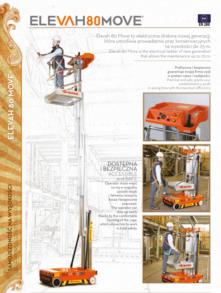 EN 280 Elavah 80 Move to elektryczna drabina nowej generacji, która umożliwia prowadzenie prac konserwacyjnych na wysokości do 7,5 m. Elevah 80 Move is the electrical ladder of new generation that allows the maintenance up to 7,5 m. ELEVAH 80 MOVE Praktyczna i bezpieczna gwarantuje twojej firmie zysk w postaci czasu i wydajności. Practical and safe, grants your establishment a profit in saving time with the maximum efficiency. DOSTĘPNA i BEZPIECZNA SELF-PROPELLED AT THE HEIGHT SAMOJEZDNOŚĆ NA WYSOKOŚCI ACCESSIBLE and SAFE Operator może wejść na nią w wygodny sposób dzięki łatwemu otwarciu kosza i bezpiecznie pracować. The operator can step up easily thanks to the comfortable opening of the cage, which allows him to work in total safety. BEZPIECZEŃSTWO CERTYFIKOWANE CERTIFIED SAFETY KOMPAKTOWA i LEKKA Kompaktowe wymiary i lekkość sprawiają, że ta samojezdna drabina, ważąca tylko 593 kg, jest jedyna w swoim rodzaju. Compactness and lightweight make this self-propelled machine, weighing only kg 593, unique in its performance. ELEVAH 80 MOVE COMPACT and PRACTICAL ŁATWA w UŻYCIU EASY TO LOAD Dzięki ramionom, służącym do ładowania na rampę (opcjonalnie) i umożliwiającym podnoszenie obu kółek, Elevah 65 załadowuje się sama, wykorzystując własny system jezdny. The ramp load device lifts the machine allowing you to ascend also in the presence of short ramps. WSZYSTKO pod KONTROLĄ EVERYTHING is under CONTROL i na wyciągnięcie ręki, także kompletna, ergonomiczna i wydajna tablica sterowania. and close at hand with a complete control panel, ergonomic and efficient. SELF-PROPELLED AT THE HEIGHT ŁATWA do ZAŁADUNKU SAMOJEZDNOŚĆ NA WYSOKOŚCI EASY to USE Kosz posiada ułatwiony system otwierania typu „skrzydła mewy” z automatyczną funkcją blokowania w chwili uruchomienia platformy. The basket is provided with an easy opening, really comfortable, with automatic locking function when the platform comes into operation. Dane techniczne Technical data sheet Udźwig Max capacity Operatorzy Number of persons 1 Wykorzystanie wewnętrzne Use 20 kg Waga maszyny 640 kg ELEVAH 80 MOVE Machine weight Źródło zasilania Power supply Baterie 2 x 12 V-95 A Batteries 2 x 12 V -95 A Ładowarka Battery charger acid 110V-220V Wymiary kół pędnych 225x60 Wymiary kół obrotowych 200x45 Swivel wheels dimensions Promień skrętu Turning radius 1095 Max. prędkość podnoszenia 0,20 m/s Max. prędkość opuszczania 0,15 m/s Max. prędkość przesuwu 0,8 m/s Max. lifting speed Max. lowering speed Max. prędkość przesuwu na wysokości Max. drive speed raised A 1990 mm B Min. odległość kosza od podłoża 600 mm C Max odległość kosza od podłoża 5760 mm E F G H I J K Stowed height Min. platform height from the ground Max. platform height from the ground Wymiary podstawy Footprint Wewnętrzne wymiary kosza Internal dimensions of the basket Wymiary podestu ładunkowego Internal dimensions of the basket Max. stopień nachylenia Max. gradient Max. nacisk na koło przy pełnym obciążeniu* Max. load on the ground/wheel, at full load (*) A B J K K D G 8 Mt H E F 0,2 m/s Wysokość złożonej maszyny D TECHNICAL DATA 24V 2,50% Drive wheels dimension kg. 200 kwasowe Nachylenie pokonywane na wysokości Climbing ability at height Max. drive speed stowed DANE TECHNICZNE internal Pojemność zasobnika Tray capacity * 200 kg I 7 Mt 6 Mt 1280 mm 780 mm 760 mm 5 Mt 667 mm 755 mm 4 Mt 450 mm 15% 2,6 kN 3 Mt C 2 Mt nacisk przy uwzględnieniu, że ciężar * Maksymalny platformy plus maksymalne obciążenie kosza są rozłożone całkowicie po jednej stronie platformy (obciążenie całkowicie asymetryczne). Maximum pressure whereas the weight of the platform plus the maximum load on the basket are completely distributed on one side of the platform (totally asymmetric load). 1 Mt 0 Mt 2 Mt 1 Mt 0 Mt