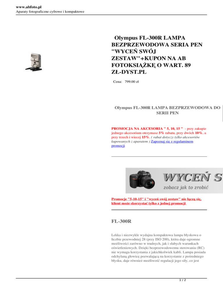 www.abfoto.pl Aparaty fotograficzne cyfrowe i kompaktowe Olympus FL-300R LAMPA BEZPRZEWODOWA SERIA PEN "WYCEŃ SWÓJ ZESTAW"+KUPON NA AB FOTOKSIĄŻKĘ O WART. 89 ZŁ-DYST.PL Cena: 799.00 zł Olympus FL-300R LAMPA BEZPRZEWODOWA DO SERII PEN PROMOCJA NA AKCESORIA " 5, 10, 15 " - przy zakupie jednego akcesorium otrzymasz 5% rabatu, przy dwóch 10%, a przy trzech i wiecej 15%. ( rabat dotyczy tylko akcesoriów kupowanych z aparatem ) Zapoznaj się z regulaminem promocji Promocje "5-10-15" i "wyceń swój zestaw" nie łączą się, klient może skorzystać tylko z jednej promocji FL‑300R Lekka i niezwykle wydajna kompaktowa lampa błyskowa o liczbie przewodniej 28 (przy ISO 200), która daje ogromne możliwości zarówno w trudnych, jak i słabych warunkach oświetleniowych. Dzięki bezprzewodowemu sterowaniu (RC) nie wymaga korzystania z jakichkolwiek kabli. Lampa posiada odchylaną głowicę pozwalającą na korzystanie z pośredniego błysku, daje również możliwość regulacji jego siły, co jest 1/2 www.abfoto.pl Aparaty fotograficzne cyfrowe i kompaktowe niezwykle istotne podczas fotografowania z bliska. Lampą FL‑300R można sterować bezpośrednio z ekranu LCD naszego aparatu. Lampa posiada zintegrowany panel rozpraszający zapewniający pokrycie błyskiem pola widzenia obiektywu Mikro Cztery Trzecie o ogniskowej 9 mm. Właściwości i funkcje Funkcja bezprzewodowej lampy błyskowej Kontrola ustawien bezpośrednio z LCD aparatu Liczba przewodnia 28 (ISO 200) Kompaktowe wymiary i waga zaledwie 97g Opcja TTL Auto, tryb manualny oraz RC Mieści dwie baterie AAA (zalecane: baterie alkaliczne lub akumulatory NiMH) Pomimo dołożenia wszelkich starań oraz zachowania należytej staranności nie możemy zagwarantować, iż prezentowane opisy wraz ze zdjęciami produktów są w pełni zgodne ze specyfikacją producenta i stanem faktycznym. Jednocześnie zastrzegamy sobie prawo do błędów i nie ponosimy odpowiedzialności za błędne podanie parametrów produktów, które mogą być podstawą do ewentualnych roszczeń. W razie jakichkolwiek wątpliwości lub chęci uzyskania dodatkowych informacji prosimy o kontakt z działem handlowym lub weryfikację w oparciu o stronę producenta. Prezentowane treści nie stanowią oferty handlowej w rozumieniu Kodeksu Cywilnego, a mają jedynie charakter informacyjny. 2/2 Powered by TCPDF (www.tcpdf.org)
