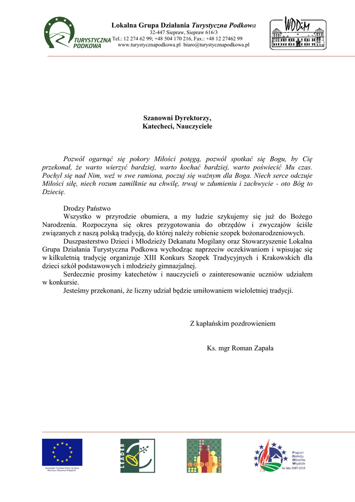 Lokalna Grupa Działania Turystyczna Podkowa 32-447 Siepraw, Siepraw 616/3 Tel.: 12 274 62 99; +48 504 170 216, Fax.: +48 12 27462 99 www.turystycznapodkowa.pl [email protected] Szanowni Dyrektorzy, Katecheci, Nauczyciele Pozwól ogarnąć się pokory Miłości potęgą, pozwól spotkać się Bogu, by Cię przekonał, że warto wierzyć bardziej, warto kochać bardziej, warto poświecić Mu czas. Pochyl się nad Nim, weź w swe ramiona, poczuj się ważnym dla Boga. Niech serce odczuje Miłości siłę, niech rozum zamilknie na chwilę, trwaj w zdumieniu i zachwycie - oto Bóg to Dziecię. Drodzy Państwo Wszystko w przyrodzie obumiera, a my ludzie szykujemy się już do Bożego Narodzenia. Rozpoczyna się okres przygotowania do obrzędów i zwyczajów ściśle związanych z naszą polską tradycją, do której należy robienie szopek bożonarodzeniowych. Duszpasterstwo Dzieci i Młodzieży Dekanatu Mogilany oraz Stowarzyszenie Lokalna Grupa Działania Turystyczna Podkowa wychodząc naprzeciw oczekiwaniom i wpisując się w kilkuletnią tradycję organizuje XIII Konkurs Szopek Tradycyjnych i Krakowskich dla dzieci szkół podstawowych i młodzieży gimnazjalnej. Serdecznie prosimy katechetów i nauczycieli o zainteresowanie uczniów udziałem w konkursie. Jesteśmy przekonani, że liczny udział będzie umiłowaniem wieloletniej tradycji. Z kapłańskim pozdrowieniem Ks. mgr Roman Zapała Lokalna Grupa Działania Turystyczna Podkowa 32-447 Siepraw, Siepraw 616/3 Tel.: 12 274 62 99; +48 504 170 216, Fax.: +48 12 27462 99 www.turystycznapodkowa.pl [email protected] Siepraw, 4 październik 2013r. Regulamin Konkursu Szopek Bożenarodzeniowych ORGANIZATOR - Parafia Rzymskokatolicka św. Michała Archanioła w Sieprawiu - Duszpasterstwo Dzieci i Młodzieży Dekanatu Mogilany - Gmina Siepraw - Stowarzyszenie Lokalna Grupa Działania Turystyczna Podkowa HONOROWY PATRONAT - Arcybiskup Metropolita Krakowski - ks. Kardynał Stanisław Dziwisz - Dyrektor Wydziału Katechetycznego - ks. dr Krzysztof Wilk - Dziekan Dekanatu Mogilany - ks. mgr Piotr Kluska - Starosta Powiatu Myślenickiego - mgr Józef Tomal - Wójt Gminy Siepraw - mgr inż. Tadeusz Pitala - Prezes Stowarzyszenia Lokalna Grupa Działania Turystyczna Podkowa – Jan Marek Lenczowski ADERESACI: Konkurs adresowany jest do uczniów przedszkoli, szkół podstawowych, gimnazjum z obszaru działania Stowarzyszenia Lokalna Grupa Działania Turystyczna Podkowa: Siepraw, Dobczyce, Raciechowice, Wiśniowa, Pcim oraz Dekanatu Mogilany. Dopuszcza się także możliwość złożenia prac spoza Dekanatu Mogilany i spoza obszaru Turystycznej Podkowy. KATEGORIE: Konkurs organizowany jest w czterech grupach wiekowych: I. Dzieci najmłodsze – przedszkole i uczniowie klas 0 II. Dzieci młodsze – uczniowie klas I-III szkół podstawowych III. Dzieci starsze – uczniowie klas IV-VI szkół podstawowych IV. Młodzież – uczniowie klas gimnazjalnych W przypadku zgłoszenia prac zbiorowych organizator przyznaje jedną nagrodą. Dopuszcza się pomoc rodziców przy przygotowaniu szopek. ZAŁOŻENIA KONKURSU Forma i sposób wykonania - wszystkie elementy szopki powinny być wykonane własnoręcznie, zwłaszcza bez zakupionych gotowych figurek. Przewidziane nagrody za oryginalność i pomysłowość. Lokalna Grupa Działania Turystyczna Podkowa 32-447 Siepraw, Siepraw 616/3 Tel.: 12 274 62 99; +48 504 170 216, Fax.: +48 12 27462 99 www.turystycznapodkowa.pl [email protected] Konkurs ma dwa etapy. Pierwszy etap zostanie przeprowadzony na szczeblu: danej gminy obszaru Turystycznej Podkowy, z którego najlepsze prace (maksymalnie 15 z danej gminy) zostaną nadesłane do drugiego etapu; Dekanatu Mogilany – ilość prac dowolna. Pierwszy etap zostanie rozstrzygnięty do 11 grudnia 2013r. Do drugiego etapu prace należy złożyć w dniach 12 - 13 grudnia 2013r w godzinach od 1400 do 2000 w Starym Kościele w Sieprawiu, po wcześniejszym kontakcie pod numerami telefonu: 12 274-60-97, 504 170 216. W czasie Świąt Bożego Narodzenia przewidziana jest wystawa prac w Starym Kościele w Sieprawiu z wyborem nagrody publiczności. Wręczenie nagród za wyróżnione prace nastąpi w dniu 4 stycznia 2014r. godzina 16,00, o czym zostaną powiadomione zainteresowane osoby. Prosi się o dokładne podpisanie prac i dołączenie imiennego wykazu wykonawców szopek. Praca dokładnie opisana decyduje o dopuszczeniu do konkursu. Opisu pracy należy wykonać pismem drukowanym oraz dokładnie przymocować na sznureczku do pracy. W opisie szopki należy umieścić: imię i nazwisko wykonawcy, klasę, adres, miejscowość, telefon, w przypadku prac zbiorowych dodatkowo imię i nazwisko opiekuna wraz z telefonem kontaktowym. Opis pracy należy wykonać według dołączonej KARTY OPISU. Odbiór prac po konkursie w nieprzekraczalnym terminie do 24.01.2014r. Za nie odebrane w terminie prace organizatorzy nie biorą żadnej odpowiedzialności. Uczestnictwo w konkursie jest zgodą na wykorzystanie przez organizatorów wzorów prac do celów promocji w tym również do umieszczania ich w różnych publikacjach oraz umieszenia na stronach internetowych. Lp. 1. 2. 3. Imię Nazwisko KARTA OPISU adres zam. Szkoła klasa telefon uwagi