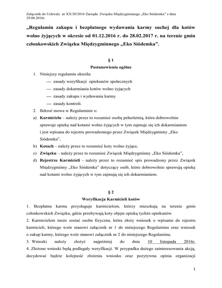 Załącznik do Uchwały nr XX/20/2016 Zarządu Związku Międzygminnego „Eko Siódemka” z dnia 29.08.2016r. ,,Regulamin zakupu i bezpłatnego wydawania karmy suchej dla kotów wolno żyjących w okresie od 01.12.2016 r. do 28.02.2017 r. na terenie gmin członkowskich Związku Międzygminnego „Eko Siódemka”. §1 Postanowienia ogólne 1. Niniejszy regulamin określa: zasady weryfikacji opiekunów społecznych zasady dokarmiania kotów wolno żyjących zasady zakupu i wydawania karmy zasady kontroli. 2. Ilekroć mowa w Regulaminie o: a) Karmicielu – należy przez to rozumieć osobę pełnoletnią, która dobrowolnie sprawuje opiekę nad kotami wolno żyjących w tym zajmuje się ich dokarmianiem i jest wpisana do rejestru prowadzonego przez Związek Międzygminny „Eko Siódemka”, b) Kotach – należy przez to rozumieć koty wolno żyjące, c) Związku – należy przez to rozumieć Związek Międzygminny „Eko Siódemka”, d) Rejestrze Karmicieli - należy przez to rozumieć spis prowadzony przez Związek Międzygminny „Eko Siódemka” dotyczący osób, które dobrowolnie sprawują opiekę nad kotami wolno żyjących w tym zajmują się ich dokarmianiem. §2 Weryfikacja Karmicieli kotów 1. Bezpłatna karma przysługuje karmicielom, którzy mieszkają na terenie gmin członkowskich Związku, gdzie przebywają koty objęte opieką tychże opiekunów. 2. Karmicielem może zostać osoba fizyczna, która złoży wniosek o wpisanie do rejestru karmicieli, którego wzór stanowi załącznik nr 1 do niniejszego Regulaminu oraz wniosek o zakup karmy, którego wzór stanowi załącznik nr 2 do niniejszego Regulaminu. 3. Wnioski należy złożyć najpóźniej do dnia 10 listopada 2016r. 4. Złożone wnioski będą podlegały weryfikacji. W przypadku dużego zainteresowania akcją, decydować będzie kolejność złożenia wniosku oraz pozytywna opinia organizacji 1 Załącznik do Uchwały nr XX/20/2016 Zarządu Związku Międzygminnego „Eko Siódemka” z dnia 29.08.2016r. pozarządowej potwierdzającej dokarmianie kotów przez wnioskującą osobę. O podjętej decyzji Związek pisemnie powiadomi wnioskodawcę w terminie 14 dni od złożenia wniosku. §3 Dokarmianie kotów wolno żyjących 1. Karmiciel zobowiązuje się w ramach współpracy ze Związkiem: 1) prowadzić regularne dokarmianie kotów w stałym i bezpiecznym dla zwierząt miejscu; 2) przechowywać karmę przekazaną przez Związek w sposób zabezpieczający ją przed zniszczeniem lub zepsuciem; 3) sprawować opiekę nad kotami w zakresie ich dokarmiania we wskazanym miejscu za akceptacją/zgodą właściciela lub zarządcy nieruchomości; 4) dokarmiać koty w sposób nie stwarzający uciążliwości dla mieszkańców oraz zachować porządek i czystość w miejscu dokarmiania; 5) zgłaszać niezwłocznie do Związku zmianę danych wskazanych we wniosku o zakup karmy, o którym mowa w § 2 ust. 2, a w szczególności o ilości dokarmianych kotów oraz o fakcie zaprzestania dokarmiania. 2. Karmicielowi nie przysługuje jakiekolwiek wynagrodzenie lub świadczenie z tytułu realizowanego porozumienia. 3. Karmiciel wykonuje zadanie osobiście. 4. Karmiciel może powierzyć wykonywanie zadania innej osobie (czasowo w uzasadnionych i losowych przypadkach), lecz w pełni odpowiada za wykonanie porozumienia. §4 Zasady zakupu i wydawania karmy 1. Na realizację zadania związanego z dokarmianiem kotów, Związek zapewnia w budżecie na 2016 rok, łączną kwotę 10 000,00 zł. 2. Zakupem i wydawaniem karmy suchej dla kotów zajmuje się Związek. 3. Z uwagi na ograniczone środki budżetowe ustala się następujące warunki wydawania i wykładania karmy: 1) ustala się liczbę kotów, dla których wydawana będzie karma jednemu opiekunowi w ilości od 5 do 15 kotów, przyjmując limit – 1,5 kg karmy suchej/miesiąc/kot; 2 Załącznik do Uchwały nr XX/20/2016 Zarządu Związku Międzygminnego „Eko Siódemka” z dnia 29.08.2016r. 2) ilość wydawanej karmy jednemu opiekunowi stanowi iloczyn liczby kotów wskazanych we wniosku o zakup karmy i przyjętego limitu karmy na jednego kota na miesiąc; 3. Karma wydawana będzie Karmicielom we wcześniej ustalonych terminach, w biurach Związku Międzygminnego „Eko Siódemka” zlokalizowanych na: 1) ul. Kołłątaja 7 w Krotoszynie, pokój nr 58, 2) al. Powstańców Wlkp. 47 w Kobylinie, 3) ul. Grunwaldzkiej 41 w Cieszkowie, 4) ul. Rynek 2 w Zdunach, 5) ul. Rynek 11 w Sulmierzycach, 4. Wydawanie karmy odbywać się będzie za potwierdzeniem odbioru, którego wzór stanowi załącznik nr 3 do niniejszego Regulaminu. §5 Zasady kontroli 1. Związek Międzygminny „Eko Siódemka” zastrzega sobie prawo do przeprowadzania kontroli realizacji zadania powierzonego Karmicielowi. Kontrola może dotyczyć w szczególności wyznaczenia i zorganizowania miejsca dokarmiania kotów. 2. O terminie kontroli Związek nie ma obowiązku powiadamiać Karmiciela. 3. Kontrole przeprowadza się w miejscu i godzinach wskazanych we wniosku o przyznanie karmy. 4. Związek Międzygminny „Eko Siódemka” zastrzega sobie prawo rozwiązania współpracy z Karmicielem w przedmiocie zapewnienia opieki kotom wolno żyjących poprzez ich dokarmianie oraz wykreślenia z Rejestru Karmicieli z uwagi na nieprzestrzeganie zasad lub warunków współpracy, a w szczególności w przypadku: karmienia w niewłaściwym miejscu, tj. niebezpiecznym dla zwierząt lub bez zgody właściciela lub zarządcy nieruchomości, nieregularnego wykładania karmy, dysponowania karmą niezgodnie z przeznaczeniem, niewłaściwego przechowywania karmy, przekazania otrzymanej karmy osobom trzecim (za wyjątkiem czasowego przekazania zadania innej osobie w uzasadnionych i losowych przypadkach) lub nieodebrania karmy w wyznaczonym terminie. 3