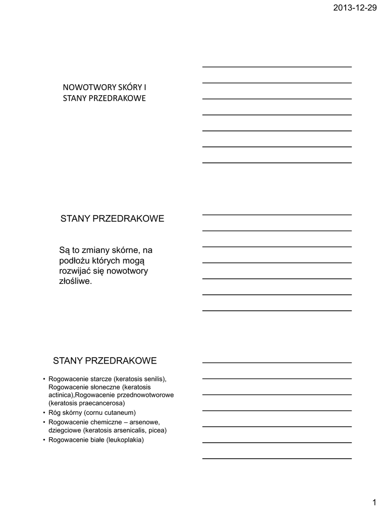 2013-12-29 NOWOTWORY SKÓRY I STANY PRZEDRAKOWE STANY PRZEDRAKOWE Są to zmiany skórne, na podłożu których mogą rozwijać się nowotwory złośliwe. STANY PRZEDRAKOWE • Rogowacenie starcze (keratosis senilis), Rogowacenie słoneczne (keratosis actinica),Rogowacenie przednowotworowe (keratosis praecancerosa) • Róg skórny (cornu cutaneum) • Rogowacenie chemiczne – arsenowe, dziegciowe (keratosis arsenicalis, picea) • Rogowacenie białe (leukoplakia) 1 2013-12-29 LECZENIE STANÓW PRZEDRAKOWYCH • • • • • • 5-fluorouracyl imiquimod elektrokochirurgia laserochirurgia kriochirurgia metoda fotodynamiczna STANY PRZEDRAKOWE (USPOSABIAJĄCE DO NOWOTWORZENIA) • • • • • Xeroderma pigmentosum Radiodermitis chronica Epidermodysplazja verruciformis Cheilitis glandularis Balanitis xerotica obliterans, Kraurosis vulvae • Epidermolysis bullosa dystrophica STANY PRZEDRAKOWE (USPOSABIAJĄCE DO NOWOTWORZENIA) • Przewlekłe stany zapalne z bliznowaceniem – gruźlica toczniowa • Blizny przerosłe po oparzeniach • Drażnione owrzodzenia 2 2013-12-29 NOWOTWORY ZŁOŚLIWE SKÓRY • Rak podstawnokomórkowy (Carcinoma basocellulare, BCC) – Nabłoniak podstawnokomórkowy (Epithelioma basocelulare) • Rak kolczystokomórkowy (Carcinoma spinocellulare, SCC, Carcinoma planoepitheliale spinocellulare) RAK PODSTAWNOKOMÓRKOWY • Rak guzkowy (BCC nodosum) • Rak wrzodziejący (BCC exulcerans) • Rak twardzinopodony (BCC morpheiforme) • Rak torbielowaty (BCC cysticum) • Rak powierzchowny (BCC superficiale, Morbus Arning) • Rak barwnikowy (BCC pigmentosum) RAK KOLCZYSTOKOMÓRKOWY • Rak wrzodziejący (SCC exulcerans) • Rak brodawkujący (SCC vegetans) 3 2013-12-29 LECZENIE RAKÓW • Rak podstawnokomórkowy – kriochirurgia, metoda fotodynamiczna, elektrochirurgia, laserochirurgia, wycięcie chirurgiczne, imiquimod, 5-fluorouracyl, interferon. • Rak kolczystokomórkowy – wycięcie chirurgiczne, laserochirurgia, głęboka kriochirurgia, radioterapia. NOWOTWORY ZŁOŚLIWE SKÓRY • Rak brodawkujący (Carcinoma verrucosum, cuniculatum) • Choroba Pageta (Morbus Paget) • Czerniak (Melanoma malignum) CHOROBA PAGETA • Okolica brodawki sutkowej (Morbus Paget mammaris) • Okolica pozasutkowa – narządów płciowych i odbytu (Morbus Paget extramammaris) 4 2013-12-29 STAN RZEKOMONOWOTWOROWY Są to różne stany chorobowe, wykazujące znaczne podobieństwo do raków, ale mające łagodny przebieg i skłonność do samoistnego ustępowania. STAN RZEKOMONOWOTWOROWY • Rogowiak kolczystokomórkowy (keratoacanthoma) • Samoistnie gojące się raki kolczystokomórkowe • Rogowacenie rzekomoguzowate Potha • Papillomatosis cutis carcinoides Gottron • Papilomatosis florida oris • Dyskeratoma verrucosum RAK IN SITU Jest to rak przedinwazyjny z charakterystycznym obrazem histopatologicznym - zaburzenie rogowacenia typu dyskeratozy, - różny stopień atypii jąder komórek naskórka, - zachowana błona podstawna. 5 2013-12-29 RAK PRZEDINWAZYJNY IN SITU Choroba Bowena Erytroplazja Queyrata PIERWOTNE ZŁOŚLIWE CHŁONIAKI SKÓRNE • Pierwotne chłoniaki z komórek T • Pierwotne chłoniaki z komórek B PIERWOTNE CHŁONIAKI Z KOMÓREK T CTCL – Cutaneus T-Cell Lymphoma • Ziarniniak grzybiasty • Zespół Sezary’ego • Pierwotne skórne choroby limfoproliferacyjne CD30+ (lymphomatoid papulosis) • Chłoniak/białaczka dorosłych z komórek T • Skórny chłoniak T typu zapalenia tkanki podskórnej • Pozawęzłowy chłoniak T • Niesklasyfikowane chłoniaki 6 2013-12-29 PIERWOTNE CHŁONIAKI Z KOMÓREK B • • • • Chłoniak strefy brzeżnej (immunocytoma) Chłoniak z ośrodków rozmnażania Chłoniak wielkokomórkowy kooczyn dolnych Inne chłoniaki rozsiane wielkokomórkowe (plasmocytoma, chłoniak limfocytowy) LECZENIE CHŁONIAKÓW SKÓRY • • • • Metoda PUVA lub RePUVA Promienie X Chemioterapia Interferon KLINICZNY PODZIAŁ ZNAMION BARWNIKOWYCH Zwykłe znamię melanocytowe • • • • • koliste lub owalne śr. 0,2-0,5 cm jednolite zabarwienie beżowe lub brązowe zachowany rysunek skóry na pow. zmiany • płaskie lub kopulaste Atypowe znamię melanocytowe • brzegi nieregularne • często niewyraźnie odgraniczone • śr. powyżej 0,6-0,7 cm • niejednolite zabarwienie • jasno- lub ciemnobrązowe 7 2013-12-29 KLINICZNY PODZIAŁ ZNAMION BARWNIKOWYCH Znamię melanocytowe wrodzone Znamię melanocytowe nabyte HISTOPATOLOGICZNY PODZIAŁ ZNAMION BARWNIKOWYCH Znamię łączące (junction naevus) Znamię złożone (compound naevus) Znamię skórne (dermal naevus) CZERNIAK • Czerniak szerzący się powierzchownie (Superficial spreading melanoma-SMM) • Czerniak guzkowy (Nodular melanoma-NM) • Czerniak niesklasyfikowany • Czerniak dystalny (Melanoma acrolentiginosum-ALM) • Czerniak wychodzący z plamy soczewicowatej złośliwej (Lentigo maligna melanoma-LMM) 8 2013-12-29 DIAGNOSTYKA CZERNIAKA • • • • • badanie kliniczne USG metoda fotodynamiczna dermatoskopia histopatologia OBRAZ KLINICZNY WCZESNEGO CZERNIAKA A - asymetry - asymetria kształtu B - border irregularity - nieregularny brzeg C - colour - niejednolite zabarwienie D - diameter - średnica zmiany (pow. 4 mm) E - enlargement - powiększenie KLASYFIKACJA NACIEKANIA GUZA WG. CLARKA • • • • • I - naskórek II - górna część warstw brodawkowatej skóry III - cała warstwa brodawkowata IV - warstwa siateczkowata skóry V - tkanka podskórna 9 2013-12-29 KLASYFIKACJA NACIEKANIA GUZA WG. BRESLOWA • • • • 0 - 0,75 mm 0,76 - 1,5 mm 1,51 - 4 mm pow. 4 mm 10 2013-12-29 LECZENIE CZERNIAKA • wycięcie chirurgiczne • • • • laserochirurgia radioterapia chemioterapia interferon PROFILAKTYKA I POSTĘPOWANIE • ochrona przed promieniowaniem UV • ochrona przed drażniącym działaniem czynników fizycznych i chemicznych • kliniczna kontrola co 6 miesięcy (w przypadku znamion barwnikowych) • badanie dermatoskopowe • badanie histopatol