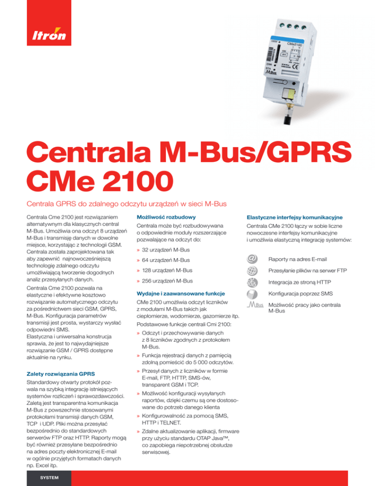 Centrala M-Bus/GPRS CMe 2100 Centrala GPRS do zdalnego odczytu urządzeń w sieci M-Bus Centrala Cme 2100 jest rozwiązaniem alternatywnym dla klasycznych central M-Bus. Umożliwia ona odczyt 8 urządzeń M-Bus i transmisję danych w dowolne miejsce, korzystając z technologii GSM. Centrala została zaprojektowana tak aby zapewnić najnowocześniejszą technologię zdalnego odczytu umożliwiającą tworzenie dogodnych analiz przesyłanych danych. Centrala Cme 2100 pozwala na elastyczne i efektywne kosztowo rozwiązanie automatycznego odczytu za pośrednictwem sieci GSM, GPRS, M-Bus. Konfiguracja parametrów transmisji jest prosta, wystarczy wysłać odpowiedni SMS. Elastyczna i uniwersalna konstrucja sprawia, że jest to najwydajniejsze rozwiązanie GSM / GPRS dostępne aktualnie na rynku. Zalety rozwiązania GPRS Standardowy otwarty protokół pozwala na szybką integrację istniejących systemów rozliczeń i sprawozdawczości. Zaletą jest transparentna komunikacja M-Bus z powszechnie stosowanymi protokołami transmisji danych GSM, TCP i UDP. Pliki można przesyłać bezpośrednio do standardowych serwerów FTP oraz HTTP. Raporty mogą być również przesyłane bezpośrednio na adres poczty elektronicznej E-mail w ogólnie przyjętych formatach danych np. Excel itp. SYSTEM Możliwość rozbudowy Elastyczne interfejsy komunikacyjne Centrala może być rozbudowywana o odpowiednie moduły rozszerzające pozwalające na odczyt do: Centrala CMe 2100 łączy w sobie liczne nowoczesne interfejsy komunikacyjne i umożliwia elastyczną integrację systemów: »» 32 urządzeń M-Bus »» 64 urządzeń M-Bus Raporty na adres E-mail »» 128 urządzeń M-Bus Przesyłanie plików na serwer FTP »» 256 urządzeń M-Bus Integracja ze stroną HTTP Wydajne i zaawansowane funkcje Konfiguracja poprzez SMS CMe 2100 umożliwia odczyt liczników z modułami M-Bus takich jak ciepłomierze, wodomierze, gazomierze itp. Możliwość pracy jako centrala M-Bus Podstawowe funkcje centrali Cmi 2100: »» Odczyt i przechowywanie danych z 8 liczników zgodnych z protokołem M-Bus. »» Funkcja rejestracji danych z pamięcią zdolną pomieścić do 5 000 odczytów. »» Przesył danych z liczników w formie E-mail, FTP, HTTP, SMS-ów, transparent GSM i TCP. »» Możliwość konfiguracji wysyłanych raportów, dzięki czemu są one dostosowane do potrzeb danego klienta »» Konfigurowalność za pomocą SMS, HTTP i TELNET. »» Zdalne aktualizowanie aplikacji, firmware przy użyciu standardu OTAP Java™, co zapobiega niepotrzebnej obsłudze serwisowej. Możliwość rozbudowy o moduły rozszerzające: Parametry techniczne GSM/GPRS Częstotliwości 850/900/1800/1900 MHz Dane GSM do 14,4 bps, v. 110 tryb nietransparentny Dane GPRS Multislot, do klasy 12 »» CmeX10S dla 32 urządzeń M-Bus »» CmeX11S dla 64 urządzeń M-Bus »» CmeX12S dla 128 urządzeń M-Bus »» CmeX13S dla 256 urządzeń M-Bus Interfejsy komunikacyjne Adres e-mail przy użyciu SMTP FTP standardowy klient FTP HTTP standardowy klient HTTP, POST & GET Transparent M-Bus GSM CSD Transparent M-Bus stały IP TCP Specyfikacje funkcjonalne Zasilanie sieciowe 100-240 VAC, 50/60 Hz Pobór mocy <2,5 W max. Temperatura pracy 5°C - 55°C Temperatura przechowywania 0°C - 55°C Specyfikacja funkcji centrali M-Bus Standard M-Bus PN-EN 1434-3, PN-EN 13757-2 / -3. Prędkość transmisji M-Bus 300 i 2400 bodów Maks. ilość urządzeń M-Bus 8 urządzeń (możliwość rozszerzenia) Maks. długość kabla 1000 m Naścienna antena GSM Funkcja rejestratora Pamięć danych 1,3 MB Przeciętna ilość zapamiętywanych rejestrów 5000 Programowalne okresy rejestracji 1/5/10/15/20/30 min, 1 godz. ,12 godz. , 1 dz., 1 tydz, 1 mies. Itron na świecie Grupa Itron jest światowym liderem w produkcji i sprzedaży urządzeń pomiarowych i rozwiązań technologicznych związanych z gromadzeniem danych oraz systemów wspomagających zarządzanie energią. Współpracujemy z ponad 8 000 instytucji na świecie, które zaufały naszej technologii, aby optymalnie wykorzystywać i dostarczać energię oraz wodę. Wśród naszych produktów znajdują się liczniki energii elektrycznej, gazu, wody oraz energii cieplnej; systemy zbierania danych i komunikacji, w tym systemy automatycznego zdalnego odczytu danych pomiarowych z liczników (systemy AMR) oraz systemy dla zaawansowanych infrastruktur pomiarowych (AMI). www.itron.pl © Copyright 2014, Wszelkie prawa zastrzeżone - Itron zastrzega sobie prawo dokonywania zmian i ulepszeń w produkowanych urządzeniach - HE-0038.1-PL-11.14 ITRON POLSKA SP. Z O.O. 30-702 Kraków ul. T. Romanowicza 6 tel: +48 12 257 10 27 do 29 fax: +48 12 257 10 25 e-mail: [email protected]