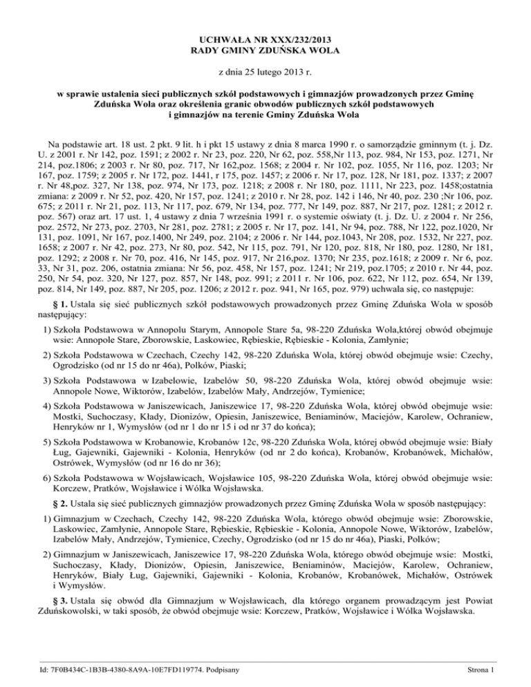 UCHWAŁA NR XXX/232/2013 RADY GMINY ZDUŃSKA WOLA z dnia 25 lutego 2013 r. w sprawie ustalenia sieci publicznych szkół podstawowych i gimnazjów prowadzonych przez Gminę Zduńska Wola oraz określenia granic obwodów publicznych szkół podstawowych i gimnazjów na terenie Gminy Zduńska Wola Na podstawie art. 18 ust. 2 pkt. 9 lit. h i pkt 15 ustawy z dnia 8 marca 1990 r. o samorządzie gminnym (t. j. Dz. U. z 2001 r. Nr 142, poz. 1591; z 2002 r. Nr 23, poz. 220, Nr 62, poz. 558,Nr 113, poz. 984, Nr 153, poz. 1271, Nr 214, poz.1806; z 2003 r. Nr 80, poz. 717, Nr 162,poz. 1568; z 2004 r. Nr 102, poz. 1055, Nr 116, poz. 1203; Nr 167, poz. 1759; z 2005 r. Nr 172, poz. 1441, r 175, poz. 1457; z 2006 r. Nr 17, poz. 128, Nr 181, poz. 1337; z 2007 r. Nr 48,poz. 327, Nr 138, poz. 974, Nr 173, poz. 1218; z 2008 r. Nr 180, poz. 1111, Nr 223, poz. 1458;ostatnia zmiana: z 2009 r. Nr 52, poz. 420, Nr 157, poz. 1241; z 2010 r. Nr 28, poz. 142 i 146, Nr 40, poz. 230 ;Nr 106, poz. 675; z 2011 r. Nr 21, poz. 113, Nr 117, poz. 679, Nr 134, poz. 777, Nr 149, poz. 887, Nr 217, poz. 1281; z 2012 r. poz. 567) oraz art. 17 ust. 1, 4 ustawy z dnia 7 września 1991 r. o systemie oświaty (t. j. Dz. U. z 2004 r. Nr 256, poz. 2572, Nr 273, poz. 2703, Nr 281, poz. 2781; z 2005 r. Nr 17, poz. 141, Nr 94, poz. 788, Nr 122, poz.1020, Nr 131, poz. 1091, Nr 167, poz.1400, Nr 249, poz. 2104; z 2006 r. Nr 144, poz.1043, Nr 208, poz. 1532, Nr 227, poz. 1658; z 2007 r. Nr 42, poz. 273, Nr 80, poz. 542, Nr 115, poz. 791, Nr 120, poz. 818, Nr 180, poz. 1280, Nr 181, poz. 1292; z 2008 r. Nr 70, poz. 416, Nr 145, poz. 917, Nr 216,poz. 1370; Nr 235, poz.1618; z 2009 r. Nr 6, poz. 33, Nr 31, poz. 206, ostatnia zmiana: Nr 56, poz. 458, Nr 157, poz. 1241; Nr 219, poz.1705; z 2010 r. Nr 44, poz. 250, Nr 54, poz. 320, Nr 127, poz. 857, Nr 148, poz. 991; z 2011 r. Nr 106, poz. 622, Nr 112, poz. 654, Nr 139, poz. 814, Nr 149, poz. 887, Nr 205, poz. 1206; z 2012 r. poz. 941, Nr 165, poz. 979) uchwala się, co następuje: § 1. Ustala się sieć publicznych szkół podstawowych prowadzonych przez Gminę Zduńska Wola w sposób następujący: 1) Szkoła Podstawowa w Annopolu Starym, Annopole Stare 5a, 98-220 Zduńska Wola,której obwód obejmuje wsie: Annopole Stare, Zborowskie, Laskowiec, Rębieskie, Rębieskie - Kolonia, Zamłynie; 2) Szkoła Podstawowa w Czechach, Czechy 142, 98-220 Zduńska Wola, której obwód obejmuje wsie: Czechy, Ogrodzisko (od nr 15 do nr 46a), Polków, Piaski; 3) Szkoła Podstawowa w Izabelowie, Izabelów 50, 98-220 Zduńska Wola, której obwód obejmuje wsie: Annopole Nowe, Wiktorów, Izabelów, Izabelów Mały, Andrzejów, Tymienice; 4) Szkoła Podstawowa w Janiszewicach, Janiszewice 17, 98-220 Zduńska Wola, której obwód obejmuje wsie: Mostki, Suchoczasy, Kłady, Dionizów, Opiesin, Janiszewice, Beniaminów, Maciejów, Karolew, Ochraniew, Henryków nr 1, Wymysłów (od nr 1 do nr 15 i od nr 37 do końca); 5) Szkoła Podstawowa w Krobanowie, Krobanów 12c, 98-220 Zduńska Wola, której obwód obejmuje wsie: Biały Ług, Gajewniki, Gajewniki - Kolonia, Henryków (od nr 2 do końca), Krobanów, Krobanówek, Michałów, Ostrówek, Wymysłów (od nr 16 do nr 36); 6) Szkoła Podstawowa w Wojsławicach, Wojsławice 105, 98-220 Zduńska Wola, której obwód obejmuje wsie: Korczew, Pratków, Wojsławice i Wólka Wojsławska. § 2. Ustala się sieć publicznych gimnazjów prowadzonych przez Gminę Zduńska Wola w sposób następujący: 1) Gimnazjum w Czechach, Czechy 142, 98-220 Zduńska Wola, którego obwód obejmuje wsie: Zborowskie, Laskowiec, Zamłynie, Annopole Stare, Rębieskie, Rębieskie - Kolonia, Annopole Nowe, Wiktorów, Izabelów, Izabelów Mały, Andrzejów, Tymienice, Czechy, Ogrodzisko (od nr 15 do nr 46a), Piaski, Polków; 2) Gimnazjum w Janiszewicach, Janiszewice 17, 98-220 Zduńska Wola, którego obwód obejmuje wsie: Mostki, Suchoczasy, Kłady, Dionizów, Opiesin, Janiszewice, Beniaminów, Maciejów, Karolew, Ochraniew, Henryków, Biały Ług, Gajewniki, Gajewniki - Kolonia, Krobanów, Krobanówek, Michałów, Ostrówek i Wymysłów. § 3. Ustala się obwód dla Gimnazjum w Wojsławicach, dla którego organem prowadzącym jest Powiat Zduńskowolski, w taki sposób, że obwód obejmuje wsie: Korczew, Pratków, Wojsławice i Wólka Wojsławska. ————————————————————————————————————————————————————————— Id: 7F0B434C-1B3B-4380-8A9A-10E7FD119774. Podpisany Strona 1 § 4. Traci moc uchwała nr 27/99 Rady Gminy Zduńska Wola z dnia 27 lutego 1999 roku w sprawie sieci publicznych szkół podstawowych oraz granic ich obwodów oraz uchwała nr 28/99 Rady Gminy Zduńska Wola z dnia 27 lutego 1999 roku w sprawie utworzenia publicznych gimnazjów prowadzonych przez gminę oraz określenia granic ich obwodów. § 5. Wykonanie uchwały powierza się Wójtowi Gminy Zduńska Wola. § 6. Uchwała podlega ogłoszeniu w Dzienniku Urzędowym Województwa Łódzkiego, na tablicy ogłoszeń w Urzędzie Gminy oraz na stronie internetowej Urzędu Gminy. § 7. Uchwała wchodzi w życie 14 dni po opublikowaniu w Dzienniku Urzędowym Województwa Łódzkiego, z mocą obowiązującą od 1 września 2013 roku. Przewodniczący Rady Gminy Janusz Sakiewa ————————————————————————————————————————————————————————— Id: 7F0B434C-1B3B-4380-8A9A-10E7FD119774. Podpisany Strona 2