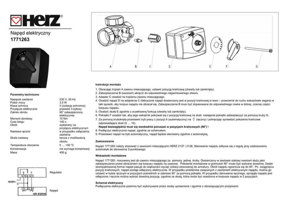 63_1 Napęd elektryczny 1771263 Instrukcja montażu Parametry techniczne Napięcie zasilania Pobór mocy Klasa ochrony Przyłącze elektryczne Zakres obrotu 230 V, 50 Hz 3,5 W II (izolacja ochronna) przewód 3-żyłowy 90o zabezpieczony elektrycznie 10 Nm 140 s wybierany na przyłączu elektrycznym w przypadku odłączenia zasilania tarcza z możliwością obrotu 0 … +50 oC nie wymaga konserwacji 400 g Moment obrotowy Czas biegu Obrót Nastawa ręczna Skala nastawy Temperatura otoczenia Konserwacja Masa 1. Obracając trzpień A zaworu mieszającego, ustawić pozycję krańcową (otwarty lub zamknięty). 2. Zabezpieczenie B (sworzeń) wkręcić do odpowiedniego nagwintowanego otworu. 3. Adapter C osadzić na trzpieniu zaworu mieszającego. 4. Osadzić napęd D na adapterze C (fabrycznie napęd dostarczony jest w pozycji krańcowej w lewo – przeciwnie do ruchu wskazówek zegara) w taki sposób, aby korpus napędu nie obracał się. Zabezpieczenie B musi być dopasowane do odpowiedniego rowka w dolnej, czarnej części korpusu napędu. 5. Osadzić skalę E zgodnie z oczekiwaną funkcją (otwarty lub zamknięty). 6. Pokrętło F osadzić tak, aby jego wskaźnik pokrywał się z pozycją krańcową na skali, następnie pokrętło zabezpieczyć za pomocą śruby G. 7. Za pomocą śrubokręta przestawić tryb pracy z pozycji A (automatyczny) na (ręczny) i pokręcając sprawdzić położenia krańcowe odpowiadające skali (0 … 10). Napęd bezwzględnie musi się swobodnie poruszać w pozycjach krańcowych (90o) ! 8. Podłączyć elektrycznie napęd, zgodnie ze schematem. 9. Przestawić napęd na tryb automatyczny, napęd będzie sterowany zgodnie z automatyką. Zastosowanie Napęd 1771263 należy stosować z zaworami mieszającymi HERZ 2137 i 2138. Sterowanie napędu odbywa się z reguły przy zastosowaniu automatyki do sterowania 3-punktowego. Wskazówki montażowe Regulator Napęd 1771263 mocowany jest do zaworu mieszającego za pomocą jednej śruby. Dostarczony w zestawie stalowy sworzeń służy jako zabezpieczenie przed obracaniem się korpusu napędu na zaworze. Położenie montażowe w granicach 90° może być wybrane dowolnie. Dzięki skompaktowanej formie napęd pasuje do większości wycięć izolacji stosowanej do armatury. Obrót napędu ogranicza się do 90°. Po osiągnięciu pozycji krańcowych, napęd zostaje odłączony elektrycznie. W przypadku problemów związanych z zasilaniem elektrycznym napędu, można go ustawić w trybie ręcznym w pozycjach pośrednich w zakresie 90° za pomocą pokrętła. W przypadku sterowania ręcznego, sprzęgło napędu jest odłączone i ręcznie można wybrać dowolną pozycję, zgodnie ze skalą, która może być osadzona w korpusie napędu w 2 pozycjach. Schemat elektryczny Podłączenie elektryczne powinno być wykonywane przez osoby uprawnione i zgodnie z obowiązującymi przepisami. Napęd