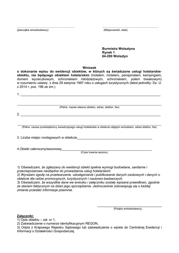 ……………………………………………. (pieczątka wnioskodawcy) …………………………………………… (Miejscowość, data) Burmistrz Wolsztyna Rynek 1 64-200 Wolsztyn Wniosek o dokonanie wpisu do ewidencji obiektów, w których są świadczone usługi hotelarskieobiektu, nie będącego obiektem hotelarskim (hotelem, motelem, pensjonatem, kempingiem, domem wycieczkowym, schroniskiem młodzieżowym, schroniskiem, polem biwakowym) w rozumieniu ustawy z dnia 29 sierpnia 1997 roku o usługach turystycznych (tekst jednolity: Dz. U. z 2014 r. poz. 196 ze zm.) 1. ____________________________________________________________________________ ________________________________________________________________________________________________ (Pełna nazwa własna obiektu, adres, telefon, fax) 2. ____________________________________________________________________________ ________________________________________________________________________________________________ (Pełna nazwa przedsiębiorcy świadczącego usługi hotelarskie w obiekcie objętym wnioskiem, adres telefon, fax) 3. Liczba miejsc noclegowych w obiekcie_________________________________________ 4.Obiekt całoroczny/sezonowy_________________________________________________ (Czas trwania sezonu) 1) Oświadczam, że zgłaszany do ewidencji obiekt spełnia wymogi budowlane, sanitarne i przeciwpożarowe niezbędne do prowadzenia usług hotelarskich. 2) Wyrażam zgodę na przetwarzanie, udostępnianie i publikowanie danych osobowych i danych o obiekcie dla celów promocyjnych, turystycznych i naukowo-badawczych. 3) Oświadczam, że wszystkie dane we wniosku i załączniku zostały wpisane prawidłowo, zgodnie ze stanem faktycznym na dzień jego sporządzenia. Jednocześnie zobowiązuję się o każdej zmianie przesłać informacje pisemnie. ___________________________________ (Podpis wnioskodawcy) Załączniki: 1) Opis obiektu – zał. nr 1, 2) Zaświadczenie o numerze identyfikacyjnym REGON, 3) Odpis z Krajowego Rejestru Sądowego lub zaświadczenie o wpisie do Centralnej Ewidencji i Informacji o Działalności Gospodarczej. Załącznik nr 1 – opis obiektu 1. Podstawowe dane o obiekcie: (Nazwa własna obiektu) (Adres, telefon, fax,) (Strona www, e-mail) 2. Położenie obiektu: Powiat__________________________________ Gmina___________________________________ Odległość od centrum Wolsztyna____________________________________/km/ Najbliższe jezioro(nazwa)_____________________________________, obiektu__________/m/ 3. Pokoje i miejsca noclegowe Wyszczególnienie Ilość pokoi z ogółem łazienką i WC odległość od Ilość miejsc noclegowych sezonowe ogółem całoroczne (czas trwania) Ogółem w tym w pokojach 1-os. w tym w pokojach 2-os w tym w pokojach 3-os. w tym w pokojach 4-os. w tym w pokojach ponad 4-os. apartamenty studio(2+2) w tym w domkach turystycznych miejsca na ustawienie namiotów i przyczep samochodowych miejsca w namiotach, przyczepach mieszkalnych i obiektach prowizorycznych 4. Wyposażenie w urządzenia sportowo-rekreacyjne Rodzaj urządzenia tak nie Rodzaj urządzenia siłownia basen kryty basen odkryty boisko do siatkówki lub koszykówki mini golf sauna tak nie tenis stołowy wypożyczalnia sprzętu pływającego wypożyczalnia rowerów pokój zabaw dla dzieci ścieżka zdrowia możliwość jazdy konnej 1 solarium bilard 5. Placówki gastronomiczne Rodzaje placówek gastronomicznych restauracja bar, kawiarnia stołówka punkt gastronomiczny kort tenisowy inne własne tak obce nie tak nie 6. Inne tak nie sala konferencyjna parking strzeżony parking niestrzeżony dostęp do internetu akceptacja zwierząt 7. Deklaracja dotycząca spełniania minimalnych wymagań co do wyposażenia dla innych obiektów, w których świadczone są usługi hotelarskie (zgodne z załącznikiem nr 7 do Rozporządzenia Ministra Gospodarki i Pracy w sprawie obiektów hotelarskich i innych obiektów, w których świadczone są usługi hotelarskie z dnia 19 sierpnia 2004 r.) Lp. Wymagania I. Dla wynajmowania miejsc na ustawienie namiotów i przyczep samochodowych 1 Teren obozowiska wyrównany, suchy, ukształtowany w sposób zapewniający odprowadzenie wód opadowych i uprzątnięty z przedmiotów mogących zagrażać bezpieczeństwu 2 Punkt poboru wody do picia1 i potrzeb gospodarczych 3 Miejsce wylewania nieczystości płynnych odpowiednio zabezpieczone i oznakowane 4 Pojemnik na śmieci i odpady stałe, regularnie opróżniany 5 Ustęp utrzymywany w czystości II. Dla wynajmowania miejsc w namiotach, przyczepach mieszkalnych, domkach turystycznych i obiektach prowizorycznych 6 Stanowiska dla namiotów i przyczep mieszkalnych oraz dojścia do stanowisk utwardzone 7 Oświetlenie dojść do stanowisk i obiektów higieniczno-sanitarnych 8 Półka lub stelaż na rzeczy osobiste 9 Oddzielne łóżka lub łóżka polowe dla każdego korzystającego z namiotu, w odległości nie mniejszej niż 30 cm pomiędzy łóżkami III. Dla wynajmowania miejsc i świadczenia usług w budynkach stałych 10 Ogrzewanie - w całym obiekcie w miesiącach X-IV, temperatura minimum 18 0C 11 Instalacja sanitarna: zimna woda przez całą dobę i dostęp do ciepłej wody2 12 Maksymalna liczba osób przypadających na jeden w.h.s. - 15 tak nie 2 13 Wyposażenie podstawowe w.h.s.: A) natrysk lub wanna B) umywalka z blatem lub półką i wieszakiem na ręcznik C) WC D) lustro z górnym lub bocznym oświetleniem E) uniwersalne gniazdko elektryczne z osłoną F) pojemnik na śmieci (niepalny lub trudno zapalny) G) dozownik do płynnego mydła i ręczniki papierowe IV. Dla wynajmowania miejsc noclegowych w pomieszczeniach wspólnych (salach) 14 Powierzchnia sal nie mniejsza niż 2,5 m2 - na jedną osobę (przy łóżkach piętrowych 1,5 m2) 15 Wyposażenie sal sypialnych A) łóżka jednoosobowe o wymiarach minimum 80×190 cm B) oddzielne zamykane szafki dla każdej osoby C) stół E) krzesła lub taborety (1 na osobę) lub ławy F) wieszaki na o