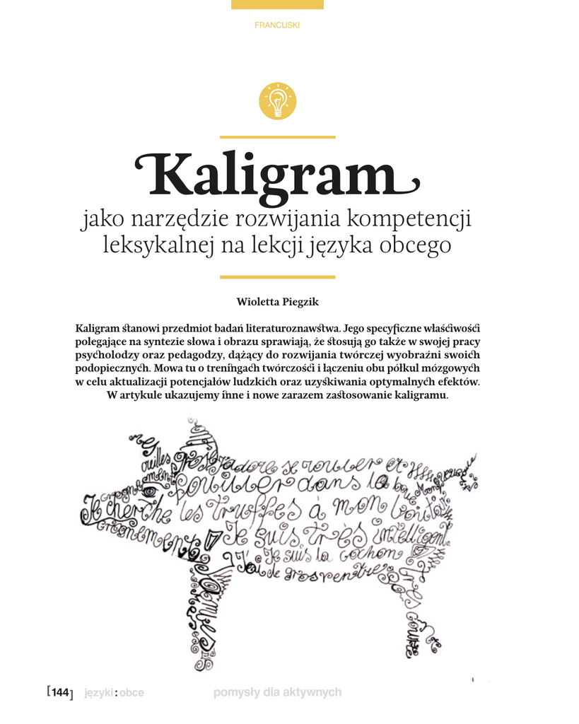 francuski Kaligram jako narzędzie rozwijania kompetencji leksykalnej na lekcji języka obcego Wioletta Piegzik Kaligram stanowi przedmiot badań literaturoznawstwa. Jego specyficzne właściwości polegające na syntezie słowa i obrazu sprawiają, że stosują go także w swojej pracy psycholodzy oraz pedagodzy, dążący do rozwijania twórczej wyobraźni swoich podopiecznych. Mowa tu o treningach twórczości i łączeniu obu półkul mózgowych w celu aktualizacji potencjałów ludzkich oraz uzyskiwania optymalnych efektów. W artykule ukazujemy inne i nowe zarazem zastosowanie kaligramu. [ 144 ] pomysły dla aktywnych francuski S łowo kaligram (gr. kallos – piękno, gramma – litera/napis) jest neologizmem zaproponowanym przez francuskiego poetę pierwszej połowy XX wieku Guillaume’a Apollinaire’a. Oznacza ono utwór poetycki, którego wersy tworzą charakterystyczny układ graficzny obrazujący treść utworu. W ten sposób opisywany przedmiot lub przedstawione informacje i emocje są dodatkowo wizualizowane, co pociąga za sobą nowe możliwości interpretacyjne oraz doznania artystyczne. Zerwanie z tradycyjnymi wersami w kaligramie ukazuje zatem inny potencjał słowa, które jednocześnie przekazuje sens i wizualizuje go. W artykule odwołujemy się do kaligramu i jego specyficznych właściwości, chcąc przedstawić jego wartość w nauczaniu/ uczeniu się języka obcego. Wykorzystanie kaligramu wiążemy z możliwością rozwijania kompetencji leksykalnej, a także kompetencji ogólnych uczącego się. Umożliwianie rozwijania kompetencji leksykalnych – stanowiących trzon kompetencji komunikacyjnych – uznajemy za jedno z głównych zadań dydaktyki obcojęzycznej. Natomiast rozwijanie kompetencji ogólnych traktujemy jako wartość dodaną, która sprzyja wszechstronnemu, a nie tylko językowemu rozwojowi uczących się. Koncepcję uczenia się języka obcego poprzez kaligram (ściślej poprzez budowanie kaligramów) opieramy zaś na naszym doświadczeniu nauczyciela. Dlaczego zatem ta forma pracy? Na jakim etapie zaawansowania językowego i według jakiej metodyki działania? Zbudowanie kaligramu wymaga pomysłu. Pomysł dotyczy wyboru tematu, słownictwa składającego się na ten temat, a także sposobu, w jaki zostanie on ostatecznie zaprezentowany. Budowanie pomysłów natomiast to tworzenie twórczych obrazów w polu świadomości. Nie są to obrazy naśladujące w większym lub mniejszym stopniu postrzeganą rzeczywistość, lecz niewidziane dotąd kombinacje różnych elementów, tworzących nową jakość, która służy nauce języka. Tak więc w budowanie kaligramu zaangażowana jest wyobraźnia twórcza, która wspomaga pamięć (dostarczając jej subiektywnych i tym samym łatwiejszych do trwałego zarejestrowania obrazów) i wymaga od osoby innego niż mechaniczne przetwarzanie informacji. Stworzenie kaligramu z użyciem znanych już oraz nowych słów oznacza zatem jednoczesne zaangażowanie wielu funkcji intelektualnych oraz możliwość głębokiego przetwarzania informacji. Konfrontując kognitywny potencjał kaligramu z większością klasycznych technik proponowanych w pracy nad obcojęzycznym słownictwem w dostępnych na rynku podręcznikach, można stwierdzić, że te drugie opierają się głównie na działaniach mechanicznych uczącego się. Mamy tutaj przede wszystkim na myśli ćwiczenia: asocjacyjne; z luką; typu prawda-fałsz; klasyfikujące słowa według określonych kategorii; oparte na poszukiwaniu synonimu lub antonimu; z intruzem i wiele innych (Piegzik 2007:53). Są one bez wątpienia przydatne, ponieważ wzmacniają ślad pamięciowy, na którym w znacznej mierze oparta jest pamięć, lecz z pewnością nie wymagają głębokiego przetwarzania informacji. Ich mechaniczny charakter sprowadza się zazwyczaj do szybkiego wyboru i zaznaczenia odpowiedzi. Wyszukanie synonimu lub antonimu na przykład wymaga jedynie przeszukania pamięci i w niewielkim stopniu zaangażowania uwagi. Zastosowanie kaligramu na lekcji języka obcego wspomaga rozwijanie umiejętności heurystycznych osoby uczącej się. O roli tych umiejętności w nauce języka wspomina Europejski system kształcenia językowego (2001/2003), definiując je jako umiejętności radzenia sobie z nowymi doświadczeniami obcojęzycznymi, wyszukiwania, rozumienia, a także przekazywania i poszukiwania nowych informacji (por. Rada Europy 2003:99). W skrócie są to umiejętności odkrywcze, służące praktycznemu rozwiązaniu określonego problemu. W omawianym kontekście uczenia się sam kaligram może być uznany jako pewien sposób/ metoda lub też narzędzie służące do rozwiązania problemu, jakim jest opanowanie określonego słownictwa, choć także za heurystykę można uznać użycie takiego sposobu myślenia zainspirowanego syntezą słowa i obrazu, która prowadzi do pożądanych efektów, czyli opanowania określonego materiału językowego. O ile heurystyki to drogi na skróty (Słysz 2007:23), to z pewnością są to drogi twórcze i zorientowane praktycznie, co zdecydowanie stanowi ich wyróżnik (Nęcka i in. 2005:13). Poniżej zamieszczamy wybrane kaligramy uczących się języka francuskiego, stanowiące ilustrację prezentowanych tez. Pierwsze dwa kaligramy zainspirowane są realizowaną na zajęciach tematyką związaną z przyrodą. Oba także nawiązują do fascynacji światem zwierząt. Poziom zaawansowania językowego obu proponowanych prac jest jednak pomysły dla aktywnych [ 145 ] francuski Kaligram 1., autorka: Magdalena Safiak Kaligram 2., autorka: Małgorzata Bajda Kaligram 3., autorka: Daria Wertelecka [ 146 ] zróżnicowany. O ile za pomocą pierwszego kaligramu autorka przyswaja sobie słownictwo z zakresu podstawowego, o tyle autorka drugiego kaligramu nawiązuje do specjalistycznego słownictwa i wykracza poza realizowany na zajęciach poziom podstawowy. Kaligram La danseuse (pol. tancerka) to osobiste przetworzenie/interpretacja słown