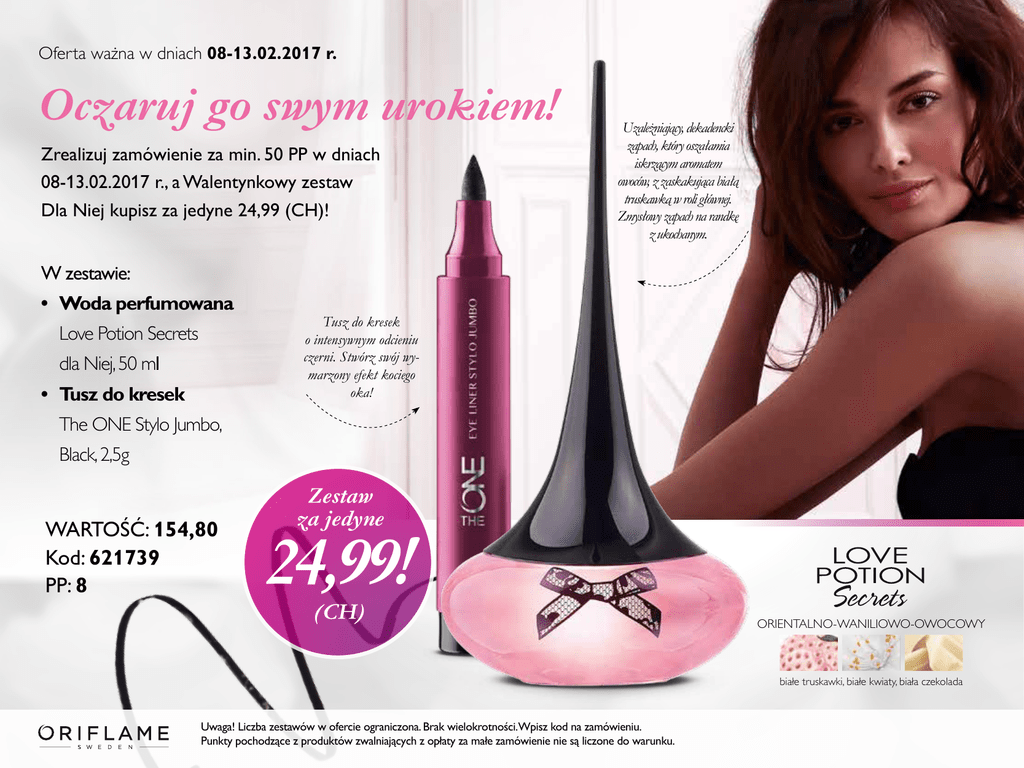 Oferta ważna w dniach 08-13.02.2017 r. Oczaruj go swym urokiem! Zrealizuj zamówienie za min. 50 PP w dniach 08-13.02.2017 r., a Walentynkowy zestaw Dla Niej kupisz za jedyne 24,99 (CH)! Uzależniający, dekadencki zapach, który oszałamia iskrzącym aromatem owoców, z zaskakująca białą truskawką w roli głównej. Zmysłowy zapach na randkę z ukochanym. W zestawie: • Woda perfumowana Love Potion Secrets dla Niej, 50 ml • Tusz do kresek Tusz do kresek o intensywnym odcieniu czerni. Stwórz swój wymarzony efekt kociego oka! The ONE Stylo Jumbo, Black, 2,5g WARTOŚĆ: 154,80 Kod: 621739 PP: 8 Zestaw za jedyne 24,99! (CH) ORIENTALNO-WANILIOWO-OWOCOWY białe truskawki, białe kwiaty, biała czekolada Uwaga! Liczba zestawów w ofercie ograniczona. Brak wielokrotności.Wpisz kod na zamówieniu. Punkty pochodzące z produktów zwalniających z opłaty za małe zamówienie nie są liczone do warunku.