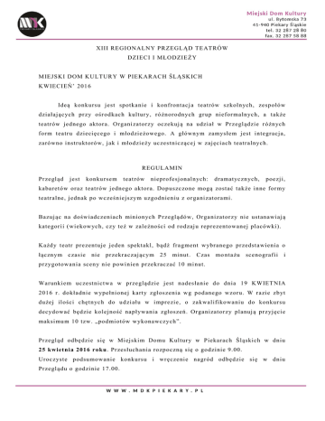 XIII REGIONALNY PRZEGLĄD TEATRÓW DZIECI I MŁODZIEŻY MIEJSK I DOM KULTURY W PIEK ARACH ŚLĄSK ICH KWIECIEŃ’ 201 6 Ideą konkursu j est spotkanie i konfrontacj a teatrów szkolnych, zespołów działaj ących pr zy ośr odkach kultur y, różnorodnych gr up niefor malnych, a także teatrów j ednego aktor a. Or gani zatorzy oczekuj ą na udział w Pr zeglądzie różnych for m teatru dziecięcego i młodzieżowego. A głównym zamysłem j est integracj a, zarówno instruktorów, j ak i młodzieży uczestniczącej w zaj ęciach teatralnych. REGULAMIN Przegląd j est konkursem teatrów nieprofesj onalnych: dramatycznych, poezj i, kabaretów oraz teatrów j ednego aktora. Dopuszczone mogą zostać także inne for my teatralne, j ednak po wcześniej szym uzgodnieniu z or gani zatorami. Bazuj ąc na doświadczeniach minionych P r zeglądów, Or ganizator zy nie ustanawiaj ą kategorii (wiekowych, czy też w zależności od rodzaj u reprezentowanej placówki). Każdy teatr prezentuj e j eden spektakl, bądź fragment wybranego przedstawienia o łącznym czasie nie przekraczaj ącym 25 minut. Czas mo ntażu scenografii i przygotowania sceny nie powinien pr zekraczać 10 mi nut. Warunkiem uczestnictwa w pr zeglądzie j est nadesłanie do dnia 19 KWIETNIA 2016 r. dokładnie wypełnionej karty zgł oszenia wg podanego wzoru. W razie zbyt dużej ilości chętnych do u działu w i mprezie, o zakwalifikowaniu do konkursu decydować będzie kol ej ność napływania zgł oszeń. Or ganizator zy planuj ą przyj ęcie maksi mum 10 t zw. „podmiotów wykonawczych”. Przegląd odbędzie się w Miej ski m Domu Kultury w Piekarach Śląskich w dniu 25 kw ietnia 2016 roku. Pr zesłuchania rozpoczną się o godzinie 9.00. Uroczyste podsumowanie konkursu i wręczenie nagród odbędzie się w dniu Przeglądu o godzinie 17.00. Or gani zatorzy zastr zegaj ą sobie prawo do ustalenia kolej ności prezentacj i. Or gani zatorzy zapewniaj ą oświetlenie oraz nagłośnienie sceny w ramach spr zętu będącego na wyposażeniu MDK. Oceny dokona powołane pr zez or gani zatora niezależne j ury. Od werdyktu nie przysługuj e odwołanie. Jury będzie brało pod uwagę dobór r epertuaru, ogólny wyraz artyst yczny i sceniczny, inscenizacj ę, reżyserię, muzykę, choreografię oraz wykonanie: kulturę słowa, gest, or yginalność pomysłu. Przewidywane są następuj ące nagrody pieniężne (pula nagr ód będzie wynosiła 2 000 zł): - dla zespołów - dla reżyser ów - aktorów O pokr ycie kosztów udziału w i mprezi e prosimy zwracać się do instytucj i deleguj ących. Karta zgłoszeniowa do pobrania na stronie w ww.mdkpiekary.pl Zgłoszenia należy nadsyłać pocztą tradycyj na, elektroniczna, bądź faxem na zami eszczone poni żej ad resy biura or gani zacyj nego: Miejski Dom Kultury ul. Bytomska 73 41-945 Piekary Śląskie e-mail: [email protected] fax: 32/288 58 80