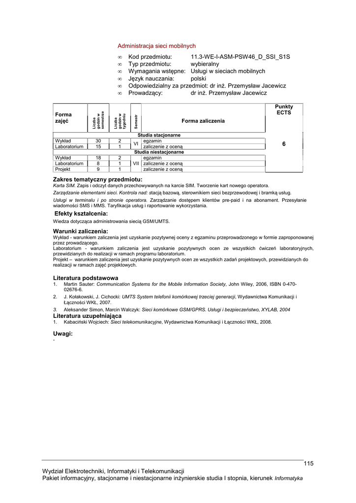 Administracja sieci mobilnych Liczba godzin w tygodniu Wykład Laboratorium 30 15 2 1 Wykład Laboratorium Projekt 18 8 9 2 1 1 Forma zajęć Kod przedmiotu: 11.3-WE-I-ASM-PSW46_D_SSI_S1S Typ przedmiotu: wybieralny Wymagania wstępne: Usługi w sieciach mobilnych Język nauczania: polski Odpowiedzialny za przedmiot: dr inż. Przemysław Jacewicz Prowadzący: dr inż. Przemysław Jacewicz Semestr Liczba godzin w semestrze • • • • • • Punkty ECTS Forma zaliczenia Studia stacjonarne egzamin zaliczenie z oceną Studia niestacjonarne egzamin VII zaliczenie z oceną zaliczenie z oceną VI 6 Zakres tematyczny przedmiotu: Karta SIM. Zapis i odczyt danych przechowywanych na karcie SIM. Tworzenie kart nowego operatora. Zarządzanie elementami sieci. Kontrola nad: stacją bazową, sterownikiem sieci bezprzewodowej i bramką usług. Usługi w terminalu i po stronie operatora. Zarządzanie dostępem klientów pre-paid i na abonament. Przesyłanie wiadomości SMS i MMS. Taryfikacja usług i raportowanie wykorzystania. Efekty kształcenia: Wiedza dotycząca administrowania siecią GSM/UMTS. Warunki zaliczenia: Wykład - warunkiem zaliczenia jest uzyskanie pozytywnej oceny z egzaminu przeprowadzonego w formie zaproponowanej przez prowadzącego. Laboratorium - warunkiem zaliczenia jest uzyskanie pozytywnych ocen ze wszystkich ćwiczeń laboratoryjnych, przewidzianych do realizacji w ramach programu laboratorium. Projekt – warunkiem zaliczenia jest uzyskanie pozytywnych ocen ze wszystkich zadań projektowych, przewidzianych do realizacji w ramach zajęć projektowych. Literatura podstawowa 1. Martin Sauter: Communication Systems for the Mobile Information Society, John Wiley, 2006, ISBN 0-47002676-6. 2. J. Kołakowski, J. Cichocki: UMTS System telefonii komórkowej trzeciej generacji, Wydawnictwa Komunikacji i Łączności WKŁ, 2007. 3. Aleksander Simon, Marcin Walczyk: Sieci komórkowe GSM/GPRS. Usługi i bezpieczeństwo, XYLAB, 2004 Literatura uzupełniająca 1. Kabaciński Wojciech: Sieci telekomunikacyjne, Wydawnictwa Komunikacji i Łączności WKŁ, 2008. Uwagi: - 115 Wydział Elektrotechniki, Informatyki i Telekomunikacji Pakiet informacyjny, stacjonarne i niestacjonarne inżynierskie studia I stopnia, kierunek Informatyka