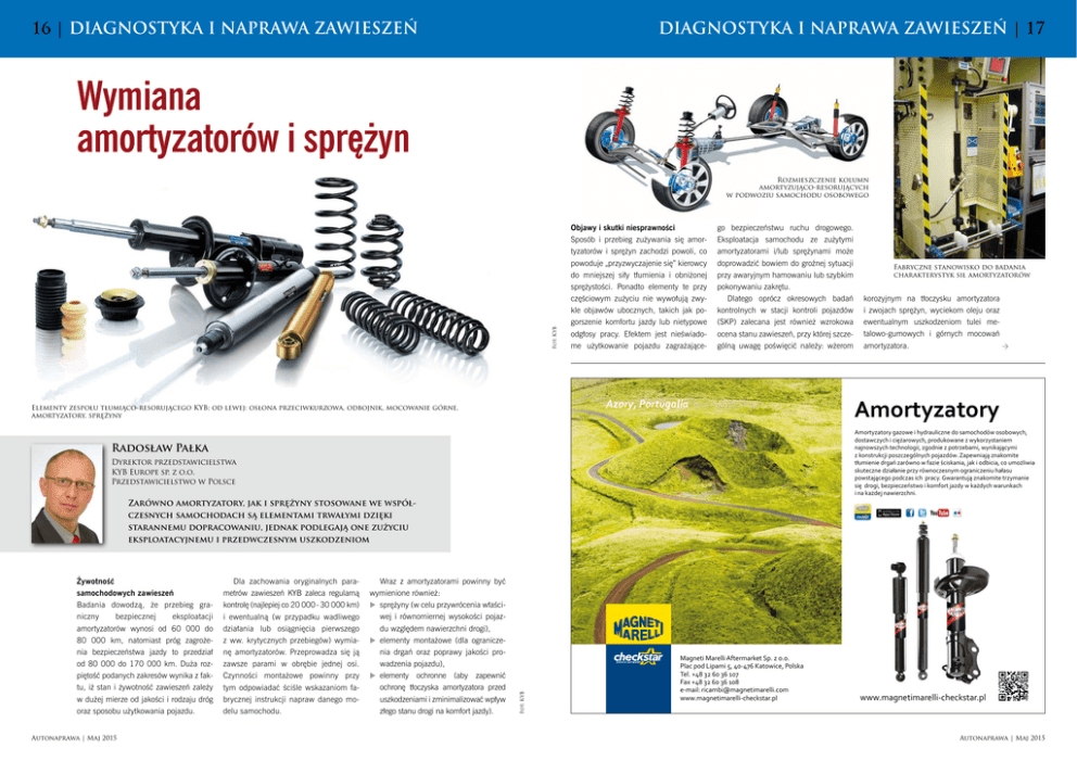 16 | DIAGNOSTYKA I NAPRAWA ZAWIESZEŃ DIAGNOSTYKA I NAPRAWA ZAWIESZEŃ | 17 Wymiana amortyzatorów i sprężyn Fot. KYB Rozmieszczenie kolumn amortyzująco-resorujących w podwoziu samochodu osobowego Objawy i skutki niesprawności Sposób i przebieg zużywania się amortyzatorów i sprężyn zachodzi powoli, co powoduje „przyzwyczajenie się” kierowcy do mniejszej siły tłumienia i obniżonej sprężystości. Ponadto elementy te przy częściowym zużyciu nie wywołują zwykle objawów ubocznych, takich jak pogorszenie komfortu jazdy lub nietypowe odgłosy pracy. Efektem jest nieświadome użytkowanie pojazdu zagrażające- go bezpieczeństwu ruchu drogowego. Eksploatacja samochodu ze zużytymi amortyzatorami i/lub sprężynami może doprowadzić bowiem do groźnej sytuacji przy awaryjnym hamowaniu lub szybkim pokonywaniu zakrętu. Dlatego oprócz okresowych badań kontrolnych w stacji kontroli pojazdów (SKP) zalecana jest również wzrokowa ocena stanu zawieszeń, przy której szczególną uwagę poświęcić należy: wżerom Azory, Portugalia Elementy zespołu tłumiąco-resorującego KYB; od lewej: osłona przeciwkurzowa, odbojnik, mocowanie górne, amortyzatory, sprężyny Fabryczne stanowisko do badania charakterystyk sił amortyzatorów korozyjnym na tłoczysku amortyzatora i zwojach sprężyn, wyciekom oleju oraz ewentualnym uszkodzeniom tulei metalowo-gumowych i górnych mocowań amortyzatora. Amortyzatory Amortyzatory gazowe i hydrauliczne do samochodów osobowych, dostawczych i ciężarowych, produkowane z wykorzystaniem najnowszych technologii, zgodnie z potrzebami, wynikającymi z konstrukcji poszczególnych pojazdów. Zapewniają znakomite tłumienie drgań zarówno w fazie ściskania, jak i odbicia, co umożliwia skuteczne działanie przy równoczesnym ograniczeniu hałasu powstającego podczas ich pracy. Gwarantują znakomite trzymanie się drogi, bezpieczeństwo i komfort jazdy w każdych warunkach i na każdej nawierzchni. Radosław Pałka Dyrektor przedstawicielstwa KYB Europe sp. z o.o. Przedstawicielstwo w Polsce Żywotność samochodowych zawieszeń Badania dowodzą, że przebieg graniczny bezpiecznej eksploatacji amortyzatorów wynosi od 60 000 do 80 000 km, natomiast próg zagrożenia bezpieczeństwa jazdy to przedział od 80 000 do 170 000 km. Duża rozpiętość podanych zakresów wynika z faktu, iż stan i żywotność zawieszeń zależy w dużej mierze od jakości i rodzaju dróg oraz sposobu użytkowania pojazdu. Autonaprawa | Maj 2015 Dla zachowania oryginalnych parametrów zawieszeń KYB zaleca regularną kontrolę (najlepiej co 20 000 - 30 000 km) i ewentualną (w przypadku wadliwego działania lub osiągnięcia pierwszego z ww. krytycznych przebiegów) wymianę amortyzatorów. Przeprowadza się ją zawsze parami w obrębie jednej osi. Czynności montażowe powinny przy tym odpowiadać ściśle wskazaniom fabrycznej instrukcji napraw danego modelu samochodu. Wraz z amortyzatorami powinny być wymienione również: sprężyny (w celu przywrócenia właściwej i równomiernej wysokości pojazdu względem nawierzchni drogi), elementy montażowe (dla ograniczenia drgań oraz poprawy jakości prowadzenia pojazdu), elementy ochronne (aby zapewnić ochronę tłoczyska amortyzatora przed uszkodzeniami i zminimalizować wpływ złego stanu drogi na komfort jazdy). Fot. KYB Zarówno amortyzatory, jak i sprężyny stosowane we współ czesnych samochodach są elementami trwałymi dzięki starannemu dopracowaniu, jednak podlegają one zużyciu eksploatacyjnemu i przedwczesnym uszkodzeniom Magneti Marelli Aftermarket Sp. z o.o. Plac pod Lipami 5, 40-476 Katowice, Polska Tel. +48 32 60 36 107 Fax +48 32 60 36 108 e-mail: [email protected] www.magnetimarelli-checkstar.pl www.magnetimarelli-checkstar.pl Autonaprawa | Maj 2015