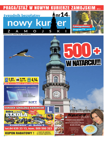 PRACA/STAŻ W NOWYM KURIERZE ZAMOJSKIM str. 6 nr14 (34) Całotygodniowy Program TV str. 10 Piątek 8 IV 2016 r. Nakład 10 000 ISSN 2450-5579 reklama reklama 5W N0ATA0RCIU+!!! reklama reklama 2 reklama Ważne telefony Urząd Skarbowy 84 677 63 00 Powiatowy Urząd Pracy 84 638 33 31 Urząd Celny 84 748 48 82 Urząd Miasta 84 639 20 84 Urząd Gminy 84 639 29 59 ZUS 84 639 60 95 Kino Stylowy 84 639 23 13 Galeria Twierdza 84 530 05 01 Starostwo Powiatowe 84 530 09 00 Urząd Stanu Cywilnego 84 639 33 29 Prokuratura Rejonowa 84 677 12 56 Książnica Zamojska 84 638 58 72 Szpital Wojewódzki 84 677 33 33 Zamojski Szpital Niepubliczny 84 677 50 00 Sąd Rejonowy 84 639 29 77 Ogród zoologiczny 84 639 34 79 Apteka 24H 84 677 32 24 Komenda Miejska Policji 84 677 14 17 84 677 14 62 Telefony alarmowe Pogotowie 999 Straż Pożarna 998 Policja 997 Pogotowie Wodno -Kanalizacyjne 994 Pogotowie ciepłownicze 993 Pogotowie gazowe 992 Taksówka 1-94-55 Pogotowie energetyczne 991 Straż Miejska 968 Pomoc drogowa 981 reklama 3 MÓJ ZAMOŚĆ – STANISŁAWA ORŁOWSKIEGO Na koniec marca przydarzył mi się sentymentalny wieczór wspomnień. Za oknem siąpił wiosenny kapuśniaczek, a ja wędrowałem sobie uliczkami Zamościa siedząc w Fortecznym Centrum Informacji Turystycznej i Historycznej czyli popularnej Lunecie. Wprawdzie al- ZAMOJSKA KARTA TURYSTY Serdecznie zapraszamy wszystkie hotele, restauracje oraz organizatorów atrakcji turystycznych z Zamościa do współtworzenia oferty turystycznej miasta w ramach ZAMOJSKIEJ KARTY TURYSTY. W związku ze zbliżającym się sezonem turystycznym, Zamojskie Centrum Informacji Turystycznej i Historycznej w Zamościu wraz z Muzeum Zamojskim, Ogrodem Zoologicz- bum Stanisława Orłowskiego „Mój Zamość” obejmując lata 1960-1980 tylko nieśmiało zahacza o mój życiorys, nie mniej pamiętam tamto miasto, tamtych ludzi i klimat. Tu biło serce miasta – obecnie po wielu unijnych operacjach bije ono z większą intensywnością – ale chirurdzy wycięli z niego duszę. Moje wspomnienia z tamtego Zamościa są wyjątkowo żywe. Pamiętam kolejki po mięso i ludzi stojących przez pół miasta – niekiedy tylko po to, żeby poplotkować. Do sklepiku u pani Zofii Malinowskiej przychodziłem i w kolejce po lody od Ładyńskiego przy Żeromskiego 6 też stałem. Pan Stanisław Orłowski jest niezwykle serdecznym człowiekiem – muszę tu koniecznie wspomnieć, że pełnił funkcję jurora w organizowanym przez Gminę Łabunie konkursie fotograficznym. Cieszę się, że powstał ten album, bo Zamość Orłowskiego jest też trochę moim Zamościem. W obecnym, co również zauważył autor zdjęć, ludzie gdzieś się pochowali. Cywilizacyjny postęp zatrzymał znaczną część z nas w domu, po wodę do studni się już nie idzie, w kolejkach nie stoi, a z sąsiadką prędzej na Facebooku się poklika niż na ławeczce usiądzie porozmawiać. nym oraz Zakładem Gospodarki Lokalowej zarządzającym Trasą Podziemną Bastion VIINadszaniec, planuje ponowne wprowadzenie do oferty turystycznej miasta Zamojskiej Karty Turysty, będącej systemem rabatów umożliwiających turystom tańsze zwiedzanie obiektów muzealnych i atrakcji turystycznych oraz zniżek na usługi noclegowe i gastronomiczne. Celem wprowadzenia Karty jest również zainteresowanie odwiedzających Zamość jak największą liczbą miejsc atrakcyjnych, a przede wszystkim wydłużenie ich pobytu w Zamościu lub – jeśli nocują np. na Roztoczu – do ponownego odwiedzenia miasta. korzystać bezpłatnie, Album z autografem wzmocnił rangę półki książek naznaczonych ręką autora. W drodze powrotnej na krajowej 17, wzdłuż stawów Haś, asfalt ruszał się od rozjechanych żab. Jaka szkoda – pomyślałem – że Pan Stanisław nie chodzi teraz do szkoły, jaka szkoda, że profesor Stefan Miler już ich nie potrzebuje - na mapie zamieszczone będą fotografie partnerów ZKT, - data ważności - 3 dni, - piktogramy (wyrywane) poszczególnych atrakcji turystycznych, - wykaz partnerów biorących udział w programie (hotele, restauracje, atrakcje). ZKT jest biletem wstępu do: - Muzeum Zamojskiego, - Zespołu Muzeum Fortyfikacji i Broni „Arsenał” (Arsenał + Prochownia + Pawilon w kurtynie), - Galerii Rzeźby prof. Koniecznego, - plan Starego Miasta z zarysem fortyfikacji twierdzy i ZOO oraz możliwości dojścia i dojazdu ze Starego Miasta, - na taras widokowy na Nadszańcu, - Trasy Podziemnej Bastion VII – Nadszaniec, - Trasy Podziemnej Oficyn Ratusza, - Ogrodu Zoologicznego, ZAMOJSKA MAJÓWKA 2016! WESPRZYJ PRODUKCJĘ FILMU „WOŁYŃ” Zamojski Magistrat zdradził pierwsze informacje na temat Zamojskiej Majówki 2016! Muzyczną gwiazdą będzie m.in. Rafał Brzozowski, a w programie przewidziano również galę walk MMA, bieg wokół Twierdzy, koncerty zespołów oraz inne atrakcje. 30 kwietnia 2016 r. na Rynku Wielkim odbędzie się: Taneczna Gala– koncert z okazji Międzyna- Wojciech Smarzowski będzie gościem spotkania, którego celem jest zbiórka pieniędzy na dokończenie realizacji filmu „Wołyń”. To pierwsza w polskim kinie próba opowiedzenia przemilczanego w historii tematu o ludobójstwie Polaków na Kresach Wschodnich. Spotkanie odbędzie się w niedzielę, 1 maja br. o godz. 17:00 w Centrum Kultury Filmowej „Stylowy” w Zamościu. W programie m.in.: projekcja filmu „Róża”, licytacja fotosów z filmu „Wołyń” oraz pokaz zmontowanych fragmentów powstającego dzieła. Na spotkanie nie obowiązuje rezerwacja miejsc. Wchodząc na salę będzie można nabyć wejściówkę cegiełkę. Cały dochód z wydarzenia zostanie przeznaczony na rzecz filmu „Wołyń”. Organizatorami wydarzenia są: Centrum Kultury Filmowej „Stylowy” w Zamościu, Fundacja na Rzecz Filmu „Wołyń” oraz Stowarzyszenie Integracji Transgranicznej „Łączy nas Bug”. O swoim projekcie filmowym reżyser mówi: „Zabito ich dwa razy – raz siekierami, drugi skazując na lata ni