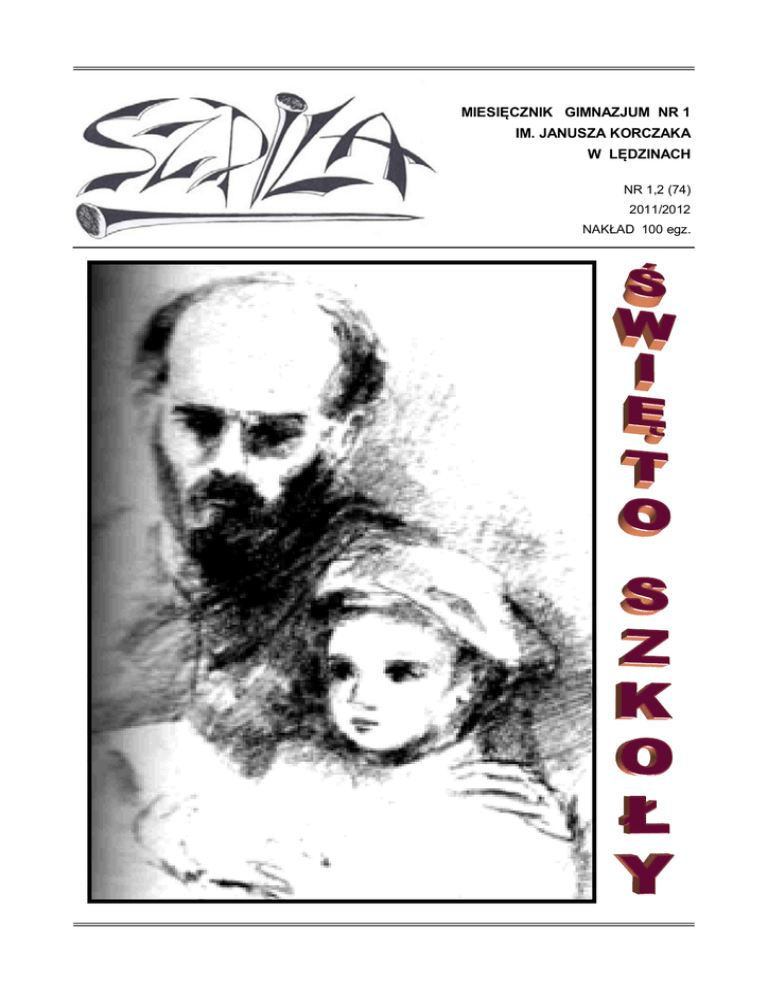 MIESIĘCZNIK GIMNAZJUM NR 1 IM. JANUSZA KORCZAKA W LĘDZINACH NR 1,2 (74) 2011/2012 NAKŁAD 100 egz. OD NACZELNEJ... Drodzy uczniowie! Wraz z rozpoczętym rokiem szkolnym w naszej „Szpili” trochę się pozmieniało. Po pierwsze, zyskaliśmy nowych oryginalnych dziennikarzy, którzy zawitali do nas z innowacyjnymi pomysłami, a to przecież w prawdziwym dziennikarstwie liczy się podwójnie. Jednakże najbardziej rzucającą się w oczy zmianą jest powrót do wersji papierowej naszej gazety. - Internetowej prawie nikt nie czytał !!! Dlatego nasze szanowne grono redaktorów uznało, że papierowy come back będzie najwłaściwszą decyzją. Trzeba przecież jakoś utrzymać się na rynku, bo konkurencja nie śpi. Jako redaktor naczelna postaram się nie zawieść czytelników i dołożę wszelkich starań, by każda kolejna odsłona gazety była bardziej zaskakująca i niepowtarzalna.. Już w tym wydaniu będziecie mogli powspominać, między innymi zmagania pierwszaków podczas chrztu, przypomnimy Wam również szkolne wybory do Rady Młodzieży i - co najważniejsze - uchylimy rąbka tajemnicy co do planów szanownej Rady na najbliższy rok. Dowiecie się też, że oprócz Święta Szkoły „Szpila” świętuje swój mały jubileusz. Powiemy skromnie - mamy 10 lat!!! Z tej okazji przygotowaliśmy kilka niespodzianek. Życzę wszystkim naszym wiernym Czytelnikom miłej lektury. Monia W NUMERZE... Nowo wybrana Nasz Patron W Rada Młodzieży Z okazji Jak ten czas końcu już działa!!! Święta Szkoły szybko leci - jesteście z nami, O jej planach zorganizowano już 10 lat, czyli o tym i nie tylko…. wiele konkursów 120 miesięcy, jak pierwszoklasiści na kolejnych m. in. konkurs 3 652 dni przechodzili stronach literacki. jesteśmy na drugą stronę gazety. Jego wyniki z Wami … mocy. Zaś na ostatniej na następnych stronach. wyniki konkursu!!! s. 5 s. 6 i 7 s. 8, 9 ,10 s. 3 i 4 Motto numeru: „Gdy jest bardzo smutno, to kocha się zachody słońca”. Antoine de Saint - Exupere 2 KONKURS LITERACKI O KORCZAKU Niebieskie oczy dziecka, Gasną w gazowej komorze Nawet ty lekarzu dziecięcych dusz, Już im teraz nie pomożesz. Widziałem ich wszystkich, Szli równo w pochodzie, A strachu z ich oczu, Nie spotkasz na co dzień. W tegorocznym konkursie literackim zdecydowanie dominowały utwory wierszowane, ale nie zabrakło też prozy. 1 miejsce - Bartłomiej Kozłowski kl. 3a 2 miejsce - Karina Czaja kl. 2b 3 miejsce - Barbara Janota kl. 2b Jury przyznało też kilka wyróżnień dla Pawła Zająca, Natalii Szymura, Moniki Sobos i Teresy Kloska. Widziałem to z boku, Lecz balem się podejść, Wiedziałem, że zgasną, Ach ocal ich Boże. Jeden duch niezłamany, Jak ojciec był dla nich, Mógł ocalić swe życie, Lecz ich łzy ocalił. Bartłomiej Kozłowski kl. 3A 1 nagroda „Wspomnienia dzieci” Zbawco, pomocniku nasz, ty wspierałeś nas w chwilach które były smutne, trudne, bez nadziei o lepsze jutro. Pocieszycielu, przyjacielu nasz, ty byłeś przy nas w miejscach które były ubogie, straszne, przerażały nas bez końca. „Zwykły bohater” Ty mówiłeś: „Nie deptać, nie Biegnę z rozczochranymi włosami, poniewierać, nie oddawać w niewolę a w głowie mam tyle marzeń, planów i snów. jutra…”. Ukazałeś prawo dziecka do szacunku, które sam przestrzegałeś. Nie chcę lękać się huraganów, grzmotów i burz. Umieć jak niedawni bohaterowie patrzeć w przyszłość, nawet złą bez lęku. Chcę każdą chwilą łapać co i uczynić z niej kawał historii. Mimo, że tak trudno bohaterem być - Teraz jesteśmy dorośli, lecz w naszej pamięci utkwiłeś ty i nigdy o tobie nie zapomnimy. Nasza wdzięczność nie zna granic. chcę nim być. Bohaterem własnego życia. Natalia Szymura kl. 1B – wyróżnienie Paweł Zając kl. 1B – wyróżnienie 3 W moim wypracowaniu pt. „Moja podróż w czasy Janusza Korczaka” chciałabym wcielić się w rolę Antosi, która zapisywała w swoim dzienniku wstrząsające wydarzenia. 3sierpnia 1942 Jestem zrozpaczona, ten dzień zostanie w mojej pamięci do końca życia. Siedząc w swoim pokoju usłyszałam przeraźliwy krzyk matki, a w chwilę po tym dwa strzały. Wyczuwając zagrożenie schowałam się do szafy, a gdy odgłosy obcych mężczyzn ucichły, skradając się podążyłam w kierunku kuchni. Na środku leżały zakrwawione ciała moich rodziców. Zaczęłam przeraźliwie krzyczeć i płakać, zanim się obejrzałam stała tuż obok mnie sąsiadka Janina, przyjaciółka mamy. Szybko wzięła mnie do siebie. Zamknęłam się w sobie, sąsiadka próbowała ze mną rozmawiać, ale ja po prostu nie mogłam otrząsnąć się z tego wszystkiego, przeraźliwie płakałam, a pani Janina próbując mnie uspokoić przytulała mnie. 4 sierpnia 1942 Gdy tylko wstałam pani Janina ze łzami w oczach powiedziała, że nie będzie mogła się mną dłużej zająć i zawiezie mnie do sympatycznego miejsca, gdzie poznam na pewno wielu przyjaciół. Dojechałyśmy na miejsce, w drzwiach miło powitał mnie dyrektor sierocińca, Janusz Korczak. Próbował nawiązać ze mną rozmowę, lecz nie miałam ochoty się do nikogo odzywać, było mi to w tej chwili obojętne. Pani Janina pożegnała się i obiecała, że będzie mnie codziennie odwiedzać. Dyrektor wskazał mi miejsce gdzie miałam spać oraz podarował mi dwie sukienki, ponieważ nie miałam własnych ubrań. Zaprowadził mnie do pokoju, który był pełen dzieci i przedstawił im mnie. Wesołe dzieci od razu podbiegły do mnie i chciały się bawić, lecz ja uciekłam. 5 sierpnia 1942 Była to moja pierwsza noc w obcym miejscu, całą przepłakałam. Helenka, która była obok, słysząc to wskoczyła do mojego łóżka i mocno przytuliła mnie. Zrobiło mi się o wiele lepiej. To właśnie Helenka była pierwszą osobą, przy której się otworzyłam. Opowiedziałam jej o tym co wydarzyło się w moim domu. Spędziłyśmy tę noc wspólnie opowiadając sobie wszystko i