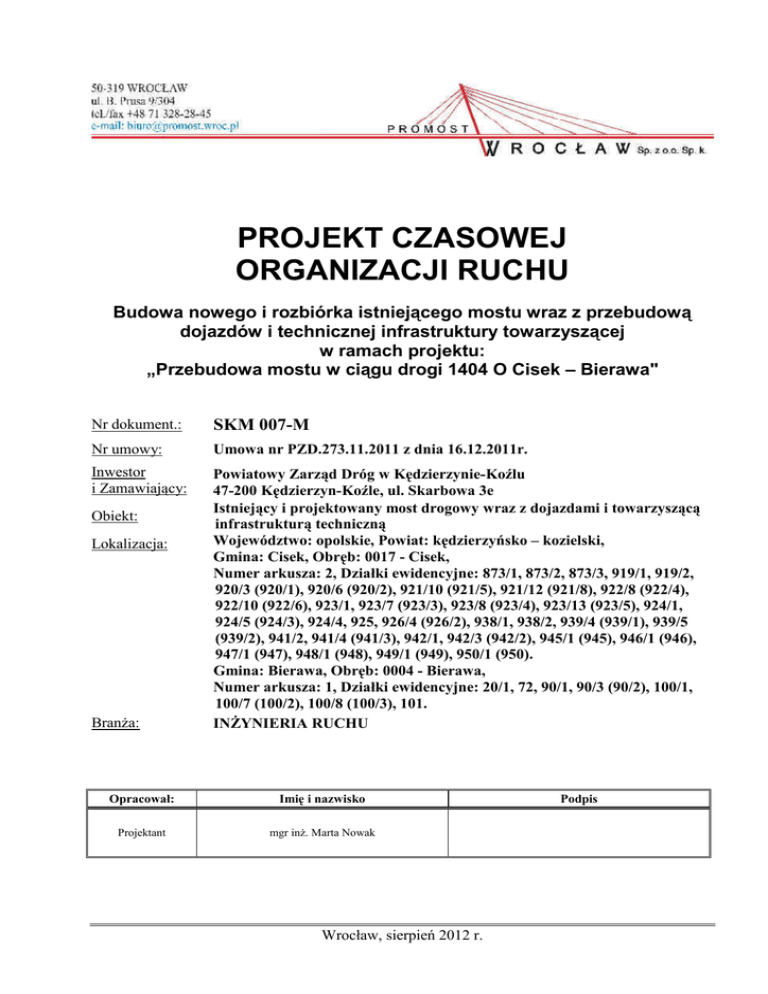 PROJEKT CZASOWEJ ORGANIZACJI RUCHU Budowa nowego i rozbiórka istniejącego mostu wraz z przebudową dojazdów i technicznej infrastruktury towarzyszącej w ramach projektu: „Przebudowa mostu w ciągu drogi 1404 O Cisek – Bierawa" Nr dokument.: SKM 007-M Nr umowy: Umowa nr PZD.273.11.2011 z dnia 16.12.2011r. Inwestor i Zamawiający: Powiatowy Zarząd Dróg w Kędzierzynie-Koźlu 47-200 Kędzierzyn-Koźle, ul. Skarbowa 3e Istniejący i projektowany most drogowy wraz z dojazdami i towarzyszącą infrastrukturą techniczną Województwo: opolskie, Powiat: kędzierzyńsko – kozielski, Gmina: Cisek, Obręb: 0017 - Cisek, Numer arkusza: 2, Działki ewidencyjne: 873/1, 873/2, 873/3, 919/1, 919/2, 920/3 (920/1), 920/6 (920/2), 921/10 (921/5), 921/12 (921/8), 922/8 (922/4), 922/10 (922/6), 923/1, 923/7 (923/3), 923/8 (923/4), 923/13 (923/5), 924/1, 924/5 (924/3), 924/4, 925, 926/4 (926/2), 938/1, 938/2, 939/4 (939/1), 939/5 (939/2), 941/2, 941/4 (941/3), 942/1, 942/3 (942/2), 945/1 (945), 946/1 (946), 947/1 (947), 948/1 (948), 949/1 (949), 950/1 (950). Gmina: Bierawa, Obręb: 0004 - Bierawa, Numer arkusza: 1, Działki ewidencyjne: 20/1, 72, 90/1, 90/3 (90/2), 100/1, 100/7 (100/2), 100/8 (100/3), 101. INŻYNIERIA RUCHU Obiekt: Lokalizacja: Branża: Opracował: Imię i nazwisko Projektant mgr inż. Marta Nowak Wrocław, sierpień 2012 r. Podpis strona 2 PROJEKT CZASOWEJ ORGANIZACJI RUCHU Budowa nowego i rozbiórka istniejącego mostu wraz z przebudową dojazdów i technicznej infrastruktury towarzyszącej w ramach projektu: „Przebudowa mostu w ciągu drogi 1404 O Cisek – Bierawa". SPIS TREŚCI 1 KARTY UZGODNIEŃ ....................................................................................................................................... 3 2 OPIS TECHNICZNY .......................................................................................................................................... 9 2.1 PODSTAWA OPRACOWANIA ................................................................................................................................. 9 2.2 PODSTAWY PRAWNE DO PROJEKTOWANIA .......................................................................................................... 9 2.3 PRZEDMIOT OPRACOWANIA ................................................................................................................................ 9 2.4 STAN ISTNIEJĄCY I ISTNIEJĄCA ORGANIZACJA RUCHU ...................................................................................... 10 2.5 STAN PROJEKTOWANY I PROJEKTOWANA ORGANIZACJA RUCHU ....................................................................... 11 2.6 PROJEKTOWANA ORGANIZACJA RUCHU ............................................................................................................ 13 2.6.1 Etap 1 ................................................................................................................................................... 13 2.6.2 Etap 2 ................................................................................................................................................... 14 2.7 WYMAGANIA DLA ZNAKÓW DROGOWYCH ........................................................................................................ 15 2.8 PLANOWANY TERMIN WPROWADZENIA ORGANIZACJI RUCHU ........................................................................... 15 strona 3 PROJEKT CZASOWEJ ORGANIZACJI RUCHU Budowa nowego i rozbiórka istniejącego mostu wraz z przebudową dojazdów i technicznej infrastruktury towarzyszącej w ramach projektu: „Przebudowa mostu w ciągu drogi 1404 O Cisek – Bierawa". 1 KARTY UZGODNIEŃ ZATWIERDZENIE PROJEKTU ORGANIZACJI RUCHU Starostwo Powiatowe w Kędzierzynie-Koźlu strona 4 PROJEKT CZASOWEJ ORGANIZACJI RUCHU Budowa nowego i rozbiórka istniejącego mostu wraz z przebudową dojazdów i technicznej infrastruktury towarzyszącej w ramach projektu: „Przebudowa mostu w ciągu drogi 1404 O Cisek – Bierawa". OPINIE DO PROJEKTU ORGANIZACJI RUCHU Komenda Powiatowa Policji w Kędzierzynie-Koźlu strona 5 PROJEKT CZASOWEJ ORGANIZACJI RUCHU Budowa nowego i rozbiórka istniejącego mostu wraz z przebudową dojazdów i technicznej infrastruktury towarzyszącej w ramach projektu: „Przebudowa mostu w ciągu drogi 1404 O Cisek – Bierawa". OPINIE DO PROJEKTU ORGANIZACJI RUCHU Generalna Dyrekcja Dróg Krajowych i Autostrad Oddział w Opolu strona 6 PROJEKT CZASOWEJ ORGANIZACJI RUCHU Budowa nowego i rozbiórka istniejącego mostu wraz z przebudową dojazdów i technicznej infrastruktury towarzyszącej w ramach projektu: „Przebudowa mostu w ciągu drogi 1404 O Cisek – Bierawa". OPINIE DO PROJEKTU ORGANIZACJI RUCHU Urząd Marszałkowski Województwa Opolskiego strona 7 PROJEKT CZASOWEJ ORGANIZACJI RUCHU Budowa nowego i rozbiórka istniejącego mostu wraz z przebudową dojazdów i technicznej infrastruktury towarzyszącej w ramach projektu: „Przebudowa mostu w ciągu drogi 1404 O Cisek – Bierawa". OPINIE DO PROJEKTU ORGANIZACJI RUCHU Powiatowy Zarząd Dróg w Kędzierzynie-Koźlu strona 8 PROJEKT CZASOWEJ ORGANIZACJI RUCHU Budowa nowego i rozbiórka istniejącego mostu wraz z przebudową dojazdów i technicznej infrastruktury towarzyszącej w ramach projektu: „Przebudowa mostu w ciągu drogi 1404 O Cisek – Bierawa". OPINIE DO PROJEKTU ORGANIZACJI RUCHU Urząd Gminy Cisek strona 9 PROJEKT CZASOWEJ ORGANIZACJI RUCHU Budowa nowego i rozbiórka istniejącego mostu wraz z przebudową dojazdów i technicznej infrastruktury towarzyszącej w ramach projektu: „Przebudowa mostu w ciągu drogi 1404 O Cisek – Bierawa". 2 OPIS TECHNICZNY 2.1 PODSTAWA OPRACOWANIA Podstawą opracowania jest: • Umowa nr PZD.273.11.2011 z dnia 16.12.2011 r., zawarta pomiędzy Zamawiającym: Powiatowym Zarządem Dróg w Kędzierzynie-Koźlu i Wykonawcą: PROMOST Wrocław Spółka z ograniczoną odpowiedzialnością, Spółka komandytowa; • mapa sytuacyjno – wysokościowa w skali 1:5