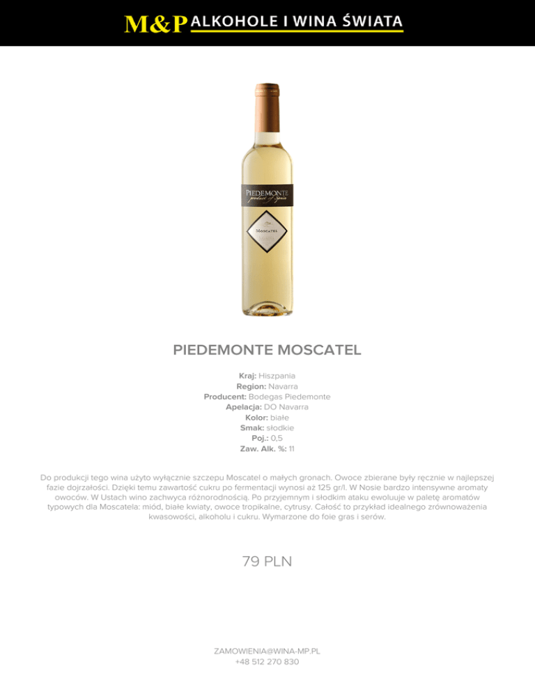 PIEDEMONTE MOSCATEL Kraj: Hiszpania Region: Navarra Producent: Bodegas Piedemonte Apelacja: DO Navarra Kolor: białe Smak: słodkie Poj.: 0,5 Zaw. Alk. %: 11 Do produkcji tego wina użyto wyłącznie szczepu Moscatel o małych gronach. Owoce zbierane były ręcznie w najlepszej fazie dojrzałości. Dzięki temu zawartość cukru po fermentacji wynosi aż 125 gr/l. W Nosie bardzo intensywne aromaty owoców. W Ustach wino zachwyca różnorodnością. Po przyjemnym i słodkim ataku ewoluuje w paletę aromatów typowych dla Moscatela: miód, białe kwiaty, owoce tropikalne, cytrusy. Całość to przykład idealnego zrównoważenia kwasowości, alkoholu i cukru. Wymarzone do foie gras i serów. 79 PLN [email protected] +48 512 270 830