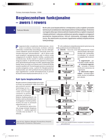 Pomiary Automatyka Robotyka 1/2008 Bezpieczeństwo funkcjonalne – awers i rewers Tadeusz Missala Na tle cyklu życia bezpieczeństwa i zmniejszania ryzyka urządzeń i procesów technicznych przedstawiono idee bezpieczeństwa funkcjonalnego. Omówiono wymagania dotyczące nienaruszalności bezpieczeństwa urządzeń związanych z bezpieczeństwem i wskazano podstawowe sposoby osiągania wymaganych parametrów bezpieczeństwa, których stosowania wymagają odnośne normy. Na zakończenie zarysowano zagadnienie walidacji bezpieczeństwa funkcjonalnego. rogramowalne urządzenia elektroniczne, stosowane w technice sterowania, technice ochrony człowieka i środowiska naturalnego oraz do zabezpieczenia obiektów przed awariami, stworzyły nowe wyzwania dotyczące niezawodności – tak w sferze realizacji urządzeń i oprogramowania, jak i w sferze oceny osiągniętych wyników. Bardzo wielka, a praktycznie nieskończona, liczba stanów w jakich urządzenia te mogą się znaleźć, w sposób istotny ogranicza wiarygodność sprawdzenia gotowego wyrobu, ograniczając ją do badań, które się stają wyrywkowymi w relacji do liczby stanów możliwych. Ocena bezpieczeństwa a posteriori została zastąpiona oceną a priori [1]. Bezpieczeństwo funkcjonalne jest dziś podstawowym podejściem do tego zagadnienia i zostało sformalizowane w postaci licznych norm międzynarodowych [2, 3, 4, 5]. W celu uniknięcia niejednoznaczności przytacza się kilka podstawowych definicji [1d]. szkoda – fizyczny uraz lub pogorszenie stanu zdrowia ludzi, tak bezpośrednie jak i pośrednie, wynikające ze szkody w majątku lub środowisku zagrożenie – potencjalne źródło szkody sytuacja zagrożenia – sytuacja, w której osoba jest narażona na zagrożenie zdarzenie zagrażające – sytuacja zagrożenia, której wynikiem jest szkoda Cykl życia bezpieczeństwa Bezpieczeństwo funkcjonalne jest rozpatrywane na podstawie cyklu życia bezpieczeństwa przedstawionego na rys. 1. Poszczególne faz y cyklu życia bezpieczeństwa są przedstawione za pomocą bloków funkcjonalnych i do każdej z nich są sformułowane wymagania w normie podstawowej [2] oraz w normach sektorowych [3, 4, 5]. W niniejszym opracowaniu uwaga zostanie skupiona na fazie 3 – analiza zagrożeń i ryzyka oraz na fazie 9 – realizacja. prof. dr inż. Tadeusz Missala, Przemysłowy Instytut Automatyki i Pomiarów, Warszawa Rys. 1. Cykl życia bezpieczeństwa urządzeń związanych z bezpieczeństwem 12 Missala.indd Sec1:12 1/11/2008 11:06:37 AM Pomiary Automatyka Robotyka 1/2008 Tab. 1. Poziomy nienaruszalności bezpieczeństwa: docelowe miary uszkodzeń funkcji bezpieczeństwa Poziom nienaruszalności bezpieczeństwa Rodzaj pracy na rzadkie przywołanie(średnie prawdopodobieństwo uszkodzenia wykonania jego zaprojektowanej funkcji na żądanie) Rodzaj pracy na częste przywołanie lub ciągły (prawdopodobieństwo uszkodzenia niebezpiecznego na godzinę) 4 od ³10 -5 do <10 -4 od ³10 -9 do <10 -8 3 od ³10 -4 do <10 -3 od ³10 -8 do <10 -7 ³10 -3 2 od <10 -2 od ³10 -7 do <10 -6 1 od ³10 -5 do <10 -1 od ³10 -6 do <10 -5 do Tab. 2. Relacje rodzajów pracy systemów związanych z bezpieczeństwem Rodzaj pracy Typ systemu związanego z bezpieczeństwem Sterowanie Ochrona Na rzadkie przywołanie Wymaga się, aby system sterowa n ia pracowa ł w krótkich odstępach czasu, np. ABS. Systemy ochronne, których liczba zadziałań jest mała w porównaniu z liczbą testów sprawdzających (np. system odcięcia instalacji chemicznej) Ciągły/na częste przywołanie Wymaga się, aby system pracował mniej lub więcej ciągle w długich przedziałach czasu, np. stymulator pracy serca. Systemy ochronne, których liczba zadziałań jest duża w porównaniu z liczbą testów sprawdzających (np. fotoelektryczny system ochrony maszyny) czeństwa, przy czym poziom nienaruszalności bezpieczeństwa 4 jest poziomem najwyższym, a poziom nienaruszalności bezpieczeństwa 1 jest poziomem najniższym. Poziomy nienaruszalności bezpieczeństwa są zdefiniowane, w zależności od rodzaju pracy urządzeń związanych z bezpieczeństwem, przez parametr y zamieszczone w tab. 1 [2]. Rodzaj pracy na rzadkie przywołanie jest charakterystyczny w przypadku urządzeń i systemów zabezpieczeń, na przykład w przemysłach procesow ych [3], rodzaj pracy na częste przywołanie lub ciągły występuje w przemyśle maszynowym [4] i zabezpieczeniach trakcyjnych [5]. Relacje między nimi przedstawiono w tab. 2. Źródła uszkodzeń to: błędy ludzkie, uszkodzenia przypadkowe i uszkodzenia systematyczne sprzętu i oprogramowania. ryzyko – kombinacja prawdopodobieństwa wystąpienia szkody i ciężkości tej szkody ryzyko tolerowane – ryzyko, które jest akceptoBezpieczeństwo funkcjonalne wane w określonym kontekście opartym na aktualnych a zmniejszanie ryzyka wartościach społecznych ryzyko obiektu – ryzyko pochodzące od obiektu Podstawowy schemat procesu zmniejszania ryzyka zosterowanego lub jego współdziałania z układem sterostał przedstawiony na rys. 2 [2e, 6]. Przy analizie zagrowania bezpieczeństwo funkcjonalne – część bezpieżeń i ryzyka należy wziąć pod uwagę wszystkie rodzaje czeństwa całkowitego odnosząca się do obiektu sterozagrożeń, jakie mogą wystąpić z powodu: wanego i systemu sterowania obiektem, która zależy – oddziaływania środowiska – wpływy czynników od prawidłowego działania systemów elektrycznych/ mechanicznych, elektromagnetycznych, chemiczelektronicznych/programowalnych elektronicznych nych, termicznych i ewentualne innych, jakie niesie związanych z bezpieczeństwem, systemów związanych środowisko z bezpieczeństwem wykonanych w innych technikach i zewnętrznych środków zmniejszania ryzyka nienaruszalność bezpieczeństwa – prawdopodobieństwo, że system związany z bezpieczeństwem wykona w sposób zadowalający wymagane funkcje bezpieczeństwa we wszystkich określonych warunkach i w 