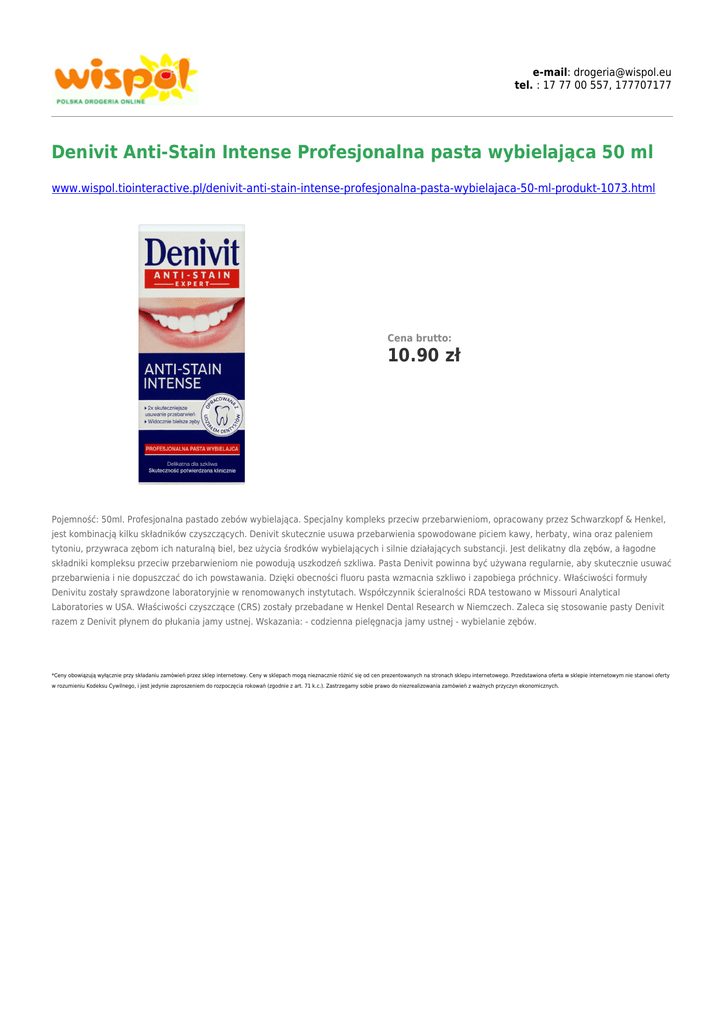e-mail: [email protected] tel. : 17 77 00 557, 177707177 Denivit Anti-Stain Intense Profesjonalna pasta wybielająca 50 ml www.wispol.tiointeractive.pl/denivit-anti-stain-intense-profesjonalna-pasta-wybielajaca-50-ml-produkt-1073.html Cena brutto: 10.90 zł Pojemność: 50ml. Profesjonalna pastado zebów wybielająca. Specjalny kompleks przeciw przebarwieniom, opracowany przez Schwarzkopf & Henkel, jest kombinacją kilku składników czyszczących. Denivit skutecznie usuwa przebarwienia spowodowane piciem kawy, herbaty, wina oraz paleniem tytoniu, przywraca zębom ich naturalną biel, bez użycia środków wybielających i silnie działających substancji. Jest delikatny dla zębów, a łagodne składniki kompleksu przeciw przebarwieniom nie powodują uszkodzeń szkliwa. Pasta Denivit powinna być używana regularnie, aby skutecznie usuwać przebarwienia i nie dopuszczać do ich powstawania. Dzięki obecności fluoru pasta wzmacnia szkliwo i zapobiega próchnicy. Właściwości formuły Denivitu zostały sprawdzone laboratoryjnie w renomowanych instytutach. Współczynnik ścieralności RDA testowano w Missouri Analytical Laboratories w USA. Właściwości czyszczące (CRS) zostały przebadane w Henkel Dental Research w Niemczech. Zaleca się stosowanie pasty Denivit razem z Denivit płynem do płukania jamy ustnej. Wskazania: - codzienna pielęgnacja jamy ustnej - wybielanie zębów. *Ceny obowiązują wyłącznie przy składaniu zamówień przez sklep internetowy. Ceny w sklepach mogą nieznacznie różnić się od cen prezentowanych na stronach sklepu internetowego. Przedstawiona oferta w sklepie internetowym nie stanowi oferty w rozumieniu Kodeksu Cywilnego, i jest jedynie zaproszeniem do rozpoczęcia rokowań (zgodnie z art. 71 k.c.). Zastrzegamy sobie prawo do niezrealizowania zamówień z ważnych przyczyn ekonomicznych.