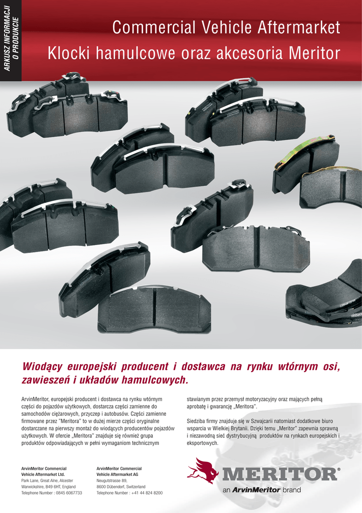 ARKUSZ INFORMACJI O PRODUKCIE Commercial Vehicle Aftermarket Klocki hamulcowe oraz akcesoria Meritor Wiodący europejski producent i dostawca na rynku wtórnym osi, zawieszeń i układów hamulcowych. ArvinMeritor, europejski producent i dostawca na rynku wtórnym części do pojazdów użytkowych, dostarcza części zamienne do samochodów ciężarowych, przyczep i autobusów. Części zamienne firmowane przez ”Meritora” to w dużej mierze części oryginalne dostarczane na pierwszy montaż do wiodących producentów pojazdów użytkowych. W ofercie „Meritora” znajduje się również grupa produktów odpowiadających w pełni wymaganiom technicznym ArvinMeritor Commercial Vehicle Aftermarket Ltd. Park Lane, Great Alne, Alcester Warwickshire, B49 6HT, England Telephone Number : 0845 6067733 ArvinMeritor Commercial Vehicle Aftermarket AG Neugutstrasse 89, 8600 Dübendorf, Switzerland Telephone Number : +41 44 824 8200 stawianym przez przemysł motoryzacyjny oraz mających pełną aprobatę i gwarancję „Meritora”. Siedziba firmy znajduje się w Szwajcarii natomiast dodatkowe biuro wsparcia w Wielkiej Brytanii. Dzięki temu „Meritor” zapewnia sprawną i niezawodną sieć dystrybucyjną produktów na rynkach europejskich i eksportowych. Meritor – “eksperci od hamulców” Największa rodzina produktów w Europie o najwyższej jakości dla pojazdów użytkowych, pochodzących od wiodącego europejskiego producenta i dostawcy na rynku wtórnym osi, zawieszeń i układów hamulcowych Oryginalne podzespoły Meritor • Ponad 80 zestawów klocków hamulcowych dla określonych typów pojazdów homologowanych dla oryginalnego wyposażenia i uwzględniających najnowsze zmiany konstrukcyjne. • Jeśli jest to wymagane, wszystkie części dostarczane są z oryginalnymi akcesoriami I czujnikami zużycia klocków. Wyłącznie Meritor • Największa w Europie gama części i podzespołów wytwarzanych i oferowanych na rynku zgodnie z najnowszymi przepisami UNECE R90 obejmująca wszystkie główne zastosowania dla ciężarówek (>7,5t), autobusów i przyczep w Europie. • Cechą charakterystyczną materiałów ciernych Meritor 501 i Meritor 502 jest ich stosowanie w zaciskach hamulcowych pneumatycznych i hydraulicznych w pojazdach użytkowych. • Materiały cierne udoskonalane i produkowane wyłącznie dla Meritor. • Wszystkie klocki hamulcowe noszą brytyjskie oznaczenie ‘E11’ i są na stałe stemplowane i oznakowane, aby zapewnić pełną możliwość identyfikacji. • Obejmują wszystkie główne zastosowania w tarczowych układach hamulcowych stosowanych w Europie takich jak: Meritor, Knorr, Wabco oraz Haldex. • Materiał cierny montowany jest na płycie głównej w zaawansowanej technologii ze zgrzewaną siatką co zapewnia niezawodność we wszelkich warunkach pracy. • Spełnienie norm osiągów OE na pogarszanie własności i powrót do normalnego stanu, wrażliwość na prędkość, wrażliwość na ciśnienie, zużycie w niskich i wysokich temperaturach, dopasowanie do tarcz hamulcowych i prasowalność. Pełna oferta produktów “Meritor” dla elementów ciernych układu hamulcowego jest obecnie dostępna w jednej publikacji, obejmującej klocki hamulcowe, okładziny hamulcowe, tarcze i bębny hamulcowe (Numer referencyjny katalogu MPN1074), razem z listą ilustrowanych części pokazującą uzupełniającą serię akcesoriów do klocków hamulcowych (Numer referencyjny katalogu MPN1082). Dostępna również jest tablica identyfikacyjna wizualnie ilustrująca dane dotyczące klocków hamulcowych; ten informator Meritor zatytułowany “klocki hamulcowe” jest idealny dla celów szybkiej identyfikacji zarówno w warsztatach naprawczych jak i magazynach (Numer referencyjny MPN1059). “Meritor to znak jakości wśród pojazdów użytkowych - części i obsługa serwisowa godne zaufania” Prosimy odwiedzić naszą stronę Internetową, aby zapoznać się z publikacjami “Meritor”: http://www.arvinmeritor.com/products/aftermarket/cvaeurope.asp Distributed by: © Copyright 2007 ArvinMeritor All rights Reserved This publication may be used only to specify and sell products of ArvinMeritor, its subsidiaries and affiliated companies. Use to specify and sell any other products is a copyright violation. Issued: 07/2007 Publication: MPN1090PL