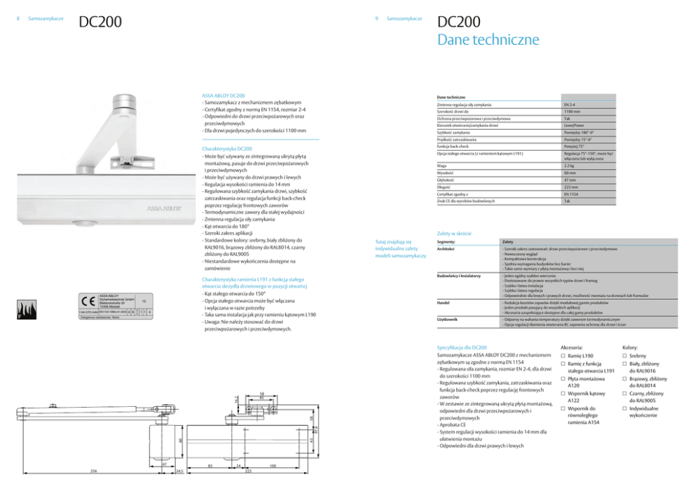 8 Samozamykacze DC200 9 Samozamykacze ASSA ABLOY DC200 · Samozamykacz z mechanizmem zębatkowym · Certyfikat zgodny z normą EN 1154, rozmiar 2-4 · Odpowiedni do drzwi przeciwpożarowych oraz przeciwdymowych · Dla drzwi pojedynczych do szerokości 1100 mm Dane techniczne Charakterystyka DC200 · Może być używany ze zintegrowaną ukrytą płytą montażową, pasuje do drzwi przeciwpożarowych i przeciwdymowych · Może być używany do drzwi prawych i lewych · Regulacja wysokości ramienia do 14 mm · Regulowana szybkość zamykania drzwi, szybkość zatrzaskiwania oraz regulacja funkcji back-check poprzez regulację frontowych zaworów · Termodynamiczne zawory dla stałej wydajności · Zmienna regulacja siły zamykania · Kąt otwarcia do 180° · Szeroki zakres aplikacji · Standardowe kolory: srebrny, biały zbliżony do RAL9016, brązowy zbliżony do RAL8014, czarny zbliżony do RAL9005 · Niestandardowe wykończenia dostępne na zamówienie 1162-CPD-0484 EN1154:1996+A1:2003 4 8 42 1 1 4 Dangerous substances: None EN 2-4 Szerokość drzwi do 1100 mm Ochrona przeciwpożarowa i przeciwdymowa Tak Kierunek otwierania/zamykania drzwi Lewe/Prawe Szybkość zamykania Pomiędzy 180°-0° Prędkość zatrzaskiwania Pomiędzy 15°-0° Funkcja back-check Powyżej 75° Opcja stałego otwarcia (z ramieniem kątowym L191) Regulacja 75°-150°, może być włączona lub wyłączona Waga 2.2 kg Wysokość 60 mm Głębokość 47 mm Długość 223 mm Certyfikat zgodny z EN 1154 Znak CE dla wyrobów budowlanych Tak Segmenty: Zalety Architekci - Szeroki zakres zastosowań: drzwi przeciwpożarowe i przeciwdymowe - Nowoczesny wygląd - Kompaktowa konstrukcja - Spełnia wymagania budynków bez barier - Takie same wymiary z płytą montażową i bez niej Budowlańcy i Instalatorzy - Jeden ogólny szablon wiercenia - Dostosowane do prawie wszystkich typów drzwi i framug - Szybka i łatwa instalacja - Szybka i łatwa regulacja - Odpowiednie dla lewych i prawych drzwi, możliwość montażu na drzwiach lub framudze Handel - Redukcja kosztów zapasów dzięki modułowej gamie produktów - Jeden produkt pasujący do wszystkich aplikacji - Akcesoria uzupełniające dostępne dla całej gamy produktów Użytkownik - Odporny na wahania temperatury dzięki zaworom termodynamicznym - Opcja regulacji tłumienia otwierania BC zapewnia ochronę dla drzwi i ścian Specyfikacja dla DC200 43 97,6 38 16,2 58 45 60 F · Kąt stałego otwarcia do 150° · Opcja stałego otwarcia może być włączana i wyłączana w razie potrzeby · Taka sama instalacja jak przy ramieniu kątowym L190 · Uwaga: Nie należy stosować do drzwi przeciwpożarowych i przeciwdymowych. 10 Zmienna regulacja siły zamykania Zalety w skrócie Tutaj znajdują się indywidualne zalety modeli samozamykaczy. Charakterystyka ramienia L191 z funkcją stałego otwarcia skrzydła drzwiowego w pozycji otwartej ASSA ABLOY Sicherheitstechnik GmbH Bildstockstraße 20 72458 Albstadt DC200 Dane techniczne 47 256 83 24,5 24 100 223 Samozamykacze ASSA ABLOY DC200 z mechanizmem zębatkowym są zgodne z normą EN 1154 · Regulowana siła zamykania, rozmiar EN 2-4, dla drzwi do szerokości 1100 mm · Regulowana szybkość zamykania, zatrzaskiwania oraz funkcja back-check poprzez regulację frontowych zaworów · W zestawie ze zintegrowaną ukrytą płytą montażową, odpowiedni dla drzwi przeciwpożarowych i przeciwdymowych · Aprobata CE · System regulacji wysokości ramienia do 14 mm dla ułatwienia montażu · Odpowiedni dla drzwi prawych i lewych Akcesoria: Kolory: Ramię L190 Srebrny Ramię z funkcją stałego otwarcia L191 Biały, zbliżony do RAL9016 Płyta montażowa A120 Brązowy, zbliżony do RAL8014 Wspornik kątowy A122 Czarny, zbliżony do RAL9005 Wspornik do równoległego ramienia A154 Indywidualne wykończenie