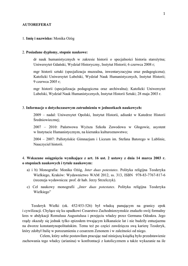 1 AUTOREFERAT 1. Imię i nazwisko: Monika Ożóg 2. Posiadane dyplomy, stopnie naukowe: dr nauk humanistycznych w zakresie historii o specjalności historia starożytna; Uniwersytet Gdański, Wydział Historyczny, Instytut Historii; 6 czerwca 2008 r; mgr historii sztuki (specjalizacja muzealna, inwentaryzacyjna oraz pedagogiczna); Katolicki Uniwersytet Lubelski, Wydział Nauk Humanistycznych, Instytut Historii; 9 czerwca 2005 r; mgr historii (specjalizacja pedagogiczna oraz archiwalna); Katolicki Uniwersytet Lubelski, Wydział Nauk Humanistycznych, Instytut Historii Sztuki; 28 maja 2003 r. 3. Informacje o dotychczasowym zatrudnieniu w jednostkach naukowych: 2009 – nadal: Uniwersytet Opolski, Instytut Historii, adiunkt w Katedrze Historii Średniowiecznej; 2007 – 2010: Państwowa Wyższa Szkoła Zawodowa w Głogowie, asystent w Instytucie Humanistycznym, na kierunku kulturoznawstwo; 2004 – 2007: Pallotyńskie Gimnazjum i Liceum im. Stefana Batorego w Lublinie, Nauczyciel historii. 4. Wskazane osiągnięcia wynikające z art. 16 ust. 2 ustawy z dnia 14 marca 2003 r. o stopniach naukowych i tytule naukowym: a) i b) Monografia: Monika Ożóg, Inter duas potestates. Polityka religijna Teoderyka Wielkiego, Kraków: Wydawnictwo WAM 2012, ss. 313, ISBN 978-83-7767-817-6 (recenzja wydawnicza: prof. dr hab. Jerzy Strzelczyk). c) Cel naukowy monografii „Inter duas potestates. Polityka religijna Teoderyka Wielkiego” Teoderyk Wielki (ok. 452/453-526) był władcą panującym na granicy epok i cywilizacji. Chylące się ku upadkowi Cesarstwo Zachodniorzymskie znalazło swój formalny kres w abdykacji Romulusa Augustulusa i przejęciu władzy przez Germana Odoakra. Jego rządy okazały się jednak tylko epizodem trwającym kilkanaście lat i nie budziły entuzjazmu na dworze konstantynopolitańskim. Temu też po części zawdzięcza swą karierę Teoderyk, który zdobył Italię w porozumieniu z cesarzem Zenonem i w zależności od niego. Celem, który sobie postawiłam pracując nad niniejszą książką było przedstawienie zachowania tego władcy (arianina) w konfrontacji z katolicyzmem a także wykazanie na ile 2 „udzielał” się on w sprawach wyznaniowych państwa, którym rządził; jaki był jego stosunek, jego relacje z przedstawicielami Wielkiego Kościoła; jakie były okoliczności kulturowe i polityczne generujące to zainteresowanie; do jakiego stopnia praktyka sprawowania władzy przez Teoderyka mogła być zdeterminowana jego uwikłaniem w gocką tradycję, do jakiego zaś w oczekiwania rzymskich mieszkańców Półwyspu i administracji cesarza Konstantynopola; na ile możemy mówić o przykładnej tolerancji religijnej w jego państwie. Z politycznego i kulturowego punktu widzenia Teoderyk stał pomiędzy tradycją rzymską a swoimi korzeniami germańskimi. Starał się być wierny własnemu narodowi, przyjmując jednocześnie rzymskie prawa i obywatelskie cnoty. Bycie Rzymianinem wyraźnie mu imponowało. Z religijnego punktu widzenia, obejmując władzę w Italii na życzenie cesarza, znalazł się w środku konfliktu, jaki w owych latach nękał Rzym i Konstantynopol. Była to schizma akacjańska, w której chodziło zarówno o uznanie Soboru Chalcedońskiego z 451 roku i jego nauki o dwóch naturach w Chrystusie, jak i o uznanie Konstantynopola za najważniejsze miasto na Wschodzie w porządku kościelnym. Niebagatelną okolicznością było ariańskie wyznanie Teoderyka, co pozwalało mu na zachowanie dystansu wobec obu spierających się stolic. Drugim problemem eklezjalnym dotyczących samego już Rzymu, któremu Liber Pontificalis poświęca większą uwagę, jest schizma laurencjańska, która wzięła nazwę od Wawrzyńca, wybranego papieżem w tym samym dniu co Symmach, uznanym przez króla za prawowitego biskupa Rzymu. Mimo tego uznania trwała ona co najmniej do 507 roku, czyli przez niecałą dekadę, między innymi dlatego, że król umiejętnie udzielał swego poparcia raz jednemu, raz drugiemu kandydatowi, w zależności od tego, co było akurat wygodne dla niego i dla możnych panów w Rzymie, z którymi musiał się liczyć. Dla przebadania polityki religijnej oparłam się na tekście Liber Pontificalis, analizując biogramy papieży z czasów rządów Teoderyka (od Feliksa III: 483-492 do Feliksa IV: 526530) i szukając w nich jakichkolwiek wskazówek jego dotyczących. Autorzy tego dzieła, powstałego krótko po śmierci Teoderyka, byli na pewno dobrze poinformowani, nie znaczy to jednak, że w swych relacjach byli obiektywni. Zależało im przede wszystkim na ukazaniu zasług biskupów Rzymu i wielkości rzymskiej ortodoksji. Jeśli więc podkreślają jakiekolwiek pozytywne strony panowania ariańskiego króla, zasługuje to tym bardziej na uwagę. W pierwszym biogramie Feliksa III (483-492) imię Teoderyka służy jedynie jako okolicznik czasu, i to tylko w II redakcji Liber Pontificalis. Nie ma w tym nic dziwnego, biorąc pod uwagę, że za tego pontyfikatu Teoderyk zaledwie rozpoczął swoje panowanie w Italii. Choć zdaniem specjalistów między I a II redakcją LP nie upłynęło wiele czasu, tę adnotację mamy tylko w II redakcji, jakby jej autorom zależało na dopowiedzeniu szczegółu, który już nie dla wszystkich mógł być oczywisty. Biogram Gelazego (492-496) wspomina Teoderyka na równi z cesarzem Zenonem, umieszczając czasy pontyfikatu za rządów tych dwóch władców, jednego na Zachodzie, drugiego na Wschodzie. LP stosuje początkowo zwyczajny dla Rzymian sposób datowania, podając imiona cesarzy i konsulów. Tak jest do papieża Liberiusza (352-366). Później zapisuje tylko długość pontyfikatów w latach, miesiącach i dniach, nie wykazując zainteresowania możnymi tego świata. Przed chwilą zwracałam uwagę, że w II redakcji 3 biogramu Feliksa III pojawia się uwaga o panowaniu Teoderyka, tutaj mamy natomiast powrót do praktyki wcześniejszej i autorzy podają imiona Teoderyka i Zenona, jakby byli równouprawnieni 