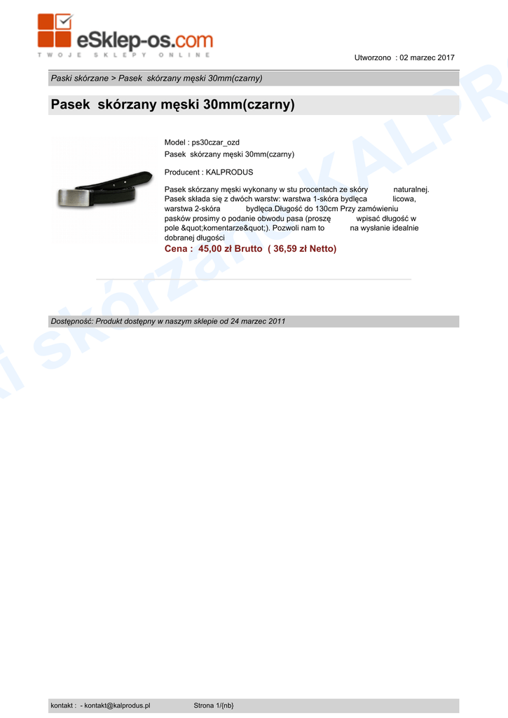 i k Utworzono : 02 marzec 2017 R P Paski skórzane > Pasek skórzany męski 30mm(czarny) Pasek skórzany męski 30mm(czarny) Model : ps30czar_ozd Pasek skórzany męski 30mm(czarny) K e Producent : KALPRODUS L A Pasek skórzany męski wykonany w stu procentach ze skóry naturalnej. Pasek składa się z dwóch warstw: warstwa 1-skóra bydlęca licowa, warstwa 2-skóra bydlęca.Długość do 130cm Przy zamówieniu pasków prosimy o podanie obwodu pasa (proszę wpisać długość w pole "komentarze"). Pozwoli nam to na wysłanie idealnie dobranej długości n a z r ó Cena : 45,00 zł Brutto ( 36,59 zł Netto) k s Dostępność: Produkt dostępny w naszym sklepie od 24 marzec 2011 kontakt : - [email protected] Strona 1/{nb}