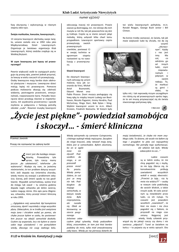 Klub Ludzi Artystycznie Niewyżytych numer 43/2007 fazę oburęczną i wykorzystują w równym stopniu obie ręce. Święto maokutów, lewusów, leworęcznych… 13 sierpnia leworęczni obchodzą swoje święto, uznane zostało ono w 1992 roku jako Międzynarodowy Dzieo Leworęcznych. Organizuje je światowa organizacja Klub Leworęcznych, której siedziba znajduje się w Wielkiej Brytanii. W czym leworęczny jest lepszy od praworęcznego? Pewnie większośd osób to czytających posługuje się prawą ręka, powinni jednak przyznad, że lewusy w wielu rzeczach ich przewyższają. Osoby leworęczne mają bardzo duże zdolności plastyczne i muzyczne. Leworęczne dzieci malują lepiej niż praworęczne. Pomocne podczas malowania okazują się: zdolnośd widzenia, postrzeganie przestrzeni, emocjonalnośd, rozpoznawanie barw. Ponadto leworęczne dzieci przodują również w majsterkowaniu. Ich wyobraźnia przestrzenna i sposób myślenia w połączeniu z fantazją potrafią zdziaład „cuda”. Również muzykę leworęczni odczuwają inaczej niż praworęczni. Prawie zawsze ją dostrzegają, tzn. nie istnieje dla nich muzyka w roli tła, tak jak powszechnie się dziś ją traktuje. Często są w stanie zanucid jakąś melodię, którą usłyszeli kilka chwil temu przypadkiem. Leworęczni sportowcy często przewyższają swoich praworęcznych ciwników, ponieważ Ci w swojej technice w ogromnym stopniu nastawieni są na rywalizację z praworęcznymi. Sławni leworęczni Do sławnych leworęcznych zaliczają się uznani malarze, tacy jak Leonardo da Vinci, Michał Anioł Buonarotti, Eduard Monet oraz Pablo Picasso. Znani muzycy posługujący się lewą ręką to między innymi Ludwig van Beethoven, Niccolo Paganini, Jimmy Hendrix, Paul McCartney, Ringo Starr, Bob Dylan i Sting. Wybitni leworęczni uczeni to m.in. Albert Einstein, Friedrich Nietzsche. W historii było też wielu leworęcznych polityków, m.in. Ronald Reagan, George Bush senior i Bill Clinton. Na koniec trzeba zaznaczyd, że świata, tak jak może większośd ludzi by chciało, nie da się uczynid „oburęcznym”. Każdy z nas jest inny. Ma coś, co odróżnia go od innych ludzi, czyni niepowtarzalnym i jedynym w swoim rodzaju. To, że maokuci są gorsi i słabsi, to tylko mit, i tak naprawdę niczym szczególnym nie różnią się od praworęcznych oprócz tego, że to oni muszą przyzwyczajad się do świata stworzonego pod prawą rękę. © klan 2007 „Życie jest piękne”- powiedział samobójca i skoczył… - śmierć kliniczna Przemuś Jaworek Proszę nie rozmawiać bo zabiorę kartki mierd jest dla każdego niespodzianką. Prowadzimy tyle spraw, tyle rzeczy mamy jeszcze „do załatwienia”, telefonów „do wykonania”. Wydaje się nam, że jesteśmy nieśmiertelni, że ten problem dotyczy wszystkich. Jeśli dopada nas śmiertelna choroba, wtedy można się oswajad z problemem odejścia. Gorzej, jeśli śmierd spada na nas gwałtownie. Wypadek samochodowy, wylew krwi do mózgu lub zawał – tu ostatnia godzina dopada nagle człowieka jak dzikie zwierzę. Ludzie reagują różnie. Oto opis pana Zbigniewa, człowieka, który przeżył śmierd kliniczną w roku 1993. Ś „...Oglądałem mój samochód. Był kompletnie zniszczony, dymił i wyciekały z niego wszystkie płyny. Zobaczyłem, że w środku jest uwięziona moja żona i chciałem woład po pomoc, ale chyba jeszcze byłem w szoku, bo postanowiłem jeszcze raz obejśd samochód dookoła. Czułem się wspaniale, lecz nie byłem w stanie sobie tego uświadomid i nie pomyślałem wtedy, dlaczego nie czuję żadnego bólu. II LO w Krośnie im. Konstytucji 3 maja Wtedy zatrzymało się czerwone Cuinqecento, z którego wybiegł młody mężczyzna. Zacząłem do niego krzyczed, żeby ratował moją żonę, która jest w samochodzie. Byłem zdumiony, bo on w ogóle mnie nie słyszał! Podszedłem do niego, a on przeszedł przeze mnie! Po prostu. Wtedy pomyślałem, że coś jest ze mną nie tak. Podbiegłem do mojego samochodu, w którym leżała żona. Była nieprzytomna, ale ruszała się. Obok za kierownicą w stercie pozginanego żelastwa zobaczyłem jakąś sylwetkę. Kiedy podszedłem bliżej, zrozumiałem, że tam jest ktoś bardzo podobny do mnie, tylko miał zmasakrowaną całą twarz. Wtedy po raz pierwszy dotarło do mojej świadomości, że chyba nie mam zwykłego ciała. To dziwne, ale wcale nie bałem się tego i przyjąłem to jako coś najzupełniej normalnego. Nie potrafię tego wytłumaczyd, ale właśnie tak było. Wtedy zobaczyłem to coś...” Ludzie czasami są w takim szoku, że nie chcą pogodzid się z myślą, że nie żyją. Zdarza się, że konsekwentnie próbują zawiadomid wszystkich wokół o swojej obecności. „Przecież ja żyję... czy ty mnie nie widzisz?!” – osoby w nowym ciele podchodzą do swoich bliskich, a także innych osób. W ciele astralnym są niewidzialni przez ludzi, co ich irytuje. To czasami jest powodem wszelkich „nawiedzeo”, że ktoś nie może i nie chce pogodzid się z faktem, że przyszedł na niego czas zmiany. Najgorzej jest wtedy, kiedy człowiek przywiązał się do jakiejś rzeczy czy domu i nie zamierza „odpuścid”. Tunel ze światłem na koocu – to pojawia się w wielu opisach. Oto [2007] 17