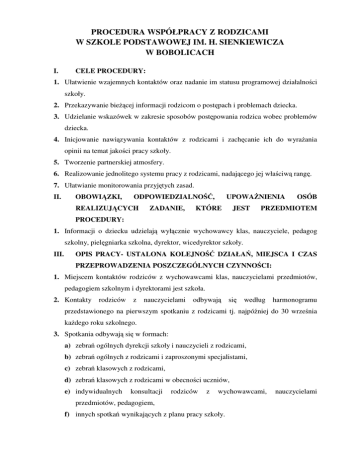 PROCEDURA WSPÓŁPRACY Z RODZICAMI W SZKOLE PODSTAWOWEJ IM. H. SIENKIEWICZA W BOBOLICACH I. CELE PROCEDURY: 1. Ułatwienie wzajemnych kontaktów oraz nadanie im statusu programowej działalności szkoły. 2. Przekazywanie bieżącej informacji rodzicom o postępach i problemach dziecka. 3. Udzielanie wskazówek w zakresie sposobów postępowania rodzica wobec problemów dziecka. 4. Inicjowanie nawiązywania kontaktów z rodzicami i zachęcanie ich do wyrażania opinii na temat jakości pracy szkoły. 5. Tworzenie partnerskiej atmosfery. 6. Realizowanie jednolitego systemu pracy z rodzicami, nadającego jej właściwą rangę. 7. Ułatwianie monitorowania przyjętych zasad. II. OBOWIĄZKI, ODPOWIEDZIALNOŚĆ, REALIZUJĄCYCH ZADANIE, UPOWAŻNIENIA KTÓRE JEST OSÓB PRZEDMIOTEM PROCEDURY: 1. Informacji o dziecku udzielają wyłącznie wychowawcy klas, nauczyciele, pedagog szkolny, pielęgniarka szkolna, dyrektor, wicedyrektor szkoły. III. OPIS PRACY- USTALONA KOLEJNOŚĆ DZIAŁAŃ, MIEJSCA I CZAS PRZEPROWADZENIA POSZCZEGÓLNYCH CZYNNOŚCI: 1. Miejscem kontaktów rodziców z wychowawcami klas, nauczycielami przedmiotów, pedagogiem szkolnym i dyrektorami jest szkoła. 2. Kontakty rodziców z nauczycielami odbywają się według harmonogramu przedstawionego na pierwszym spotkaniu z rodzicami tj. najpóźniej do 30 września każdego roku szkolnego. 3. Spotkania odbywają się w formach: a) zebrań ogólnych dyrekcji szkoły i nauczycieli z rodzicami, b) zebrań ogólnych z rodzicami i zaproszonymi specjalistami, c) zebrań klasowych z rodzicami, d) zebrań klasowych z rodzicami w obecności uczniów, e) indywidualnych konsultacji rodziców z wychowawcami, przedmiotów, pedagogiem, f) innych spotkań wynikających z planu pracy szkoły. nauczycielami 4. Rodzice uczniów szkoły mają możliwość dodatkowego kontaktu z nauczycielami w przypadkach uzasadnionych losowo, jednak po uprzednim uzgodnieniu takiego spotkania z nauczycielem (poprzez telefon do szkoły lub bezpośrednio z nauczycielem za jego pozwoleniem). 5. W żadnym przypadku nauczyciel nie udziela informacji rodzicom w trakcie prowadzonych przez siebie zajęć szkolnych ( w tym również dyżurów na korytarzach i boisku szkolnym). 6. Miejscem kontaktów nauczycieli i rodziców na terenie szkoły są gabinety lekcyjne. Miejscem kontaktów dyrektorów szkoły i rodziców na terenie szkoły jest gabinet dyrektora, a pedagoga- gabinet pedagoga. Niedopuszczalne jest przekazywanie informacji rodzicom w pokoju nauczycielskim w obecności innych nauczycieli. Po za tymi miejscami informacje nie są udzielane. 7. Terminy spotkań z rodzicami ustalone są w harmonogramie zebrań z rodzicami przedstawionym nauczycielom i rodzicom na początku roku szkolnego. 8. O obowiązkowym spotkaniu z rodzicami wychowawca jest zobowiązany przypomnieć uczniom i rodzicom, z co najmniej 3-dniowym wyprzedzeniem, podając datę, miejsce, godzinę spotkania (można stosować pisemne zaproszenie z podpisem i podaniem informacji zwrotnej). 9. Dyrektor szkoły może zmienić ustalone terminy zebrań w uzasadnionych przypadkach. 10. Obecność rodzica na zebraniach jest obowiązkowa. 11. W sytuacjach uzasadnionych wychowawczo, szkoła wzywa rodziców poza ustalonymi terminami. 12. Wychowawca w nagłych sytuacjach może skontaktować się z rodzicami telefonicznie, w innych sytuacjach wzywa rodzica do szkoły za pośrednictwem sekretariatu szkoły formie pisemnej i odnotowuje ten fakt w dzienniku zajęć lekcyjnych. 13. Wychowawca klasy utrzymuje kontakt z rodzicami w formach: a) zebrań z rodzicami, b) pisemnych informacji o postępach i zachowaniu uczniów, c) indywidualnych spotkań z rodzicami na terenie szkoły, po uprzednim uzgodnieniu terminu, d) odwiedzin w domu wychowanka po uprzednim uzyskaniu zgody rodzica ( w szczególnych przypadkach bez zgody np.. brak kontaktu z rodzicami), 14. Corocznym obowiązkiem wychowawcy klasy w trakcie zebrań klasowych jest zapoznanie rodziców z: a) statutem szkoły, b) programem wychowawczym szkoły, c) programem profilaktyki szkoły, d) planem pracy nauczyciela i planem wychowawczym klasy, planem pracy z rodzicami, e) Wewnątrzszkolnym Systemem Oceniania, f) kryteriami ocen zachowania, g) sposobami sprawdzania osiągnięć edukacyjnych uczniów h) warunkami i trybie uzyskania wyższej niż przewidywana ocena roczna klasyfikacyjna z zajęć obowiązkowych oraz wyższej niż przewidywana rocznej oceny zachowania, i) wymaganiami edukacyjnymi z poszczególnych przedmiotów, j) postępami edukacyjnymi i wychowawczymi uczniów, k) informacjami bieżącymi dotyczącymi funkcjonowania klasy i szkoły. 15. Wychowawca klasy realizując tematykę szkoleniową dla rodziców, w ramach zebrań klasowych powinien uwzględniać następujące zagadnienia: a) rozwój psychiczny dzieci i młodzieży, b) przyczyny i zapobieganie agresji; rodzaje agresji wstępującej w naszej szkole, c) zapobieganie niewłaściwym zachowaniom, d) tolerancja i integracja, e) higiena i bezpieczeństwo, f) zadania rodziców w zakresie motywacji i wzmacniania dzieci, g) zasady przeprowadzania sprawdzianu w szóstej klasie, h) inne zagadnienia wynikające z planu pracy szkoły i klasy. 16. Podczas spotkań klasowych z rodzicami wychowawca zobowiązany jest uwzględnić następujące zasady: a) najtrudniejsze sprawy dotyczące ucznia należy omawiać szczerze, ale w indywidualnej rozmowie z rodzicami, b) największą uwagę należy przywiązywać do spraw opiekuńczych, wychowawczych i dydaktycznych, c) najważniejszym składnikiem informacji o wynikach w nauce mają być poczynione postępy oraz wskazanie, w porozumieniu z nauczycielami przedmiotów, treści niezbędnych do ich uzupełnienia, d) z rodzicami rozmawiać należy po partnersku, z troską i życzliwością, e) udzielać konkretnych rad co do przezwyciężenia określonych trudności lub wskazywać osoby, instytucje, które to czynią. 17. W trakcie zebrań klasowych zabrania się: a) dokonywania tylk