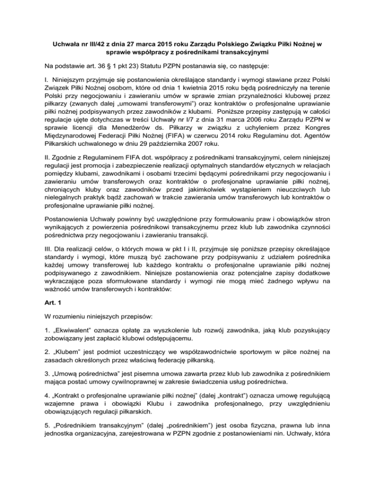 Uchwała nr III/42 z dnia 27 marca 2015 roku Zarządu Polskiego Związku Piłki Nożnej w sprawie współpracy z pośrednikami transakcyjnymi Na podstawie art. 36 § 1 pkt 23) Statutu PZPN postanawia się, co następuje: I. Niniejszym przyjmuje się postanowienia określające standardy i wymogi stawiane przez Polski Związek Piłki Nożnej osobom, które od dnia 1 kwietnia 2015 roku będą pośredniczyły na terenie Polski przy negocjowaniu i zawieraniu umów w sprawie zmian przynależności klubowej przez piłkarzy (zwanych dalej „umowami transferowymi”) oraz kontraktów o profesjonalne uprawianie piłki nożnej podpisywanych przez zawodników z klubami. Poniższe przepisy zastępują w całości regulacje ujęte dotychczas w treści Uchwały nr I/7 z dnia 31 marca 2006 roku Zarządu PZPN w sprawie licencji dla Menedżerów ds. Piłkarzy w związku z uchyleniem przez Kongres Międzynarodowej Federacji Piłki Nożnej (FIFA) w czerwcu 2014 roku Regulaminu dot. Agentów Piłkarskich uchwalonego w dniu 29 października 2007 roku. II. Zgodnie z Regulaminem FIFA dot. współpracy z pośrednikami transakcyjnymi, celem niniejszej regulacji jest promocja i zabezpieczenie realizacji optymalnych standardów etycznych w relacjach pomiędzy klubami, zawodnikami i osobami trzecimi będącymi pośrednikami przy negocjowaniu i zawieraniu umów transferowych oraz kontraktów o profesjonalne uprawianie piłki nożnej, chroniących kluby oraz zawodników przed jakimkolwiek wystąpieniem nieuczciwych lub nielegalnych praktyk bądź zachowań w trakcie zawierania umów transferowych lub kontraktów o profesjonalne uprawianie piłki nożnej. Postanowienia Uchwały powinny być uwzględnione przy formułowaniu praw i obowiązków stron wynikających z powierzenia pośrednikowi transakcyjnemu przez klub lub zawodnika czynności pośrednictwa przy negocjowaniu i zawieraniu transakcji. III. Dla realizacji celów, o których mowa w pkt I i II, przyjmuje się poniższe przepisy określające standardy i wymogi, które muszą być zachowane przy podpisywaniu z udziałem pośrednika każdej umowy transferowej lub każdego kontraktu o profesjonalne uprawianie piłki nożnej podpisywanego z zawodnikiem. Niniejsze postanowienia oraz potencjalne zapisy dodatkowe wykraczające poza sformułowane standardy i wymogi nie mogą mieć żadnego wpływu na ważność umów transferowych i kontraktów: Art. 1 W rozumieniu niniejszych przepisów: 1. „Ekwiwalent” oznacza opłatę za wyszkolenie lub rozwój zawodnika, jaką klub pozyskujący zobowiązany jest zapłacić klubowi odstępującemu. 2. „Klubem” jest podmiot uczestniczący we współzawodnictwie sportowym w piłce nożnej na zasadach określonych przez właściwą federację piłkarską. 3. „Umową pośrednictwa” jest pisemna umowa zawarta przez klub lub zawodnika z pośrednikiem mająca postać umowy cywilnoprawnej w zakresie świadczenia usług pośrednictwa. 4. „Kontrakt o profesjonalne uprawianie piłki nożnej” (dalej „kontrakt”) oznacza umowę regulującą wzajemne prawa i obowiązki Klubu i zawodnika profesjonalnego, przy uwzględnieniu obowiązujących regulacji piłkarskich. 5. „Pośrednikiem transakcyjnym” (dalej „pośrednikiem”) jest osoba fizyczna, prawna lub inna jednostka organizacyjna, zarejestrowana w PZPN zgodnie z postanowieniami nin. Uchwały, która nieodpłatnie lub za wynagrodzeniem reprezentuje Klub lub zawodnika przy negocjacjach i zawieraniu umowy transferowej względnie Kontraktu o profesjonalne uprawianie piłki nożnej (w tym umowy zlecenia lub agencyjnej), pośrednictwa pracy lub jakiegokolwiek innego stosunku prawnego. 6. „PZPN” oznacza Polski Związek Piłki Nożnej. 7. „Sezon rozgrywkowy” oznacza okres od 1 lipca danego roku do 30 czerwca roku następnego. 8. „Systemem rejestracyjnym” jest ewidencja Pośredników i dokonywanych przez nich czynności, prowadzona i upubliczniona przez PZPN na zasadach określonych w niniejszej Uchwale. 9. „Transakcja” oznacza negocjowanie i zawarcie Umowy transferowej lub Kontraktu. 10. „Umową transferową” jest cywilnoprawne porozumienie dwóch klubów piłkarskich, na podstawie, którego następuje, za zgodą zawodnika, odpłatna lub nieodpłatna zmiana jego przynależności klubowej. 11. „Zasadnicze wynagrodzenie Zawodnika” oznacza wynagrodzenie określone w Kontrakcie, którego wypłata i wysokość nie może być w żaden sposób warunkowana. 12. „Zawodnikiem” jest osoba uprawiająca sport piłki nożnej w sposób amatorski lub profesjonalny. 13. „Zawodnikiem niepełnoletnim” jest zawodnik, który nie ukończył 18 roku życia. Art. 2 1. Przy zawieraniu Umowy transferowej lub Kontraktu o profesjonalne uprawianie piłki nożnej Zawodnik i Klub są uprawnieni do korzystania wyłącznie z usług Pośredników. 2. Przy wyborze Pośrednika Zawodnik lub Klub muszą postępować z należytą starannością oraz poszanowaniem regulacji PZPN. W szczególności, możliwość skorzystania przy Transakcji z usług Pośrednika uzależniona jest od: 1) istnienia nieposzlakowanej reputacji Pośrednika, 2) zarejestrowania i zweryfikowania Pośrednika w Systemie rejestracyjnym, zgodnie z postanowieniami niniejszej Uchwały, nie później niż w dniu zawarcia Umowy pośrednictwa, 3) zawarcia z Pośrednikiem Umowy pośrednictwa i jej niezwłocznego złożenia do PZPN. 3. Pośrednikiem nie może być osoba sprawująca funkcje zarządzające, administracyjne, techniczne lub medyczne w FIFA, konfederacji kontynentalnej, krajowym lub regionalnym związku piłkarskim, lidze zawodowej oraz klubie piłkarskim, a także osoba będąca członkiem tych organizacji, sędzią piłkarskim, sędzią asystentem, trenerem oraz instruktorem, jak również każdy inny podmiot zobowiązany do przestrzegania Statutów FIFA i PZPN, podległy ich władztwu dyscyplinarnemu z każdego innego tytułu uczestnictwa w sporcie piłki nożnej. 4. Pośrednikiem działającym jako osoba f