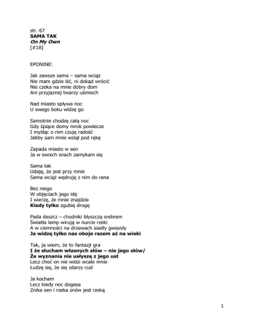 str. 67 SAMA TAK On My Own [#18] EPONINE: Jak zawsze sama – sama wciąż Nie mam gdzie iść, ni dokąd wrócić Nie czeka na mnie dobry dom Ani przyjaznej twarzy uśmiech Nad miasto spływa noc U swego boku widzę go Samotnie chodzę całą noc Gdy śpiące domy mrok powlecze I myśląc o nim czuję radość Jakby sam mnie wziął pod rękę Zapada miasto w sen Ja w swoich snach zamykam się Sama tak Udaję, że jest przy mnie Sama wciąż wędruję z nim do rana Bez niego W objęciach jego idę I wierzę, że mnie znajdzie Kiedy tylko zgubię drogę Pada deszcz – chodniki błyszczą srebrem Światła lamp wirują w nurcie rzeki A w ciemności na drzewach siadły gwiazdy Ja widzę tylko nas oboje razem aż na wieki Tak, ja wiem, że to fantazji gra I że słucham własnych słów – nie jego słów/ Że wyznania nie usłyszę z jego ust Lecz choć on nie widzi wcale mnie Łudzę się, że się zdarzy cud Ja kocham Lecz kiedy noc dogasa Znika sen i rzeka znów jest rzeką 1 Bez niego Świat traci swą urodę Spadają gwiazdy z drzew A wkoło sami nieznajomi Ja kocham I uczę się codziennie Cały czas udaję i udaję Beze mnie On woli świat beze mnie I znajdzie upojenie Lecz ominie ono mnie Ja kocham Tak kocham Wciąż kocham A jednak nie mam go 2