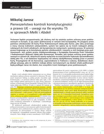 ARTYKUŁY I ROZPRAWY Mikołaj Jarosz Pierwszeństwo kontroli konstytucyjności a prawo UE – uwagi na tle wyroku TS w sprawach Melki i Abdeli Truizmem będzie przypominanie, jak złożony stał się ostatnio system ochrony praw podstawowych w Europie, w jej części zjednoczonej w ramach Unii Europejskiej. Po przyjęciu przez państwa członkowskie UE Karty Praw Podstawowych (dalej jako Karta), jako aktu prawnego o mocy równej traktatom założycielskim, system ten opiera się na trzech rodzajach aktów, należących do trzech odrębnych, ale bynajmniej nie rozłącznych, systemów prawa. W systemie prawa krajowego są to konstytucje państw członkowskich i zawarte w nich katalogi praw podstawowych. Jest system prawa międzynarodowego z Europejską Konwencją Praw Człowieka i Podstawowych Wolności (dalej jako Konwencja). Ponadto, jest system ochrony praw podstawowych w ramach UE, dotychczas oparty wyłącznie na orzecznictwie Trybunału Sprawiedliwości (dalej jako TS), a od niedawna wyposażony we własny skodyfikowany katalog praw w postaci Karty. Przystąpienie UE do Konwencji, zapowiedziane w Traktacie z Lizbony, dodatkowo skomplikuje sytuację, jako że niektóre rodzaje aktów normatywnych czy działań władz publicznych1 będą podlegać naraz nie dwóm, lecz wszystkim trzem katalogom praw podstawowych. 1. Wprowadzenie Każdy z tych rodzajów aktów wyposażony jest we własny mechanizm sądowej ochrony zawartych w nim praw. W systemach krajowych funkcję tę pełnią przede wszystkim sądy konstytucyjne, a w pewnym zakresie także inne sądy, z różnego rodzaju sądami najwyższymi na czele. Prawa zagwarantowane w Konwencji chroni Europejski Trybunał Praw Człowieka (dalej jako ETPCz). Z kolei w ramach UE funkcję tę pełni TS. Postępująca europeizacja przestrzeni prawnej – przede wszystkim wskutek rozszerzenia zakresu kompetencji Unii, ale także stopniowej rozbudowy katalogu praw chronionych na mocy Konwencji – rodzi pytanie o rolę tych poszczególnych organów w systemie, a w szczególności o rolę sądów krajowych, zwłaszcza zaś sądów konstytucyjnych. Te ostatnie tracą bowiem prawdopodobnie najwięcej na przeniesieniu ciężaru ochrony praw podstawowych na sądy europejskie. Z kolei cicha rywalizacja trybunałów w Strasburgu i Luksemburgu znana jest nie od dzisiaj. W niektórych państwach członkowskich podjęto więc próbę powstrzymania erozji znaczenia sądów konstytucyjnych w ochronie praw podstawowych, poprzez ustawowe zagwarantowanie im pierwszeństwa w sytuacji zbiegu różnych (tj. krajowych i europejskich) systemów ochrony praw podstawowych. I tak w Belgii, na mocy nowelizacji z 12.07.2009 r., 1 Przykładowo, akty normatywne mające na celu transpozycję do prawa krajowego przepisów UE. 24 Europejski Przegląd Sądowy sierpień 2011 wprowadzono do ustawy organicznej z 6.01.1989 r. o Sądzie Konstytucyjnym (Cour constitutionnelle)2 nowy art. 26 § 4. Stanowi on, że w przypadku podniesienia przed sądem belgijskim zarzutu niezgodności przepisu prawa z prawem podstawowym, chronionym jednocześnie na mocy umowy międzynarodowej i konstytucji belgijskiej, sąd ten jest zobowiązany w pierwszej kolejności zwrócić się do Sądu Konstytucyjnego z pytaniem prawnym w przedmiocie zgodności z konstytucją. Podobny mechanizm został zastosowany we Francji. Na mocy ustawy konstytucyjnej z 23.07.2008 r.3 w kraju tym wprowadzono po raz pierwszy instytucję następczej kontroli konstytucyjności ustaw przez Radę Konstytucyjną (Conseil constitutionnel), w drodze pytań prawnych sądów zwykłych (nowy art. 61-1 francuskiej konstytucji). Szczegółowe przepisy normujące tę procedurę zostały zawarte w ustawie organicznej z 10.12.2010 r.4, wprowadzającej nowy rozdział II bis w tytule II rozporządzenia z mocą ustawy z 7.11.1958 r.5 (art. 23-1 do art. 23-12). Trzeba podkreślić, że tu również, w przypadku jednoczesnego podniesienia zarzutu niekonstytucyjności i niezgodności z umową międzynarodową, nałożono 2 Loi spéciale modifiant l’article 26 de la loi spéciale du 6 janvier 1989 sur la Cour d’arbitrage, „Moniteur Belge” 2009/258, s. 51617. 3 Loi constitutionnelle n° 2008-724 du 23 juillet 2008 de modernisation des institutions de la Ve République, Journal Officiel z 24.07.2008 r. 4 Loi organique n° 2009-1523 du 10 décembre 2009 relative à l’application de l’article 61-1 de la Constitution, Journal Officiel z 11.12.2009 r., s. 21379. 5 Ordonnance n° 58-1067 du 7 novembre 1958 portant loi organique sur le Conseil constitutionnel, Journal Officiel z 9.11.1958 r., s. 10129. ARTYKUŁY I ROZPRAWY na sądy obowiązek zwrócenia się w pierwszej kolejności z pytaniem prawnym do Rady Konstytucyjnej. Artykuł 23-2 wyżej wymienionego rozporządzenia z mocą ustawy formułuje to następująco: „W każdym przypadku sąd, przed którym podniesiono, z jednej strony, zarzut niezgodności przepisu ustawowego z prawami i wolnościami, których poszanowanie zapewnia Konstytucja, z drugiej zaś strony – ze zobowiązaniami międzynarodowymi Francji, powinien orzec w pierwszej kolejności w przedmiocie przekazania pytania o zgodność z Konstytucją do Rady Stanu (Conseil d’Etat) lub do Sądu Kasacyjnego (Cour de cassation)”. Dlatego też procedura ta zyskała miano „priorytetowego pytania konstytucyjnego” (fr. question prioritaire de constitutionnalité, QPC)6. Wprowadzenie zasady, zgodnie z którą w pierwszej kolejności rozpatrywana jest kwestia zgodności z konstytucją, ma umożliwić natychmiastową eliminację z systemu prawnego każdej takiej stwierdzonej niezgodności. Twórcy tych przepisów, zarówno w Belgii, jak i we Francji, nie ukrywali jednak, że ich podstawowym celem jest przywrócenie krajowym sądom konstytucyjnym pierwszoplanowej roli w ochronie praw podstawowych. Takie wzmocnienie roli sądów konstytucyjnych zostało jednak odebrane jako osłabienie znaczenia sądów zwykłych. Do tej pory to one b