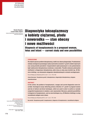 WYBRANE PROBLEMY KLINICZNE Dorota Drapała, Lucyna Holec-Gąsior Katedra Mikrobiologii, Wydział Chemiczny Politechniki Gdańskiej Diagnostyka toksoplazmozy u kobiety ciężarnej, płodu i noworodka — stan obecny i nowe możliwości Diagnosis of toxoplasmosis in a pregnant woman, fetus and infant — current study and new possibilities STRESZCZENIE W artykule opisano problem toksoplazmozy, skutki oraz obecną diagnostykę. Przedstawiono metody serologiczne pozwalające wykryć pierwotne zarażenie T. gondii u kobiet ciężarnych oraz szereg technik pośrednich i bezpośrednich wykorzystywanych w celu potwierdzenia bądź wykluczenia toksoplazmozy wrodzonej u noworodka. Ponadto wskazano potencjalne możliwości w diagnostyce toksoplazmozy, jakie niosą za sobą nowe techniki (np. 2D Western-blotting), czy stosowanie antygenów rekombinantowych w testach serologicznych. Forum Medycyny Rodzinnej 2013, tom 7, nr 4, 176–184 słowa kluczowe: Toxoplasma gondii, toksoplazmoza, diagnostyka toksoplazmozy, antygeny rekombinantowe ABSTRACT In this article, the problem of toxoplasmosis, ravages and current diagnostics were described. Serological assays detecting primary infection of T. gondii in pregnant women and lots of indirect and direct techniques, which are used in order to confirm or exclude congenital toxoplasmosis in newborn, were represented. Moreover, potential possibilities in diagnosis of toxoplasmosis, such as new techniques (e.g. 2D Western-blotting) or using recombinant antigens were shown. Adres do korespondencji: dr inż. Lucyna Holec-Gąsior Katedra Mikrobiologii, Wydział Chemiczny, Politechnika Gdańska ul. Narutowicza 11/12 80–233 Gdańsk tel.: (58) 347 24 06, faks: (58) 347 18 22 e-mail: [email protected] Forum Medycyny Rodzinnej 2013, vol 7, no 4, 176–184 key words: Toxoplasma gondii, toxoplasmosis, diagnosis of toxoplasmosis, recombinant antigens Copyright © 2013 Via Medica ISSN 1897–3590 176 www.fmr.viamedica.pl Dorota Drapała, Lucyna Holec-Gąsior Diagnostyka toksoplazmozy u kobiety ciężarnej, płodu i noworodka — stan obecny i nowe możliwości WSTĘP owoce, woda) zanieczyszczonego oocytami Toksoplazmoza, odzwierzęca choroba pa- wydalanymi z kałem kota. Do inwazji pasoży- sożytnicza ludzi i zwierząt stałocieplnych, ta może również dojść podczas przeszczepu wywoływana jest przez obligatoryjnego, narządów lub transfuzji krwi, a także podczas poliksenicznego, wewnątrzkomórkowego pracy z materiałem zakaźnym. Najbardziej pierwotniaka Toxoplasma gondii. Cykl życio- jednak niebezpieczną drogę zarażenia stano- wy pasożyta obejmuje proces rozmnażania wi transmisja pasożyta przez łożysko od cho- płciowego zachodzący u żywicieli ostatecz- rej matki, co może skutkować toksoplazmozą nych (zwierzęta z rodziny kotowatych, w tym wrodzoną płodu. Sytuacja taka jest możliwa, także koty domowe) oraz bezpłciowego, gdy kobieta w trakcie ciąży lub w okresie który występuje u żywicieli pośrednich (lu- krótko ją poprzedzającym zarazi się T. gondii dzie i inne ssaki oraz ptaki). Rozmnażanie (tzw. pierwotne zarażenie pasożytem). płciowe zachodzi w nabłonku jelita cienkiego kotowatych, skąd oocysty przedostają się do OBJAWY TOKSOPLAZMOZY I DIAGNOSTYKA światła jelita i wraz z kałem wydalane są do Toksoplazmoza u osób z prawidłowo funkcjo- środowiska zewnętrznego. W optymalnych nującym układem odpornościowym przebiega warunkach atmosferycznych (odpowiednia najczęściej bezobjawowo, natomiast poważne temperatura, wilgotność, obecność tlenu) następstwa choroba powoduje u osób z bra- oocysty przekształcają się w sporocysty, któ- kiem odporności (np. pacjenci z AIDS). Po- rych inwazyjność w sprzyjających warunkach ważne skutki niesie również wrodzona postać może zostać zachowana nawet przez kilka toksoplazmozy występująca u płodu zarażo- lat. W organizmie żywiciela pośredniego nego przez matkę (ryc. 1). Ryzyko zarażenia T. gondii rozprzestrzenia się drogą naczyń lim- drogą łożyskową zwiększa się wraz z czasem fatycznych i krwionośnych (w monocytach lub trwania ciąży, a ponadto czas potrzebny do granulocytach) do odległych narządów oraz zarażenia jest tym krótszy, w im późniejszym tkanek. Powstające w dużej liczbie tachyzo- okresie choruje ciężarna. Jednakże skutki dla ity niszczą komórki gospodarza, a następnie, płodu są najpoważniejsze, gdy do inwazji doj- u osób z prawidłowo funkcjonującym układem dzie w pierwszych miesiącach ciąży. W I try- odpornościowym, ulegają konwersji w formy mestrze prawdopodobieństwo przeniknięcia spoczynkowe — to znaczy bradyzoity [1]. T. gondii jest najmniejsze i wynosi 17–25%, Zarażenie T. gondii jest szeroko rozpo- natomiast transmisja pasożyta często prowa- wszechnione na całym świecie. Według Świa- dzi wtedy do poronienia. W II i III trymestrze towej Organizacji Zdrowia szacuje się, iż na- ciąży wzrasta prawdopodobieństwo przenik- wet 1/3 całej populacji ludzkiej uległa inwazji nięcia tachyzoitów do płodu (odpowiednio tym pasożytem. W różnych rejonach świata 25–50% i 60–90%), może dochodzić wówczas inna liczba ludzi została zarażona T. gondii, do bardzo poważnych zmian, takich jak wodo- a wpływ na to ma przede wszystkim klimat głowie, zwapnienie śródmózgowe czy uszko- (ciepły sprzyja rozwojowi oocyst), zwyczaje dzenie wzroku. Zdarzają się też przypadki żywieniowe i sanitarne. W Ameryce Połu- bezobjawowe, jak również takie, gdy objawy dniowej liczba chorych waha się w granicach pojawiają się dopiero po wielu latach [4]. 51–72%, w Afryce — 54–77%, a w Europie Środkowej wynosi około 58% populacji [2]. Diagnostyka toksoplazmozy jest bardzo złożona i obejmuje kilka różnych badań. Zarażenie ludzi pierwotniakiem T. gondii W celu identyfikacji T. gondii wykorzystuje się następuje głównie w wyniku spożycia niedogo- metody bezpośrednie umożliwiające wykry- t