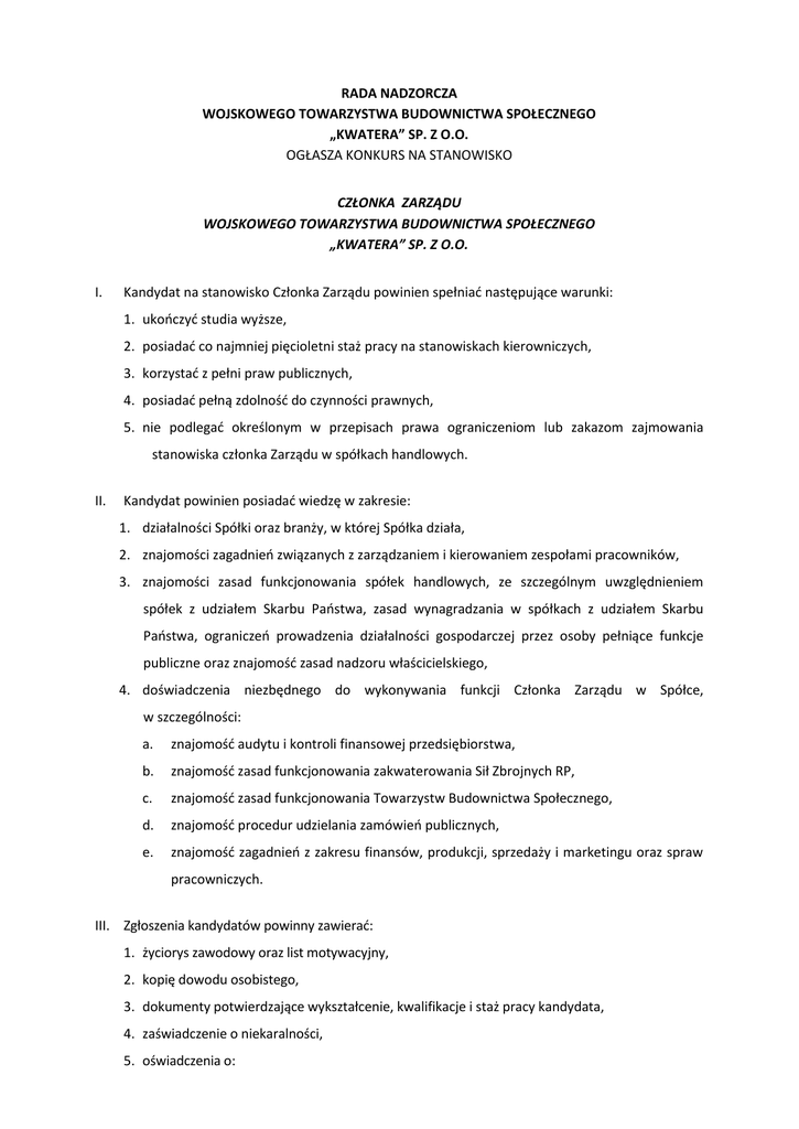 RADA NADZORCZA WOJSKOWEGO TOWARZYSTWA BUDOWNICTWA SPOŁECZNEGO „KWATERA” SP. Z O.O. OGŁASZA KONKURS NA STANOWISKO CZŁONKA ZARZĄDU WOJSKOWEGO TOWARZYSTWA BUDOWNICTWA SPOŁECZNEGO „KWATERA” SP. Z O.O. I. Kandydat na stanowisko Członka Zarządu powinien spełniać następujące warunki: 1. ukończyć studia wyższe, 2. posiadać co najmniej pięcioletni staż pracy na stanowiskach kierowniczych, 3. korzystać z pełni praw publicznych, 4. posiadać pełną zdolność do czynności prawnych, 5. nie podlegać określonym w przepisach prawa ograniczeniom lub zakazom zajmowania stanowiska członka Zarządu w spółkach handlowych. II. Kandydat powinien posiadać wiedzę w zakresie: 1. działalności Spółki oraz branży, w której Spółka działa, 2. znajomości zagadnień związanych z zarządzaniem i kierowaniem zespołami pracowników, 3. znajomości zasad funkcjonowania spółek handlowych, ze szczególnym uwzględnieniem spółek z udziałem Skarbu Państwa, zasad wynagradzania w spółkach z udziałem Skarbu Państwa, ograniczeń prowadzenia działalności gospodarczej przez osoby pełniące funkcje publiczne oraz znajomość zasad nadzoru właścicielskiego, 4. doświadczenia niezbędnego do wykonywania funkcji Członka Zarządu w Spółce, w szczególności: a. znajomość audytu i kontroli finansowej przedsiębiorstwa, b. znajomość zasad funkcjonowania zakwaterowania Sił Zbrojnych RP, c. znajomość zasad funkcjonowania Towarzystw Budownictwa Społecznego, d. znajomość procedur udzielania zamówień publicznych, e. znajomość zagadnień z zakresu finansów, produkcji, sprzedaży i marketingu oraz spraw pracowniczych. III. Zgłoszenia kandydatów powinny zawierać: 1. życiorys zawodowy oraz list motywacyjny, 2. kopię dowodu osobistego, 3. dokumenty potwierdzające wykształcenie, kwalifikacje i staż pracy kandydata, 4. zaświadczenie o niekaralności, 5. oświadczenia o: a. posiadaniu pełnej zdolności do czynności prawnych, b. korzystaniu z pełni praw publicznych, c. niepodleganiu określonym w przepisach prawa ograniczeniom lub zakazom zajmowania stanowiska Członka Zarządu w spółkach handlowych, d. nietoczeniu się wobec kandydata postępowania karnego, e. wyrażeniu zgody na przetwarzanie danych osobowych przez Spółkę dla celów postępowania kwalifikacyjnego, f. złożeniu oświadczenia lustracyjnego zgodnie z ustawą z dnia 18 października 2006 r. o ujawnianiu informacji o dokumentach organów bezpieczeństwa państwa z lat 19441990 oraz treści tych dokumentów (tj. Dz. U.z 2013 r. poz. 1388) - dotyczy kandydatów urodzonych przez dniem1 sierpnia 1972 roku, 6. adres korespondencyjny, adres e-mail, numer telefonu. Kandydaci mogą załączać do zgłoszenia również inne dokumenty potwierdzające posiadane kwalifikacje lub umiejętności (np. referencje, rekomendacje, certyfikaty). Wymagane dokumenty kandydat winien złożyć w oryginałach albo kserokopiach. W przypadku złożenia kserokopii dokumentów kandydat zobowiązany jest okazać Radzie Nadzorczej w trakcie rozmowy kwalifikacyjnej oryginały lub urzędowo poświadczone odpisy tych dokumentów. Dokumenty otrzymane przez Spółkę w związku z postępowaniem kwalifikacyjnym zostaną zwrócone kandydatom za pośrednictwem poczty na wskazany przez nich adres. IV. Zgłoszenie oraz wymagane dokumenty należy składać w zamkniętych kopertach zaadresowanych na Radę Nadzorczą Spółki Wojskowe Towarzystwo Budownictwa Społecznego „KWATERA” Sp. z o.o. z dopiskiem „Postępowanie kwalifikacyjne na stanowisko Członka Zarządu Spółki - nie otwierać”, w Biurze Zarządu Spółki, przy ul Starościńskiej 1 w Warszawie lub na adres Spółki: Wojskowe Towarzystwo Budownictwa Społecznego „KWATERA” Sp. z o.o. ul. Starościńska 1, 02-516 Warszawa, do dnia 3 grudnia 2015 roku do godz. 15:00. W przypadku przesłania zgłoszenia pocztą decyduje data wpływu do Sekretariatu w siedzibie Spółki. V. Zgłoszenia zostaną otwarte w dniu 4 grudnia 2015 roku o godz. 10:00. VI. Zgłoszenia kandydatów niespełniające wymogów określonych w ogłoszeniu o postępowaniu kwalifikacyjnym oraz złożone po terminie określonym w ogłoszeniu nie będą rozpatrywane. Złożone w Spółce zgłoszenia kandydatów nie mogą być uzupełniane. VII. Rozmowy kwalifikacyjne zostaną przeprowadzane od dnia 11 grudnia 2015 r., o czym kandydaci, zakwalifikowani do tego etapu postępowania, zostaną powiadomieni indywidualnie. Niezgłoszenie się kandydata na rozmowę kwalifikacyjną w określonym miejscu i terminie oznacza jego rezygnację z udziału w dalszym postępowaniu kwalifikacyjnym. VIII. Przedmiotem rozmowy kwalifikacyjnej będzie znajomość zagadnień określonych w pkt II ogłoszenia, przedstawienie przez kandydata koncepcji działalności Spółki. W trakcie rozmowy kwalifikacyjnej oceniane będzie również wykształcenie i doświadczenie zawodowe kandydata. W trakcie rozmowy kwalifikacyjnej kandydat może przedstawiać Radzie Nadzorczej dodatkowe dokumenty, inne niż wymagane w ogłoszeniu. IX. Dane o Spółce (sprawozdania roczne za lata 2012 - 2014) można uzyskać do wglądu w siedzibie Spółki od dnia ukazania się ogłoszenia o wszczęciu postepowania kwalifikacyjnego do dnia 30 listopada 2015 r., pod warunkiem złożenia przez kandydata oświadczenia o zobowiązaniu się do zachowania poufności udostępnianych informacji oraz uprzednim telefonicznym uzgodnieniu terminu w dni robocze w godz. 10:00 – 14:00. Osobą odpowiedzialną za udostępnienie dokumentów jest p. Beata Naruszkiewicz – Borowska (nr tel. 22 379-45-45). X. Postępowanie kwalifikacyjne może zostać zakończone bez wyłaniania kandydatów w każdym czasie, bez podania przyczyn. XI. O wyniku postępowania kwalifikacyjnego Rada Nadzorcza powiadamia kandydatów pisemnie w ciągu 7 dni od wyboru kandydata na stanowisko Członka Zarządu Spółki przez Zgromadzenie Wspólników Spółki. XII. Kandydatom nie będą zwracane jak