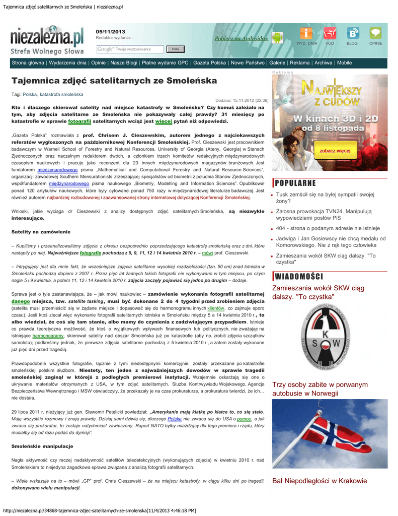 Tajemnica zdjęć satelitarnych ze Smoleńska | niezalezna.pl 05/11/2013 Pobierz na Androida» Redaktor wydania: - WYD. DNIA VOD BLOGI OPINIE Szukaj Strona główna | Wydarzenia dnia | Opinie | Nasze Blogi | Płatne wydanie GPC | Gazeta Polska | Nowe Państwo | Galerie | Reklama | Archiwa | Mobile Reklama Tajemnica zdjęć satelitarnych ze Smoleńska Tagi: Polska, katastrofa smoleńska Dodano: 15.11.2012 [22:36] Kto i dlaczego skierował satelity nad miejsce katastrofy w Smoleńsku? Czy komuś zależało na tym, aby zdjęcia satelitarne ze Smoleńska nie pokazywały całej prawdy? 31 miesięcy po katastrofie w sprawie fotografii satelitarnych wciąż jest więcej pytań niż odpowiedzi. „Gazeta Polska” rozmawiała z prof. Chrisem J. Cieszewskim, autorem jednego z najciekawszych referatów wygłoszonych na październikowej Konferencji Smoleńskiej. Prof. Cieszewski jest pracownikiem badawczym w Warnell School of Forestry and Natural Resources, University of Georgia (Ateny, Georgia) w Stanach Zjednoczonych oraz naczelnym redaktorem dwóch, a członkiem trzech komitetów redakcyjnych międzynarodowych czasopism naukowych i pracuje jako recenzent dla 23 innych międzynarodowych magazynów branżowych. Jest fundatorem międzynarodowego pisma „Mathematical and Computational Forestry and Natural Resource Sciences”, organizacji zawodowej Southern Mensurationists zrzeszającej specjalistów od biometrii z południa Stanów Zjednoczonych, współfundatorem międzynarodowego pisma naukowego „Biometry, Modelling and Information Sciences”. Opublikował ponad 120 artykułów naukowych, które były cytowane ponad 750 razy w międzynarodowej literaturze badawczej. Jest również autorem najbardziej rozbudowanej i zaawansowanej strony internetowej dotyczącej Konferencji Smoleńskiej. Wnioski, jakie wyciąga dr Cieszewski interesujące. z analizy dostępnych zdjęć satelitarnych Smoleńska, są niezwykle Satelity na zamówienie – Kupiliśmy i przeanalizowaliśmy zdjęcia z okresu bezpośrednio poprzedzającego katastrofę smoleńską oraz z dni, które nastąpiły po niej. Najważniejsze fotografie pochodzą z 5, 9, 11, 12 i 14 kwietnia 2010 r. – mówi prof. Cieszewski. – Intrygujący jest dla mnie fakt, że wcześniejsze zdjęcia satelitarne wysokiej rozdzielczości (tzn. 50 cm) znad lotniska w Smoleńsku pochodzą dopiero z 2007 r. Przez pięć lat żadnych takich fotografii nie wykonywano w tym miejscu, po czym nagle 5 i 9 kwietnia, a potem 11, 12 i 14 kwietnia 2010 r. zdjęcia zaczęły pojawiać się jedno po drugim – dodaje. Sprawa jest o tyle zastanawiająca, że – jak mówi naukowiec – zamówienie wykonania fotografii satelitarnej danego miejsca, tzw. satellite tasking, musi być dokonane 2 do 4 tygodni przed zrobieniem zdjęcia (satelita musi przemieścić się w żądane miejsce i dopasować się do harmonogramu innych klientów , co zajmuje sporo czasu). Jeśli ktoś zlecał więc wykonanie fotografii satelitarnych lotniska w Smoleńsku między 5 a 14 kwietnia 2010 r., to albo wiedział, że coś się tam stanie, albo mamy do czynienia z zadziwiającym przypadkiem. Istnieje co prawda teoretyczna możliwość, że ktoś o wyjątkowych wpływach finansowych lub politycznych, nie zważając na istniejące harmonogramy, skierował satelity nad obszar Smoleńska już po katastrofie (aby np. zrobić zdjęcia szczątków samolotu); podkreślmy jednak, że pierwsze zdjęcia satelitarne pochodzą z 5 kwietnia 2010 r., a zatem zostały wykonane już pięć dni przed tragedią. POPULAR NE Tusk zemścił się na byłej sympatii swojej żony? Żałosna prowokacja TVN24. Manipulują wypowiedziami posłów PiS 404 - strona o podanym adresie nie istnieje Jadwiga i Jan Gosiewscy nie chcą medalu od Komorowskiego. Nie z rąk tego człowieka Zamieszania wokół SKW ciąg dalszy. "To czystka" WIADOM OŚCI Zamieszania wokół SKW ciąg dalszy. "To czystka" Prawdopodobnie wszystkie fotografie, łącznie z tymi niedostępnymi komercyjnie, zostały przekazane po katastrofie smoleńskiej polskim służbom. Niestety, ten jeden z najważniejszych dowodów w sprawie tragedii smoleńskiej zaginął w którejś z podległych premierowi instytucji. Wzajemnie oskarżają się one o ukrywanie materiałów otrzymanych z USA, w tym zdjęć satelitarnych. Służba Kontrwywiadu Wojskowego, Agencja Bezpieczeństwa Wewnętrznego i MSW oświadczyły, że przekazały je na czas prokuraturze, a prokuratura twierdzi, że ich… nie dostała. Trzy osoby zabite w porwanym autobusie w Norwegii 29 lipca 2011 r. nieżyjący już gen. Sławomir Petelicki powiedział: „Amerykanie mają klatkę po klatce to, co się stało. Mają wszystkie rozmowy i znają prawdę. Dzisiaj sami dziwią się, dlaczego Polska nie zwraca się do USA o pomoc , a jak zwraca się prokurator, to zostaje natychmiast zawieszony. Raport NATO byłby miażdżący dla tego premiera i rządu, który musiałby się od razu podać do dymisji”. Smoleńskie manipulacje Nagła aktywność czy raczej nadaktywność satelitów teledetekcyjnych (wykonujących zdjęcia) w kwietniu 2010 r. nad Smoleńskiem to niejedyna zagadkowa sprawa związana z analizą fotografii satelitarnych. – Wiele wskazuje na to – mówi „GP” prof. Chris Cieszewski – że na miejscu katastrofy, w ciągu kilku dni po tragedii, dokonywano wielu manipulacji. http://niezalezna.pl/34868-tajemnica-zdjec-satelitarnych-ze-smolenska[11/4/2013 4:46:18 PM] Bal Niepodległości w Krakowie Tajemnica zdjęć satelitarnych ze Smoleńska | niezalezna.pl Najbardziej uderzające jest przesunięcie lewego statecznika samolotu o 50 m w kierunku centrum miejsca katastrofy, widoczne przy porównaniu zdjęć z 11 i 12 kwietnia 2010 r. W jakim celu tego dokonano? Nie wiadomo. Pewne jest za to, że w raporcie MAK pozycję statecznika określono według miejsca, w którym znalazł się on już po przeniesieniu. Prof. Cieszewski dokonał szczegółowej analizy porównawczej wysokorozdzielczych fot