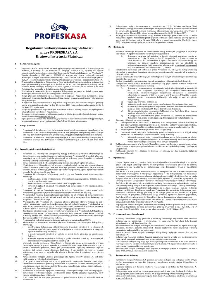 Regulamin wykonywania usług płatności przez PROFESKASA S.A.
