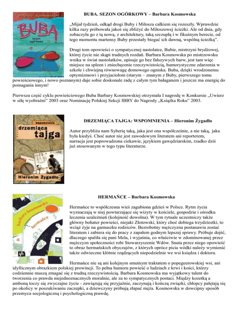 BUBA. SEZON OGÓRKOWY – Barbara Kosmowska „Mijał tydzień, odkąd drogi Buby i Miłosza całkiem się rozeszły. Wprawdzie kilka razy próbowała jakoś się zbliżyć do Miłoszowej ścieżki. Ale od dnia, gdy zobaczyła go z tą nową, z architektury, taką szczupłą i w fikuśnym berecie, od tego momentu martensy Buby przestały biegać ich dawną, wspólną ścieżką”. Drugi tom opowieści o sympatycznej nastolatce, Bubie, mistrzyni brydżowej, której życie nie skąpi trudnych rozdań. Barbara Kosmowska po mistrzowsku wnika w świat nastolatków, opisuje go bez fałszywych barw, jest tam więc miejsce na spleen i zniechęcenie rzeczywistością, humorystyczne zdarzenia w szkole i chwiejną równowagę domowego ogniska. Buba, dzięki wrodzonemu optymizmowi i przyjaciołom (starym – znanym z Buby, pierwszego tomu powieściowego, i nowo poznanym) daje sobie doskonale radę z całym tym bałaganem i jeszcze ma energię do pomagania innym! Pierwsza część cyklu powieściowego Buba Barbary Kosmowskiej otrzymała I nagrodę w Konkursie „Uwierz w siłę wyobraźni” 2003 oraz Nominację Polskiej Sekcji IBBY do Nagrody „Książka Roku” 2003. DRZEMIĄCA TAJGA: WSPOMNIENIA – Hieronim Żygadło Autor przybliża nam Syberię taką, jaka jest ona współcześnie, a nie taką, jaka była kiedyś. Choć autor nie jest zawodowym literatem ani reporterem, narracja jest poprowadzona ciekawie, językiem gawędziarskim, rzadko dziś już stosowanym w tego typu literaturze. HERMAŃCE – Barbara Kosmowska Hermańce to współczesna wieś zagubiona gdzieś w Polsce. Rytm życia wyznaczają w niej powtarzające się wizyty w kościele, gospodzie i ośrodku leczenia uzależnień (kolejność dowolna). W tym rytuale uczestniczy także główny bohater powieści, niejaki Złotowski, który choć dobiega trzydziestki, to wciąż żyje na garnuszku rodziców. Bezrobotny mężczyzna postanawia zostać literatem i zabiera się do pracy z zapałem godnym lepszej sprawy. Próbuje dojść, dlaczego spaliła się pani Mela, i wyjaśnia, co właściwie w zdominowanej przez mężczyzn społeczności robi Stowarzyszenie Wdów. Snuta przez niego opowieść to obraz hermańskich obyczajów, z których oprócz picia wódki należy wymienić także odwieczne kłótnie rządzących niepodzielnie we wsi księdza i doktora. Hermańce nie są ani kolejnym smutnym traktatem o popegeerowskiej wsi, ani idyllicznym obrazkiem polskiej prowincji. To pełna humoru powieść o ludziach z krwi i kości, którzy codziennie muszą zmagać się z trudną rzeczywistością. Barbara Kosmowska ma wyjątkowy talent do tworzenia co prawda niejednoznacznych moralnie, ale za to sympatycznych postaci. Między kozetką a amboną toczy się zwyczajne życie - zawiązują się przyjaźnie, zaczynają i kończą związki, chłopcy pałętają się po okolicy w poszukiwaniu zaczepki, a dziewczyny próbują złapać męża. Kosmowska w dowcipny sposób przemyca socjologiczną i psychologiczną prawdę. HOHAJ – Elisabeth Rynell Hohaj to dwie historie o miłości rozgrywające się w magicznej przestrzeni dalekiej Północy. Kobieta zrozpaczona śmiercią ukochanego wyrusza na śnieżne pustkowia dalekiej krainy Hohaj, gdzie zima trwa niemal cały rok. Niespodziewanie trafia tam na ślady poruszającej historii sprzed kilkudziesięciu lat. Poznaje losy tajemniczego włóczęgi Arona oraz Iny, która po raz pierwszy sprzeciwia się upokarzającemu ją ojcu. Lato wybucha w Hohaj tylko na krótką chwilę. Czy Aron i Ina zdążą się pokochać? Czy miłość może odwrócić zły los? Czy jest w stanie odkupić zbrodnię i zmazać hańbę? Czy jest silniejsza niż śmierć? JEDŹ, MÓDL SIĘ, KOCHAJ – Elizabeth Gilbert ...Jedz, módl się, kochaj to wspaniała książka. Szczera, płynąca prosto z serca, pełna przenikliwości i trafnych spostrzeżeń. Często kupuję ją przyjaciołom na prezent i wszyscy oni serdecznie mi za nią dziękują... (J. Caroll) Nim osiągnęła trzydziestkę, Elizabeth Gilbert miała wszystko, o czym powinna marzyć nowoczesna, wykształcona, ambitna Amerykanka - męża, dom za miastem, dobrą pracę. Mimo to nie była kobietą ani szczęśliwą, ani spełnioną. Nękał ją niepokój, smutek i rozterki. Przeszła przez wyczerpujący rozwód i popadła w ciężką depresję, przeżyła nieszczęśliwą miłość i całkowicie odrzuciła wszystko, czym, jak jej się zdawało, miała być. Jedz, módl się, kochaj mówi o tym, co może się zdarzyć, kiedy bierzemy odpowiedzialność za nasze własne zadowolenie z życia. Mówi również o przygodach, jakie mogą się przydarzyć kobiecie, która nie chce już dłużej starać się powielać utartych wyobrażeń. Jest to opowieść, która poruszy każdego, kto kiedykolwiek obudził się rano z nieodpartym pragnieniem zmian. NIEWINNY – Harlan Coben Dziewięć lat po wyjściu z więzienia Matt Hunter nadal wraca myślami do owego strasznego wieczoru, kiedy w przypadkowej, niesprowokowanej przez siebie bójce zabił człowieka. Wydarzenie to kładzie się cieniem na jego życiu i relacjach rodzinnych... ale w końcu wszystko ponownie zmierza ku szczęśliwej, ustabilizowanej przyszłości. Świeżo poślubiona, piękna, kochająca go żona Olivia spodziewa się dziecka, kariera prawnicza Matta nabiera rozpędu. Wydaje się, że nic nie zakłóci ich idylli -do czasu, kiedy decydują się kupić telefony komórkowe wyposażone w funkcję przekazu wideo. Kilka godzin po służbowym wyjeździe Olivii do innego miasta, na komórce Matta pojawia się wiadomość wysłana z telefonu żony: na krótkim filmiku widać Olivię i nieznanego mężczyznę w pokoju hotelowym... To dopiero początek serii zagadkowych wydarzeń następujących w lawinowym tempie: ktoś śledzi samochód Matta, policja typuje go na głównego podejrzanego w sprawie zabójstwa zakonnicy ze śladami operacji powiększania biustu, padają kolejne ofiary. Przeszłość powraca w najbardzi