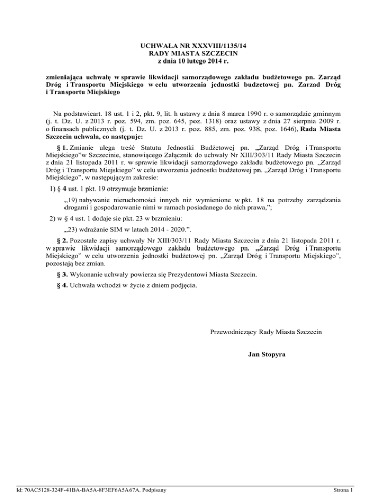 UCHWAŁA NR XXXVIII/1135/14 RADY MIASTA SZCZECIN z dnia 10 lutego 2014 r. zmieniająca uchwałę w sprawie likwidacji samorządowego zakładu budżetowego pn. Zarząd Dróg i Transportu Miejskiego w celu utworzenia jednostki budzetowej pn. Zarzad Dróg i Transportu Miejskiego Na podstawieart. 18 ust. 1 i 2, pkt. 9, lit. h ustawy z dnia 8 marca 1990 r. o samorządzie gminnym (j. t. Dz. U. z 2013 r. poz. 594, zm. poz. 645, poz. 1318) oraz ustawy z dnia 27 sierpnia 2009 r. o finansach publicznych (j. t. Dz. U. z 2013 r. poz. 885, zm. poz. 938, poz. 1646), Rada Miasta Szczecin uchwala, co następuje: § 1. Zmianie ulega treść Statutu Jednostki Budżetowej pn. „Zarząd Dróg i Transportu Miejskiego”w Szczecinie, stanowiącego Załącznik do uchwały Nr XIII/303/11 Rady Miasta Szczecin z dnia 21 listopada 2011 r. w sprawie likwidacji samorządowego zakładu budżetowego pn. „Zarząd Dróg i Transportu Miejskiego” w celu utworzenia jednostki budżetowej pn. „Zarząd Dróg i Transportu Miejskiego”, w następującym zakresie: 1) § 4 ust. 1 pkt. 19 otrzymuje brzmienie: „19) nabywanie nieruchomości innych niż wymienione w pkt. 18 na potrzeby zarządzania drogami i gospodarowanie nimi w ramach posiadanego do nich prawa,”; 2) w § 4 ust. 1 dodaje sie pkt. 23 w brzmieniu: „23) wdrażanie SIM w latach 2014 - 2020.”. § 2. Pozostałe zapisy uchwały Nr XIII/303/11 Rady Miasta Szczecin z dnia 21 listopada 2011 r. w sprawie likwidacji samorządowego zakładu budżetowego pn. „Zarząd Dróg i Transportu Miejskiego” w celu utworzenia jednostki budżetowej pn. „Zarząd Dróg i Transportu Miejskiego”, pozostają bez zmian. § 3. Wykonanie uchwały powierza się Prezydentowi Miasta Szczecin. § 4. Uchwała wchodzi w życie z dniem podjęcia. Przewodniczący Rady Miasta Szczecin Jan Stopyra Id: 70AC5128-324F-41BA-BA5A-8F3EF6A5A67A. Podpisany Strona 1