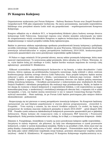 2014-10-09 IV Kongres Kolejowy Organizatorem wydarzenia jest Forum Kolejowe – Railway Business Forum oraz Zespół Doradców Gospodarczych TOR jako organizator techniczny. Na mocy porozumienia, marszałek województwa łódzkiego oraz prezydent miasta Łodzi stali się gospodarzami – współorganizatorami Kongresu Kolejowego. Kongres odbędzie się w obiekcie EC1, w bezpośredniej bliskości placu budowy nowego dworca kolejowego Łódź Fabryczna. Samorząd regionu oraz władze miejskie zobowiązały się także do zorganizowania wizyty uczestników Kongresu w zapleczu technicznym na Widzewie dla taboru eksploatowanego w ramach projektu Łódzka Kolej Aglomeracyjna. Będzie to pierwsza odsłona największego spotkania przedstawicieli branży kolejowej z politykami szczebla centralnego i lokalnego, która odbędzie się poza Warszawą. Głównymi tematami obrad będą inwestycje infrastrukturalne w unijnej perspektywie budżetowej 2014-2020, konkurencyjność przewozów pasażerskich oraz nowo powoływane wojewódzkie spółki kolejowe. - W Polsce w ciągu ostatnich 10 lat powstał zdrowy, mocny sektor przemysłu kolejowego, który mam zaszczyt reprezentować. To nowoczesna gałąź przemysłu, która odradza się w Polsce. Wierzymy, że to, czym będzie kolej już niedługo w Łodzi, będzie bardzo ważnym impulsem do rozwoju całej aglomeracji - powiedział H. Klimkiewicz. - Kilkuset uczestników, najwybitniejszych fachowców w tej branży, a także decydentów i ludzi biznesu, którzy zajmują się problematyką transportu szynowego, będą widzieli z okien centrum konferencyjnego budowę nowego dworca Łódź Fabryczna. Nasz projekt kolejowy będzie można zobaczyć z góry, ale także obejrzeć z bliska, i porozmawiać o dalszym jego rozwoju - dodał M. Cieślak. Zgodnie z zapowiedziami W. Stępnia, podziemny dworzec nie będzie jedyną omawianą łódzką inwestycją kolejową. - Chciałbym porozmawiać o wykorzystaniu prac studialnych dla Kolei Dużych Prędkości i określaniu perspektywy dla realizacji tego przedsięwzięcia. Myślę, że będzie to też okazja do rozmowy o liniach kolejowych w województwie łódzkim, o roli województwa na mapie komunikacyjnej kraju, o modernizacji i rewitalizacji istniejących obecnie linii, o wpisaniu ich w szlaki europejskie, o tym, czy będzie można inwestować w nie w ramach Connecting Europe Facility wyliczył marszałek. - Mam nadzieję, że po Forum Łódź będzie postrzegana jako miejsce dobrze skomunikowane - podsumował. - Rozpoczynają się też pierwsze w nowej perspektywie inwestycje kolejowe. Na Kongresie będziemy zastanawiali się nad błędami popełnionymi w starym okresie programowania - stwierdził A. Furgalski. - Trwa wyścig z czasem, by nie stracić środków unijnych. Co zrobić, by lepiej się przygotować do wydania znacznie większych pieniędzy w latach 2014-2020? - pytał ekspert ZDG TOR. - Ponadto rynek zwłaszcza dalekobieżnych kolejowych przewozów pasażerskich jest w głębokiej defensywie. Mamy kolejne złe rozpoczęcie roku w wykonaniu PKP Intercity i Przewozów Regionalnych. Kolej powinna konkurować nie z koleją, bo to błąd, a z transportem drogowym - dodał. Zdaniem A. Furgalskiego, światełkiem w tunelu są nowo powoływane kolejowe spółki wojewódzkie. Inicjatywy te należy wspierać, ale pilnować, by były one wkomponowane w rynek przewozów kolejowych, a także w system komunikacji miejskiej. Myślę tu na przykład o ŁKA, która musi stać się jedną tkanką z komunikacją publiczną w Łodzi - mówił ekspert. - Przewoźników może być wielu, ale aby kolej jako całość efektywnie wypełniała swoje funkcje, powinien obowiązywać wspólny system taryfowy - dodał H. Klimkiewicz. W organizacji IV Kongresu Kolejowego współuczestniczy m.in. Leszek Ruta, były dyrektor Zarządu Transportu Miejskiego w Warszawie, który jako pierwszy w Polsce doprowadził do utworzenia wspólnego obszaru taryfowego dla kolei i komunikacji miejskiej na obszarze Warszawy i pobliskich gmin. Kongres Kolejowy to największe i najbardziej prestiżowe wydarzenie konferencyjne poświęcone branży transportu szynowego w naszym kraju. Podczas zeszłorocznej edycji, 5 listopada 2013 r. w Warszawie spotkało się ponad 600 przedstawicieli biznesu, menadżerowie, jak również politycy najwyższego szczebla i samorządowcy, zainteresowani rozwojem transportu kolejowego i jego pozytywnym wpływem na całość polskiej gospodarki. III Kongres Kolejowy cieszył się także ogromnym zainteresowaniem mediów, nie tylko tych branżowych, ale także ogólnopolskich. Wydarzenie stało się okazją dla dziennikarzy do pozyskania kluczowych informacji na temat bieżących wydarzeń w sektorze poprzednie następne