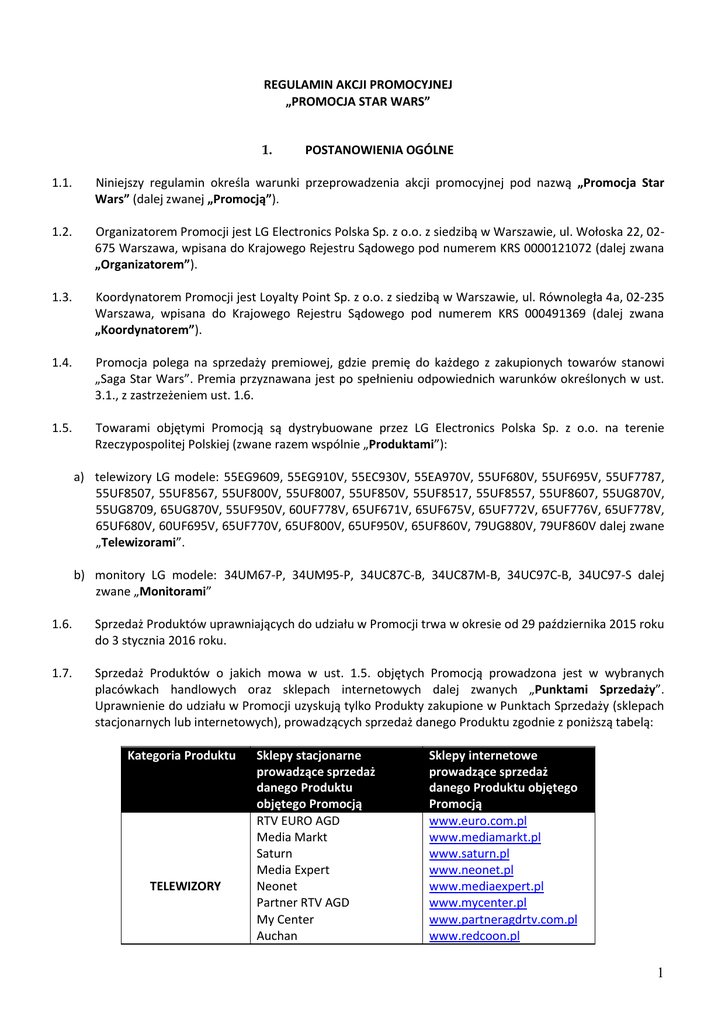 REGULAMIN AKCJI PROMOCYJNEJ „PROMOCJA STAR WARS” 1. POSTANOWIENIA OGÓLNE 1.1. Niniejszy regulamin określa warunki przeprowadzenia akcji promocyjnej pod nazwą „Promocja Star Wars” (dalej zwanej „Promocją”). 1.2. Organizatorem Promocji jest LG Electronics Polska Sp. z o.o. z siedzibą w Warszawie, ul. Wołoska 22, 02675 Warszawa, wpisana do Krajowego Rejestru Sądowego pod numerem KRS 0000121072 (dalej zwana „Organizatorem”). 1.3. Koordynatorem Promocji jest Loyalty Point Sp. z o.o. z siedzibą w Warszawie, ul. Równoległa 4a, 02-235 Warszawa, wpisana do Krajowego Rejestru Sądowego pod numerem KRS 000491369 (dalej zwana „Koordynatorem”). 1.4. Promocja polega na sprzedaży premiowej, gdzie premię do każdego z zakupionych towarów stanowi „Saga Star Wars”. Premia przyznawana jest po spełnieniu odpowiednich warunków określonych w ust. 3.1., z zastrzeżeniem ust. 1.6. 1.5. Towarami objętymi Promocją są dystrybuowane przez LG Electronics Polska Sp. z o.o. na terenie Rzeczypospolitej Polskiej (zwane razem wspólnie „Produktami”): a) telewizory LG modele: 55EG9609, 55EG910V, 55EC930V, 55EA970V, 55UF680V, 55UF695V, 55UF7787, 55UF8507, 55UF8567, 55UF800V, 55UF8007, 55UF850V, 55UF8517, 55UF8557, 55UF8607, 55UG870V, 55UG8709, 65UG870V, 55UF950V, 60UF778V, 65UF671V, 65UF675V, 65UF772V, 65UF776V, 65UF778V, 65UF680V, 60UF695V, 65UF770V, 65UF800V, 65UF950V, 65UF860V, 79UG880V, 79UF860V dalej zwane „Telewizorami”. b) monitory LG modele: 34UM67-P, 34UM95-P, 34UC87C-B, 34UC87M-B, 34UC97C-B, 34UC97-S dalej zwane „Monitorami” 1.6. Sprzedaż Produktów uprawniających do udziału w Promocji trwa w okresie od 29 października 2015 roku do 3 stycznia 2016 roku. 1.7. Sprzedaż Produktów o jakich mowa w ust. 1.5. objętych Promocją prowadzona jest w wybranych placówkach handlowych oraz sklepach internetowych dalej zwanych „Punktami Sprzedaży”. Uprawnienie do udziału w Promocji uzyskują tylko Produkty zakupione w Punktach Sprzedaży (sklepach stacjonarnych lub internetowych), prowadzących sprzedaż danego Produktu zgodnie z poniższą tabelą: Kategoria Produktu TELEWIZORY Sklepy stacjonarne prowadzące sprzedaż danego Produktu objętego Promocją RTV EURO AGD Media Markt Saturn Media Expert Neonet Partner RTV AGD My Center Auchan Sklepy internetowe prowadzące sprzedaż danego Produktu objętego Promocją www.euro.com.pl www.mediamarkt.pl www.saturn.pl www.neonet.pl www.mediaexpert.pl www.mycenter.pl www.partneragdrtv.com.pl www.redcoon.pl 1 Real Scheiver Media Markt Media Expert Neonet Euro RTV AGD Saturn Komputronik Perfect POOP Jarosław Kowasz Proline Sferis X-Kom Aleja PC Alsen Bit Computer Brawocom MONITORY 1.8. www.agito.pl www.alejapc.pl www.alsen.pl www.bitcomputer.pl www.komputronik.pl www.mediamarkt.pl www.mediaexpert.pl www.morele.net www.neonet.pl www.tan.io www.proline.pl www.euro.com.pl www.saturn.pl www.sferis.pl www.x-kom.pl www.zadowolenie.pl www.brawocom.pl Zakup Produktów w sklepach internetowych należy dokonać od godziny 00:00 dnia 29 października 2015 roku do godziny 23:59:59 dnia 3 stycznia 2016 roku ( o zachowaniu terminu decyduje data i godzina wpłynięcia zamówienia na serwer sklepu internetowego ) 2. UCZESTNICY PROMOCJI 2.1. Promocja przeznaczona jest wyłącznie dla zamieszkałych na terytorium Rzeczypospolitej Polskiej pełnoletnich osób fizycznych, nabywających Produkty, o których mowa w ust. 1.6., jako konsumenci w rozumieniu art. 221 Kodeksu cywilnego. 2.2. W Promocji nie mogą brać udziału pracownicy Organizatora i Koordynatora. W Promocji nie mogą brać udziału również członkowie rodzin osób powyżej wymienionych. Przez członków rodziny, o których mowa powyżej, rozumie się: wstępnych, zstępnych, rodzeństwo, małżonków i osoby pozostające w stosunku przysposobienia. 3. 3.1. a) b) c) 3.2. a) WARUNKI UDZIAŁU W PROMOCJI W celu wzięcia udziału w Promocji jej uczestnik powinien kolejno spełnić następujące warunki: w okresie, o jakim mowa w ust. 1.6., nabyć w jednym z Punktów Sprzedaży przynajmniej jeden Produkt oraz zachować oryginał dowodu zakupu (paragon lub fakturę) określający model zakupionego Produktu, oraz; w okresie od 29 października 2015 r. do 3 stycznia 2016 r. zarejestrować się na stronie internetowej: www.strefalg.pl/starwars zwanej dalej „Stroną Promocji”; po rejestracji o jakiej mowa w ust. 3.1. lit. b) w przeciągu 30 dni od daty zakupu i nie później niż do 11 stycznia 2016 r. zarejestrować Produkt na Stronie Promocji. Rejestrując się zgodnie z ust. 3.1 pkt b) uczestnik Promocji: podaje swoje następujące dane osobowe: 2 b) c) d) imię, nazwisko, datę urodzenia, adres zamieszkania, adres poczty elektronicznej, numer telefonu komórkowego, aktywowany w sieci operatora telefonii komórkowej korzystającego z polskich zasobów numeracji podaje i potwierdza proponowane hasło do logowania na Stronie Promocji; wyraża zgodę na przetwarzanie swoich danych osobowych w celu realizacji Promocji oraz w celach marketingowych Organizatora, może wyrazić zgodę na otrzymywanie informacji handlowych za pomocą środków komunikacji elektronicznej, w szczególności poczty elektronicznej. 3.3. Uczestnik Promocji, który dokonał rejestracji zgodnie z ust. 3.2. na podany adres poczty elektronicznej otrzyma wiadomość e-mail z prośbą o potwierdzenie rejestracji. Rejestracja powinna zostać potwierdzona w ciągu 48 godzin od wysłania e-maila z prośbą o potwierdzenie, poprzez wejście na podany w tym e-mailu link do podstrony Strony Promocji. W wypadku bezskutecznego upływu tego terminu, rejestracja będzie uważana za niedokonaną. 3.4. Dokonanie prawidłowej rejestracji zgodnie z ustępami 3.2. oraz 3.3. umożliwia logowanie się na Stronie Promocji z użyciem hasła podanego przez uczestnika oraz adresu e-mail uczestnika Promocji w charakterze loginu. 3.5. W celu rejestracji Produktu o jakiej mowa ust. 3.1. lit. c) uczestnik po zalogowaniu się na konto na St