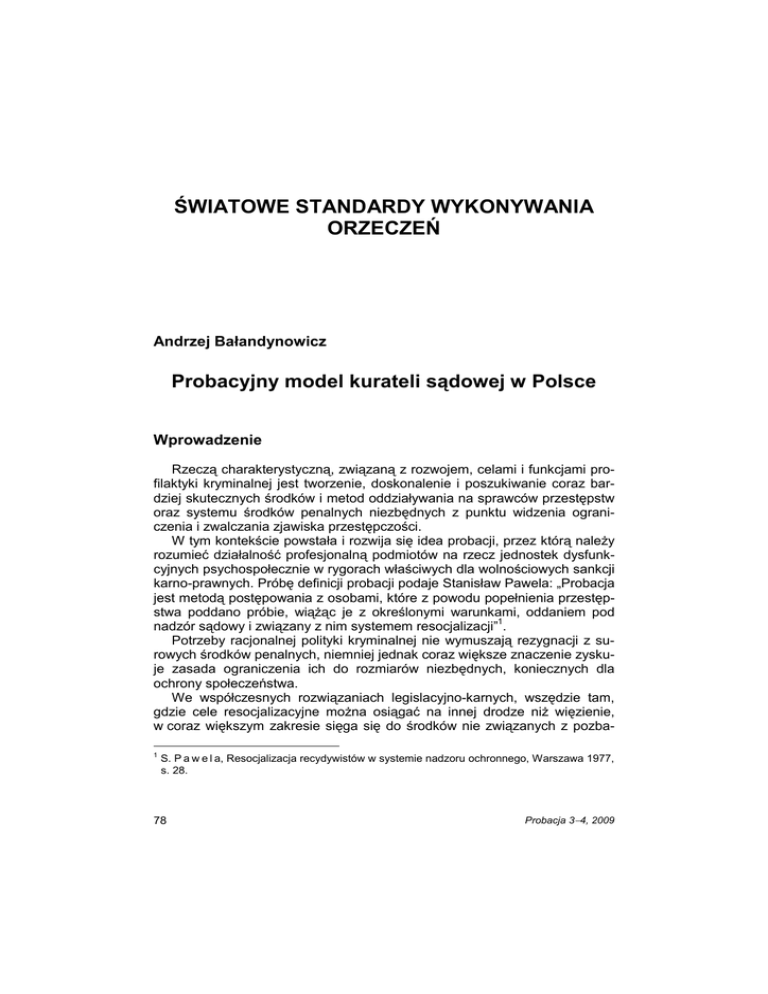 A. Bałandynowicz ŚWIATOWE STANDARDY WYKONYWANIA ORZECZEŃ Andrzej Bałandynowicz Probacyjny model kurateli sądowej w Polsce Wprowadzenie Rzeczą charakterystyczną, związaną z rozwojem, celami i funkcjami profilaktyki kryminalnej jest tworzenie, doskonalenie i poszukiwanie coraz bardziej skutecznych środków i metod oddziaływania na sprawców przestępstw oraz systemu środków penalnych niezbędnych z punktu widzenia ograniczenia i zwalczania zjawiska przestępczości. W tym kontekście powstała i rozwija się idea probacji, przez którą naleŜy rozumieć działalność profesjonalną podmiotów na rzecz jednostek dysfunkcyjnych psychospołecznie w rygorach właściwych dla wolnościowych sankcji karno-prawnych. Próbę definicji probacji podaje Stanisław Pawela: „Probacja jest metodą postępowania z osobami, które z powodu popełnienia przestępstwa poddano próbie, wiąŜąc je z określonymi warunkami, oddaniem pod nadzór sądowy i związany z nim systemem resocjalizacji”1. Potrzeby racjonalnej polityki kryminalnej nie wymuszają rezygnacji z surowych środków penalnych, niemniej jednak coraz większe znaczenie zyskuje zasada ograniczenia ich do rozmiarów niezbędnych, koniecznych dla ochrony społeczeństwa. We współczesnych rozwiązaniach legislacyjno-karnych, wszędzie tam, gdzie cele resocjalizacyjne moŜna osiągać na innej drodze niŜ więzienie, w coraz większym zakresie sięga się do środków nie związanych z pozba1 S. P a w e l a, Resocjalizacja recydywistów w systemie nadzoru ochronnego, Warszawa 1977, s. 28. 78 Probacja 3−4, 2009 Probacyjny model kurateli sądowej w Polsce wieniem wolności. Probacja moŜe i powinna być systemem poprawczym, który umoŜliwia skazanemu udany powrót do społeczeństwa, poprzez rzeczywisty wkład realizacji odwetowych, sprawiedliwości formalnej, sprawiedliwości wyrównawczej, dając jednocześnie szanse rehabilitacji w ramach kontrolowanej wolności2. Metodologia reformowania kurateli sądowej dla osób dorosłych Istotnym elementem systemu probacji jest kurator sądowy, którego naleŜy traktować jako autonomiczną instytucję prawną, wyodrębnioną w funkcjonalną całość ze względu na to, Ŝe w sposób praktycznie wyczerpujący realizuje dostatecznie waŜne zadania dla określonego typu stosunków społecznych3. Ten sposób prezentacji zagadnienia pozwala takŜe traktować instytucję prawną (kuratelę) jako sui qeneris system społeczny, przez który rozumie się uporządkowany w określony sposób zbiór elementów wzajemnie powiązanych i stanowiących jednolitą całość4. System społeczny jest zatem modelowym układem strukturalnym nastawionym na osiąganie pewnych celów, które realizowane są przez podmioty zorganizowane w określoną całość. A zatem instytucja kurateli sądowej moŜe być rozpatrywana jako taki właśnie system społeczny powołany do wykonywania określonych funkcji, zadań i czynności z zakresu polityki kryminalnej. Rozpatrywanie kurateli jako systemu w ramach szerszej zbiorowości – makrosystemu (probacja) narzuca potrzebę prowadzenia analiz reformatorskich w dwóch zasadniczych, wyodrębnionych ze względów poznawczych, płaszczyznach: – przedmiotowej, obejmującej cele, funkcje, środki oraz wzajemne powiązania między poszczególnymi zadaniami; – podmiotowej, obejmującej zbiór stosunków interpersonalnych, system stanowisk i pozycji społecznych uczestników systemu oraz instytucji uczestniczących w realizacji jego celów i wzajemne powiązania między nimi5. Analiza systemu społecznego w płaszczyźnie przedmiotowej prowadzona jest zazwyczaj za pośrednictwem opisu i oceny zadań, które mają w efekcie przynieść osiągnięcie załoŜonego celu. Mówiąc o ocenie działań realizujących cele systemu, mamy na myśli wartościowanie wzajemnych sprzęŜeń między poszczególnymi zadaniami i ich grupami z punktu widzenia współ2 H. K o ł a k o w s k a - P r z e ł o m i e c, Zapobieganie przestępczości – studium kryminologiczne, Wrocław 1984, s. 49 i n. 3 K. O p a ł e k, J. W r ó b l e w s k i, Zagadnienia teorii prawa, Warszawa 1969, s. 93. 4 J. Z i e l e n i e w s k i, Organizacja zespołów ludzkich, Warszawa 1967, s. 46. 5 M. M a z u r, Cybernetyczna teoria układów samodzielnych, Warszawa 1966, s. 57. Probacja 3−4, 2009 79 A. Bałandynowicz przyczyniania się do realizacji celu głównego6. Zadania jednorazowe bądź rodzajowo zbliŜone do siebie, powtarzające się, moŜliwie stabilne, które są jednocześnie środkami do osiągnięcia celu końcowego, nazywamy funkcjami7. Za Parsonsem wyróŜnić moŜna w kaŜdym systemie społecznym cztery zasadnicze funkcje: – funkcję zewnętrzno-celowościową, – funkcję zewnętrzno-instrumentalną, – funkcję wewnętrzno-celowościową, – funkcję wewnętrzno-instrumentalną8. Funkcja zewnętrzno-celowościowa polega na zrealizowaniu przez dany system społeczny celu, który tenŜe system społeczny pełni na rzecz środowiska zewnętrznego (całego społeczeństwa). Funkcja zewnętrzno-instrumentalna sprowadza się do przystosowania realizacji celów do konkretnych warunków, kształtowaniu tych warunków w taki sposób, aby osiągnięcie załoŜonych celów stało się moŜliwe, wyborze osób objętych działaniem tego systemu oraz takie oznaczenie zasad kooperacji tego systemu z innymi podsystemami powiązanymi funkcjonalnie, aby osiągnąć załoŜony cel. Funkcja wewnętrzno-celowościowa dotyczy zabiegów polegających na ustaleniu celów etapowych (środków do celu głównego) i ich realizacji. Funkcja wewnętrzno-instrumentalna obejmuje wielopodmiotowe działania umoŜliwiające kooperację (pobudzanie, porozumiewanie się), a zatem te zadania, które umoŜliwiają osiągnięcie postulowanej organizacji działaniami oraz likwidowanie napięć i konfliktów wewnętrznie dezintegrujących system9. Zaproponowany schemat analityczny pozwoli przejrzyście przedstawić regulację 