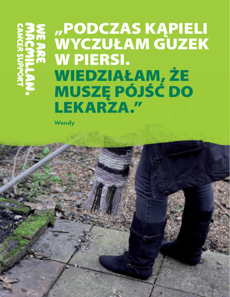 „PODCZAS KĄPIELI WYCZUŁAM GUZEK W PIERSI. WIEDZIAŁAM, ŻE MUSZĘ PÓJŚĆ DO LEKARZA.” Quote name Wendy Objawy raka piersi Rak piersi to pierwszy pod względem częstości występowania nowotwór u kobiet w Wielkiej Brytanii. Występuje najczęściej u kobiet w wieku ponad 50 lat, a 1 na 3 przypadki dotyczy kobiet w wieku ponad 70 lat. Mężczyźni także chorują na raka piersi, ale jest to rzadkie. Wiedza na temat zmian, na które należy zwracać uwagę oraz kiedy pójść do lekarza, może okazać się decydująca. Nie należy się bać, jeśli wykryje się u siebie objawy choroby – trzeba się wówczas przebadać. W przypadku zauważenia u siebie którychkolwiek z poniższych objawów należy zgłosić się do lekarza: • Guzek lub zgrubienie w piersi lub w pasze • Zmiana wielkości lub kształtu piersi • Zmiana dotycząca brodawki sutkowej, np. wysypka, wydzielina lub wciągnięcie brodawki • Zmiana na skórze piersi, np. pojawienie się zmarszczenia lub wgłębienia • Ciągłe poczucie dyskomfortu lub bólu w piersi Należy nauczyć się, jak wyglądają własne piersi i jakie są w dotyku. W przypadku pojawienia się zmian będzie łatwo wcześnie je zauważyć. Nie marnuje się czasu lekarza, zgłaszając się na badanie. Im wcześniej rak piersi zostanie zdiagnozowany, tym większe prawdopodobieństwo, że uda się go z powodzeniem leczyć. Jeśli potrzebujesz wsparcia lub chcesz z kimś porozmawiać, zadzwoń pod bezpłatny numer organizacji Macmillan 0808 808 00 00 lub odwiedź stronę internetową macmillan.org.uk. Większość zmian piersi nie jest spowodowana przez raka. Jednak w przypadku zauważenia u siebie nietypowych objawów należy zgłosić się do lekarza. © Macmillan Cancer Support, lipiec 2014 r. Wydanie 1. MAC13693_BREAST_POLISH. Następna zaplanowana edycja tekstu – 2017 r. Macmillan Cancer Support, organizacja charytatywna zarejestrowana w Anglii i Walii (261017), Szkocji (SC039907) oraz na Wyspie Man (604). Wydrukowano przy użyciu materiałów przyjaznych dla środowiska. Przeznaczone do recyklingu.