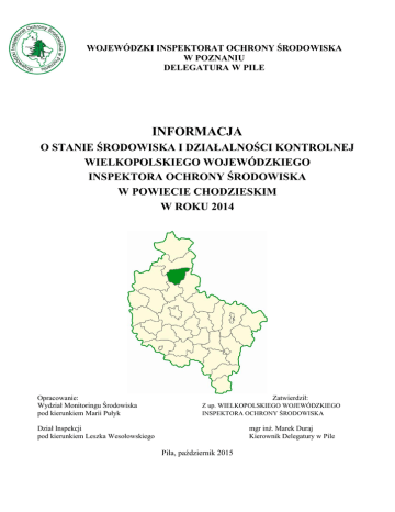 WOJEWÓDZKI INSPEKTORAT OCHRONY ŚRODOWISKA W POZNANIU DELEGATURA W PILE INFORMACJA O STANIE ŚRODOWISKA I DZIAŁALNOŚCI KONTROLNEJ WIELKOPOLSKIEGO WOJEWÓDZKIEGO INSPEKTORA OCHRONY ŚRODOWISKA W POWIECIE CHODZIESKIM W ROKU 2014 Opracowanie: Wydział Monitoringu Środowiska pod kierunkiem Marii Pułyk Zatwierdził: Z up. WIELKOPOLSKIEGO WOJEWÓDZKIEGO INSPEKTORA OCHRONY ŚRODOWISKA Dział Inspekcji pod kierunkiem Leszka Wesołowskiego mgr inż. Marek Duraj Kierownik Delegatury w Pile Piła, październik 2015 2 SPIS TREŚCI 1. 2. 3. WPROWADZENIE ..................................................................................................................... 4 WYBRANE CECHY POWIATU ............................................................................................... 5 STAN ŚRODOWISKA................................................................................................................ 7 3.1. Monitoring jakości powietrza ................................................................................................ 7 3.2. Monitoring jakości wód......................................................................................................... 8 3.2.1. Monitoring jakości wód powierzchniowych .................................................................. 8 3.2.2. monitoring jakości wód podziemnych ......................................................................... 11 3.3. Monitoring jakości gleby i ziemi......................................................................................... 12 3.4. Monitoring hałasu................................................................................................................ 12 3.5. Monitoring pól elektromagnetycznych ............................................................................... 13 3.6. Monitoring gospodarki odpadami ....................................................................................... 14 3.7. Podsumowanie i wnioski ..................................................................................................... 16 4. DZIAŁALNOŚĆ KONTROLNA .............................................................................................. 18 5. POWAŻNE AWARIE ............................................................................................................... 19 3 1. WPROWADZENIE Opracowanie ma na celu przedstawienie stanu środowiska oraz wyników działalności kontrolnej Wielkopolskiego Wojewódzkiego Inspektora Ochrony Środowiska na terenie powiatu chodzieskiego w roku 2014. Do jego przygotowania wykorzystano badania własne WIOŚ w Poznaniu, wyniki badań będące w posiadaniu WIOŚ oraz ustalenia z kontroli użytkowników środowiska, prowadzonych przez inspektorów WIOŚ. Bieżące informacje dotyczące stanu środowiska na terenie całego województwa wielkopolskiego znaleźć można na stronie internetowej www.poznan.wios.gov.pl. Zadania w zakresie ochrony przyrody, w tym ustanawianie form ochrony przyrody oraz sprawowanie nadzoru nad przestrzeganiem określonych ustawą zakazów w stosunku do tych form, realizuje Regionalny Konserwator Przyrody. 4 2. WYBRANE CECHY POWIATU Powiat chodzieski położony jest w centralnej części województwa wielkopolskiego, obejmuje obszar o powierzchni 685,06 km2, a zamieszkuje go 47639 osób (stan na dzień 31.12.2014, wg GUS). Według podziału fizyczno-geograficznego J. Kondrackiego powiat ten położony jest: – w makroregionie Pradolina Toruńsko-Eberswaldzka: mezoregion Dolina Środkowej Noteci, – w makroregionie Pojezierze Wielkopolskie: mezoregion Pojezierze Chodzieskie. Powiat chodzieski ma charakter rolniczo-przemysłowy; użytki rolne zajmują około 54% powierzchni. Administracyjnie powiat podzielony jest na: jedną gminę miejską: Chodzież, dwie gminy miejsko-wiejskie: Margonin, Szamocin, dwie gminy wiejskie: Budzyń, Chodzież. Ponad 94,37% ludności powiatu korzysta z sieci wodociągowej, a 75,27% z sieci kanalizacyjnej (stan na dzień 31 grudnia 2013, dane wg GUS). W ewidencji WIOŚ w Poznaniu znajduje się 5 mechaniczno-biologicznych oczyszczalni ścieków eksploatowanych na terenie powiatu chodzieskiego, w tym jedna oddana do użytku po zakończeniu modernizacji w 2012 roku (Oczyszczalnia Wyszyny – Gmina Budzyń). Dane o ilości ścieków pochodzą z Wykazów zawierających zbiorcze zestawienia informacji o zakresie korzystania ze środowiska oraz o wysokości należnych opłat. Lp. Gmina 1 Budzyń 2 Budzyń 3 Margonin Miejscowość/Eksploatujący Budzyń / Gminny Zakład Wodociągów i Kanalizacji Wyszyny / Gminny Zakład Wodociągów i Kanalizacji Margonin / Zakład Gospodarki Komunalnej w Margoninie Obszar obsługiwany Budzyń, Brzekiniec, Sokołowo Budzyńskie, Dziewoklucz, Nabrzeżno Wyszyny, Bukowiec, Prosna, Ostrówki Margonin, Pietronki 4 Chodzież Studzieniec – Łęg / MWiK Sp.z o.o. Nietuszkowo, Milcz, Kamionka, Kierzkowice, Oleśnica Rataje, Strzelce, Podanin, Zachrzyn, Wymysław, Stróżewo, Krystynki 5 Szamocin Szamocin / Zakład Gospodarki Komunalnej i Mieszkaniowej Szamocin, Laskowo Ilość ścieków w roku 2014 /m3/ 205 555 71 450 324 296 1 182 863 158 681 Powiat chodzieski wchodzi w skład regionu I gospodarki odpadami komunalnymi w województwie wielkopolskim. Regiony zostały wydzielone w „Planie gospodarki odpadami dla województwa wielkopolskiego na lata 2012-2017” uchwalonym przez Sejmik Województwa Wielkopolskiego w dniu 27 sierpnia 2012 r. Wielkopolskę podzielono na 10 regionów, w których wyznaczono regionalne i zastępcze instalacje do przetwarzania odpadów komunalnych. Region gospodarki odpadami komunalnymi to określony w wojewódzkim planie gospodarki odpadami obszar zamieszkiwany co najmniej przez 150 000 mieszkańców. Regionem gospodarki odpadami komunalnymi może być też gmina licząca powyżej 500 000 mieszkańców. Regionalna instalacja do przetwarzania odpadów komunalnych (RIPOK) to zakład zagospodarowania odpadów o mocy prz