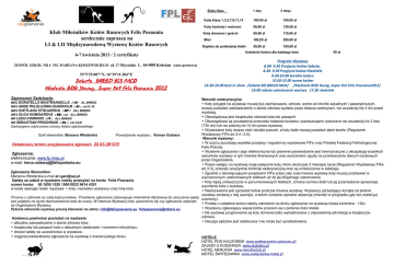 Entry fees: Klub Miłośników Kotów Rasowych Felis Posnania serdecznie zaprasza na LI & LII Międzynarodową Wystawę Kotów Rasowych 6-7 kwietnia 2013 / 2 certyfikaty ZESPÓŁ SZKÓŁ NR 4 IM. MARIANA KOSZEWSKIEGO ul. 27 Stycznia 1, 64-000 Kościan (sala sportowa) 52°5'25.007"N, 16°39'11.304"E Sobota BREED BIS MCO Niedziela BOB Young, Super Kot Felis Posnania 2012 1 day 2 days Koty klasy 1,3,5,7,9,11,12 100,00 zł 160,00 zł Koty kastraty i weterani 80,00 zł 130,00 zł Koty domowe i goście wystawy Miot 60,00 zł 110,00 zł 180,00 zł 280,00 zł Dopłata do podwójnej klatki 50,00 zł 100,00 zł Ustalenie koloru dla każdego kota 50 zł Program Wystawy 8.00- 9.30 Przyjęcia kotów Sobota, 8.30- 9.30 Przyjęcia kotów Niedziela 9.30-10.00 korekta koloru 10.00-15.00 ocena kotów 16.30-19.00 best in show /Sobota BIS BREED MCO/ /Niedziela BOB Young, Super Kot Felis Posnania2012/ 19.00 sobota zakończenie wystwy 17.30 niedziela Zaproszeni Sędziowie: Warunki weterynaryjne: • Koty przyjęte na wystawę muszą być zachipowane, zdrowe, wolne od chorób zakaźnych i pasożytniczych, muszą posiadać zaświadczenie o stanie zdrowia wydane przez lekarza weterynarii, nie wcześniej niż 3 dni przed wystawą. • Obowiązkowa jest książeczka zdrowia kota lub paszport. • Obowiązkowe są szczepienia przeciwko katarowi kociemu i panleukopenii wykonane nie wcześniej niż 2 lata (730 dni) lub nie później niż 15 dni przed wystawą. Zastrzegamy sobie prawo zmiany składu sędziowskiego • Wystawiane koty musza mieć obcięte pazurki, a koty białe muszą posiadać atest słuchu (Regulamin Wystawowy FIFe art.3.4 i 3.5). Szef stewardów: Marzena Włodarska Prowadzenie wystawy:: Roman Grabara Warunki wystawy: • W użyciu pozostają wszelkie przepisy i regulaminy wystawowe FIFe oraz Polskiej Federacji Felinologicznej Ostateczny termin przyjmowania zgłoszeń 22.03.2013!!! Felis Polonia. • Wysłanie zgłoszenia i jego elektroniczne lub pisemne potwierdzenie jest równoznaczne z akceptacją wszelkich Zgłoszenia: warunków wystawy w tym również finansowych oraz wyrażeniem zgody na przetwarzanie danych osobowych elektronicznie: www.fp.miau.pl przez Organizatora. e-mail: [email protected] • Prawo wstępu na wystawę mają wyłącznie koty, które ukończyły 3 miesiące życia (Regulamin Wystawowy FIFe art.3.3), przeszły pozytywnie kontrolę weterynaryjną oraz są umieszczone w katalogu. Zgłoszenia Stewardów: • Zgodnie z obowiązującymi przepisami FIFe przez cały czas trwania wystawy koty muszą przebywać w Marzena Włodarska e-mail [email protected] wyznaczonych udekorowanych klatkach aż do jej oficjalnego zakończenia. Opłaty za udział w wystawie należy przesyłać na konto Felis Posnania • Koty będą umieszczone w ponumerowanych klatkach, zmiana numeru klaki lub jej przeniesienie spowoduje numer konta: 50 1050 1520 1000 0022 9614 4351 wycofanie kota z wystawy. w tytule wpisując hasło ‘wystawa’ + imię i nazwisko wystawcy oraz imię kota • Niedozwolona jest sprzedaż kotów podczas trwania wystawy. Wystawcy sprzedający kocięta na terenie wystawy zostaną z niej usunięci, a kotom zostanie wpisana absencja (również w przypadku gdy kot został już Prosimy o zabranie ze sobą kopii przelewu. Przesłanie zgłoszenia zobowiązuje materialnie Wystawcę do uiszczenia opłaty oceniony). bez względu na wynik doprowadzenia kota do oceny. W interesie Wystawcy leży upewnienie się czy zgłoszenie wpłynęło • Prośbę o ustalenie koloru należy zamieścić na druku zgłoszenia na wystawę (klasa kontrolna - 13b). do Organizatora Wystawy. • Wystawcy zgłaszający więcej kotów proszeni są o podanie ilości klatek. Pytania odnośnie wystawy proszę kierować na adres: [email protected] [email protected] • Na wystawę przyjmowane są koty domowe tylko wykastrowane z odpowiednią adnotacją w książeczce zdrowia. Hodowca powinnien posiadać na wystawie: • Decyzja sędziów jest ostateczna i nie może być oprotestowana. • aktualne zaświadczenie o stanie zdrowia kota; MRS DONATELLA MASTRANGELLO / IT/ AL BREED MRS ANNE PALOLUOMA-SUNDHOLM / FI / cat II i III MRS SVETLANA STOLIAROVA / BY / ALL BREED MRS OLGA KOMISAROVA / EE / cat ALL BREED MR LUIGI COMORIO / IT / ALL BREED MR SEBASTIAN PRUCHNIAK / PL / cat I,II,III • książeczkę lub paszport kota z aktualnymi badaniami i numerem mikrochipu; • dowód opłaty za uczestnictwo w wystawie; • oryginał potwierdzenia zgłoszenia na wystawę z macierzystego klubu. HOTELE HOTEL POD KACZOREM www.podkaczorem.piotrowo.pl/ ZAJAZD U DUDZIARZA www.dudziarz.pl HOTEL NENUFAR www.nenufarclub.pl MOTEL ŚWITEZIANKA www.switezianka-motel.pl