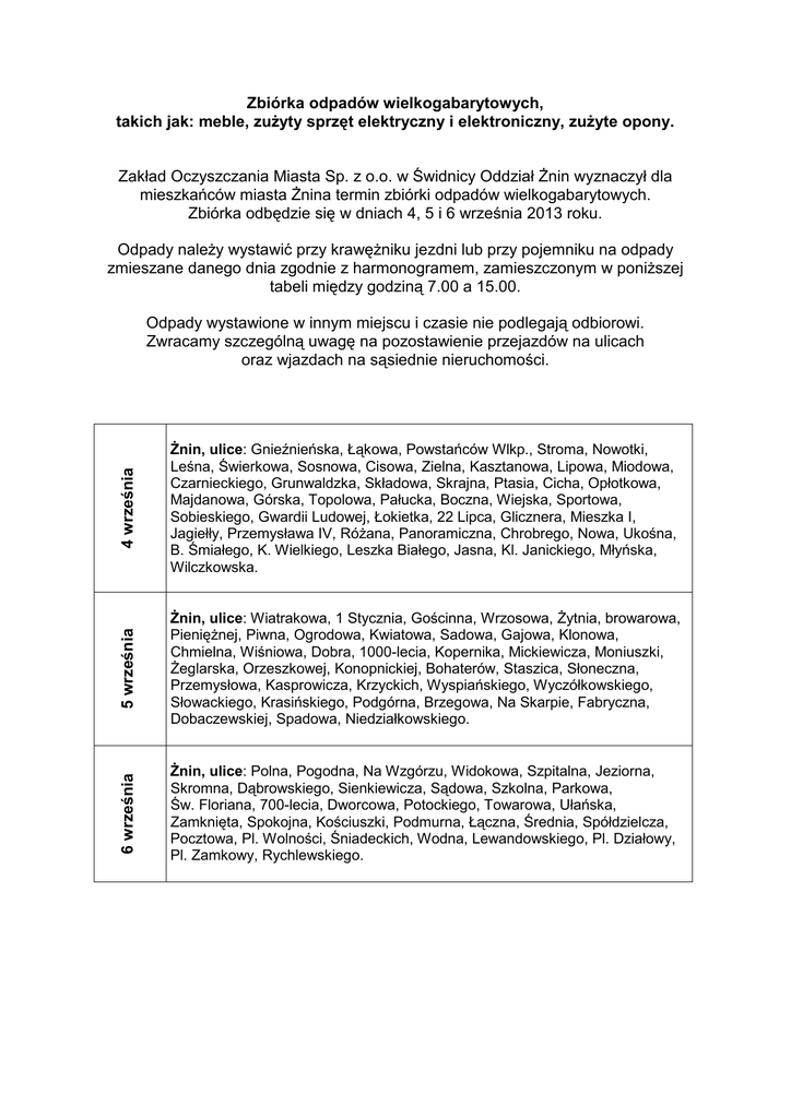 Zbiórka odpadów wielkogabarytowych, takich jak: meble, zużyty sprzęt elektryczny i elektroniczny, zużyte opony. Zakład Oczyszczania Miasta Sp. z o.o. w Świdnicy Oddział Żnin wyznaczył dla mieszkańców miasta Żnina termin zbiórki odpadów wielkogabarytowych. Zbiórka odbędzie się w dniach 4, 5 i 6 września 2013 roku. Odpady należy wystawić przy krawężniku jezdni lub przy pojemniku na odpady zmieszane danego dnia zgodnie z harmonogramem, zamieszczonym w poniższej tabeli między godziną 7.00 a 15.00. 4 września Żnin, ulice: Gnieźnieńska, Łąkowa, Powstańców Wlkp., Stroma, Nowotki, Leśna, Świerkowa, Sosnowa, Cisowa, Zielna, Kasztanowa, Lipowa, Miodowa, Czarnieckiego, Grunwaldzka, Składowa, Skrajna, Ptasia, Cicha, Opłotkowa, Majdanowa, Górska, Topolowa, Pałucka, Boczna, Wiejska, Sportowa, Sobieskiego, Gwardii Ludowej, Łokietka, 22 Lipca, Glicznera, Mieszka I, Jagiełły, Przemysława IV, Różana, Panoramiczna, Chrobrego, Nowa, Ukośna, B. Śmiałego, K. Wielkiego, Leszka Białego, Jasna, Kl. Janickiego, Młyńska, Wilczkowska. 5 września Żnin, ulice: Wiatrakowa, 1 Stycznia, Gościnna, Wrzosowa, Żytnia, browarowa, Pieniężnej, Piwna, Ogrodowa, Kwiatowa, Sadowa, Gajowa, Klonowa, Chmielna, Wiśniowa, Dobra, 1000-lecia, Kopernika, Mickiewicza, Moniuszki, Żeglarska, Orzeszkowej, Konopnickiej, Bohaterów, Staszica, Słoneczna, Przemysłowa, Kasprowicza, Krzyckich, Wyspiańskiego, Wyczółkowskiego, Słowackiego, Krasińskiego, Podgórna, Brzegowa, Na Skarpie, Fabryczna, Dobaczewskiej, Spadowa, Niedziałkowskiego. 6 września Odpady wystawione w innym miejscu i czasie nie podlegają odbiorowi. Zwracamy szczególną uwagę na pozostawienie przejazdów na ulicach oraz wjazdach na sąsiednie nieruchomości. Żnin, ulice: Polna, Pogodna, Na Wzgórzu, Widokowa, Szpitalna, Jeziorna, Skromna, Dąbrowskiego, Sienkiewicza, Sądowa, Szkolna, Parkowa, Św. Floriana, 700-lecia, Dworcowa, Potockiego, Towarowa, Ułańska, Zamknięta, Spokojna, Kościuszki, Podmurna, Łączna, Średnia, Spółdzielcza, Pocztowa, Pl. Wolności, Śniadeckich, Wodna, Lewandowskiego, Pl. Działowy, Pl. Zamkowy, Rychlewskiego.