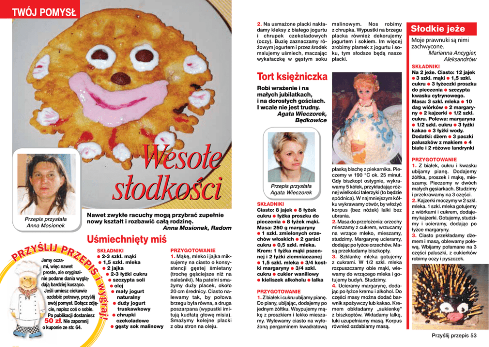 TWÓJ POMYSŁ 2. Na usmażone placki nakładamy kleksy z białego jogurtu i chrupek czekoladowych (oczy). Buzię zaznaczamy różowym jogurtem i przez środek malujemy uśmiech, maczając wykałaczkę w gęstym soku malinowym. Nos robimy z chrupka. Wypustki na brzegu placka również dekorujemy jogurtem i sokiem. Im więcej zrobimy plamek z jogurtu i soku, tym słodsze będą nasze placki. Tort księżniczka Robi wrażenie i na małych jubilatkach, i na dorosłych gościach. I wcale nie jest trudny. Agata Wieczorek, Będkowice Wesołe słodkości Przepis przysłała Anna Mosionek Nawet zwykłe racuchy mogą przybrać zupełnie nowy kształt i rozbawić całą rodzinę. Anna Mosionek, Radom Uśmiechnięty miś SKŁADNIKI ● 2-3 szkl. mąki Jemy ocza● 1,5 szkl. mleka mi, więc nawet ● 2 jajka proste, ale oryginal● 2-3 łyżki cukru nie podane dania wyglą● szczypta soli dają bardziej kusząco. ● olej Jeśli umiesz ciekawie ● mały jogurt ozdobić potrawy, przyślij naturalny swój pomysł. Dołącz zdję● duży jogurt truskawkowy cie, napisz coś o sobie. ● chrupki Po publikacji dostaniesz czekoladowe 50 zł. Nie zapomnij ● gęsty sok malinowy o kuponie ze str. 64. PRZYGOTOWANIE 1. Mąkę, mleko i jajka miksujemy na ciasto o konsystencji gęstej śmietany (trochę gęściejsze niż na naleśniki). Na patelni smażymy duży placek, około 20 cm średnicy. Ciasto nalewamy tak, by połowa brzegu była równa, a druga poszarpana (wypustki imitują kudłatą głowę misia). Smażymy kolejne placki z obu stron na oleju. płaską blachę z piekarnika. Pieczemy w 190 °C ok. 25 minut. Gdy biszkopt ostygnie, wykraPrzepis przysłała wamy 5 kółek, przykładając różnej wielkości talerzyki (to będzie Agata Wieczorek spódnica). W najmniejszym kółku wykrawamy otwór, by włożyć SKŁADNIKI korpus (bez nóżek) lalki bez Ciasto: 8 jajek ● 8 łyżek ubrania. cukru ● łyżka proszku do 2. Masa do przełożenia: orzechy pieczenia ● 8 łyżek mąki. mieszamy z cukrem, wrzucamy Masa: 250 g margaryny na wrzące mleko, mieszamy, ● 1 szkl. zmielonych orzestudzimy. Margarynę ucieramy, chów włoskich ● 2 garści dodając po łyżce orzechów. Macukru ● 0,5 szkl. mleka. są przekładamy biszkopty. Krem: 1 łyżka mąki pszen3. Szklankę mleka gotujemy nej i 2 łyżki ziemniaczanej ● 1,5 szkl. mleka ● 3/4 kost- z cukrami. W 1/2 szkl. mleka rozpuszczamy obie mąki, wleki margaryny ● 3/4 szkl. wamy do wrzącego mleka i gocukru ● cukier waniliowy tujemy budyń. Studzimy. ● kieliszek alkoholu ● lalka 4. Ucieramy margarynę, dodając po łyżce kremu i alkohol. Do PRZYGOTOWANIE 1. Z białek i cukru ubijamy pianę. części masy można dodać barDo piany, ubijając, dodajemy po wnik spożywczy lub kakao. Krejednym żółtku. Wsypujemy mą- mem obkładamy „sukienkę” kę z proszkiem i lekko miesza- z biszkoptów. Wkładamy lalkę, my. Wylewamy ciasto na wyło- luki uzupełniamy masą. Korpus żoną pergaminem kwadratową również ozdabiamy masą. Słodkie jeże Moje prawnuki są nimi zachwycone. Marianna Ancygier, Aleksandrów SKŁADNIKI Na 2 jeże. Ciasto: 12 jajek ● 3 szkl. mąki ● 1,5 szkl. cukru ● 3 łyżeczki proszku do pieczenia ● szczypta kwasku cytrynowego. Masa: 3 szkl. mleka ● 10 dag wiórków ● 2 margaryny ● 2 kajzerki ● 1/2 szkl. cukru. Polewa: margaryna ● 1/2 szkl. cukru ● 3 łyżki kakao ● 3 łyżki wody. Dodatki: dżem ● 3 paczki paluszków z makiem ● 4 białe i 2 różowe landrynki PRZYGOTOWANIE 1. Z białek, cukru i kwasku ubijamy pianę. Dodajemy żółtka, proszek i mąkę, mieszamy. Pieczemy w dwóch małych gęsiarkach. Studzimy i przekrawamy na 3 części. 2. Kajzerki moczymy w 2 szkl. mleka. 1 szkl. mleka gotujemy z wiórkami i cukrem, dodajemy kajzerki. Gotujemy, studzimy i ucieramy, dodając po łyżce margaryny. 3. Ciasto przekładamy dżemem i masą, oblewamy polewą. Wbijamy połamane na 3 części paluszki, z cukierków robimy oczy i pyszczek. Przyślij przepis 53
