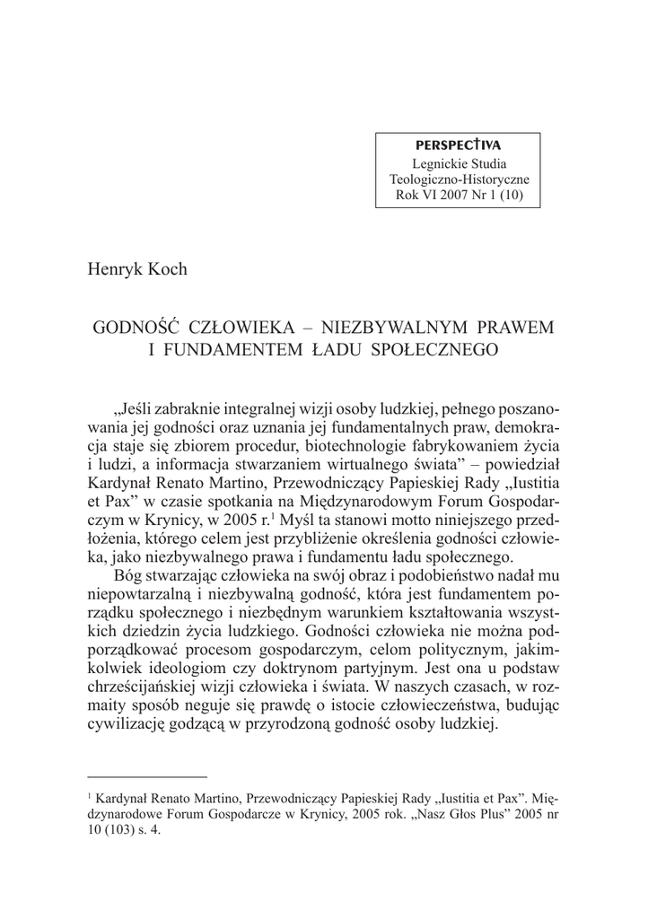 90 HENRYK KOCH † PERSPECTIVA Legnickie Studia Teologiczno-Historyczne Rok VI 2007 Nr 1 (10) Henryk Koch GODNOŚĆ CZŁOWIEKA – NIEZBYWALNYM PRAWEM I FUNDAMENTEM ŁADU SPOŁECZNEGO „Jeśli zabraknie integralnej wizji osoby ludzkiej, pełnego poszanowania jej godności oraz uznania jej fundamentalnych praw, demokracja staje się zbiorem procedur, biotechnologie fabrykowaniem życia i ludzi, a informacja stwarzaniem wirtualnego świata” – powiedział Kardynał Renato Martino, Przewodniczący Papieskiej Rady „Iustitia et Pax” w czasie spotkania na Międzynarodowym Forum Gospodarczym w Krynicy, w 2005 r.1 Myśl ta stanowi motto niniejszego przedłożenia, którego celem jest przybliżenie określenia godności człowieka, jako niezbywalnego prawa i fundamentu ładu społecznego. Bóg stwarzając człowieka na swój obraz i podobieństwo nadał mu niepowtarzalną i niezbywalną godność, która jest fundamentem porządku społecznego i niezbędnym warunkiem kształtowania wszystkich dziedzin życia ludzkiego. Godności człowieka nie można podporządkować procesom gospodarczym, celom politycznym, jakimkolwiek ideologiom czy doktrynom partyjnym. Jest ona u podstaw chrześcijańskiej wizji człowieka i świata. W naszych czasach, w rozmaity sposób neguje się prawdę o istocie człowieczeństwa, budując cywilizację godzącą w przyrodzoną godność osoby ludzkiej. Kardynał Renato Martino, Przewodniczący Papieskiej Rady „Iustitia et Pax”. Międzynarodowe Forum Gospodarcze w Krynicy, 2005 rok. „Nasz Głos Plus” 2005 nr 10 (103) s. 4. 1 Godność człowieka – niezbywalnym prawem 91 Dlatego pragnąc „służyć człowiekowi w społeczeństwie”, w duchu nauczania społecznego Kościoła oraz kierując się szczególnie myślą i wskazaniami Sługi Bożego Jana Pawła II i obecnego Papieża Benedykta XVI, a także realizując swój własny program, Katolickie Stowarzyszenie Civitas Christiana, podjęło w roku 2006 szerszą refleksję nad zagadnieniem godności człowieka, zwieńczoną hasłem programowym: Godność człowieka – niezbywalnym prawem i fundamentem ładu społecznego2. 1. POJĘCIE GODNOŚCI CZŁOWIEKA Godność człowieka może być rozpatrywana wieloaspektowo. Samo pojęcie godności, wg Słownika języka polskiego oznacza poczucie, świadomość własnej wartości, szacunek dla samego siebie, honor, dumę3. Natomiast słowo godność – łacińskie dignitas, wg Encyklopedii Katolickiej, oznacza szczególną wartość człowieka jako osoby, pozostającej w relacjach interpersonalnych, ostatecznie do osoby Boga, uzasadniających i usensowniających życie osobowe. Oznacza także pozytywnie wartościującą relację do własnej osoby i grupy, np. zawodowej, klasowej, narodowej, z którym jednostka się identyfikuje. Konstytuującym komponentem tego ustosunkowania się jest samoocena polegająca na przeżywaniu swojej wartości i pozytywnego obrazu siebie, która motywuje do moralnie wartościowych zachowań, uodparnia na wszelkie formy manipulacji, zniewalania, wpływa na radzenie sobie w sytuacjach trudnych oraz zakłada poczucie wewnętrznej wolności, autodeterminacji (podmiotowości) i odpowiedzialności4. Nas interesuje pojęcie godności człowieka w aspekcie nauki społecznej kościoła, toteż warto przytoczyć (in extenso) jej definicję zawartą w Słowniku Katolickiej Nauki Społecznej: „Godność człowieka – specyficzna wartość osoby ludzkiej. Problem godności związany pierwotnie z teologią chrześcijańską (głównie chrystologią i mariologią) z czasem stał się osobnym zagadnieniem filozoficznym. Godność każdego człowieka odnosi się do jego osobowego istnienia i może być rozpatrywana w dwóch aspektach: naturalnym i nadprzyTamże. s. 4-7. Słownik Języka Polskiego PWN. T. 1. Warszawa 1978 s. 673. 4 Z. CHLEWIŃSKI, Z. ZALESKI. Godność. W: Encyklopedia katolicka. T. 5. Red. L. Bieńkowski [i in.]. Lublin 1989 s. 1231. 2 3 92 HENRYK KOCH rodzonym. W aspekcie naturalnym godność wyraża zdolność człowieka do wolnego i świadomego działania, do rozwoju intelektualnego i moralnego. Natomiast w wymiarze nadprzyrodzonym godność odsłania uczestnictwo człowieka w rzeczywistości transcendentnej, w życiu Osób Bożych. Człowiekowi jako osobie posiadającej godność, przysługuje pewna autonomia w zakresie wartości i sposobu ich realizowania. Sama godność jest wartością nieredukowalną, zakorzenioną w ontycznej strukturze człowieka i jego osobowej kondycji. W niej też zawiera się postulat moralnego doskonalenia się człowieka, jego samorealizacji w obszarze najwyższych dóbr. Tym samym godność ujawnia nadrzędność osoby i jej pozycji wobec wszystkich innych bytów stworzonych i związanych z nimi dóbr (z dobrem wspólnym włącznie). Ten ostatni aspekt godności został rozwinięty przez etyków o orientacji personalistycznej i znalazł swoje praktyczne odniesienie w tzw. normie personalistycznej, a więc bezwzględnej powinności afirmowania osób w imię ich godności. Teoretyczne podstawy godności sięgają zarówno do założeń teologicznych, metafizycznych, jak i antropologicznych i etycznych. Każda z tych dziedzin zajmuje się innym doświadczeniem godności i sprowadza tę wartość do: własności transcendentalnej lub kategorialnej osoby, wartości ontycznej osoby i jej powiązania z Bogiem i światem osób oraz zasady konstytutywnej wartości moralnych”5. 2. GODNOŚĆ CZŁOWIEKA W NAUCZANIU SPOŁECZNYM KOŚCIOŁA I JANA PAWŁA II Odniesienia do godności człowieka, w różnych jego znaczeniach, zawiera także Katechizm Kościoła Katolickiego (aż 41 razy). Mając na uwadze godność człowieka, jego niezbywalne prawo i fundament ładu społecznego, w Katechizmie Kościoła Katolickiego zauważamy, iż ten aspekt godności człowieka ma swoje właściwe miejsce. Już na samym początku, w dziale pierwszym czytamy, iż „pragnienie Boga jest wpisane w serce człowieka, ponieważ zo