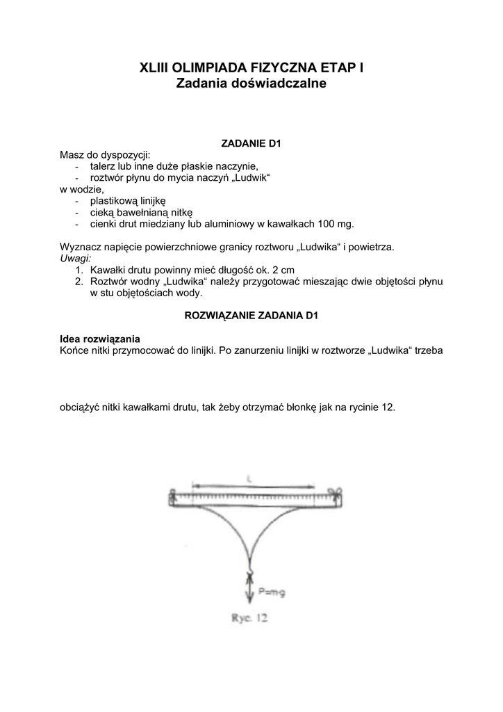 XLIII OLIMPIADA FIZYCZNA ETAP I Zadania doświadczalne ZADANIE D1 Masz do dyspozycji: - talerz lub inne duże płaskie naczynie, - roztwór płynu do mycia naczyń „Ludwik“ w wodzie, - plastikową linijkę - cieką bawełnianą nitkę - cienki drut miedziany lub aluminiowy w kawałkach 100 mg. Wyznacz napięcie powierzchniowe granicy roztworu „Ludwika“ i powietrza. Uwagi: 1. Kawałki drutu powinny mieć długość ok. 2 cm 2. Roztwór wodny „Ludwika“ należy przygotować mieszając dwie objętości płynu w stu objętościach wody. ROZWIĄZANIE ZADANIA D1 Idea rozwiązania Końce nitki przymocować do linijki. Po zanurzeniu linijki w roztworze „Ludwika“ trzeba obciążyć nitki kawałkami drutu, tak żeby otrzymać błonkę jak na rycinie 12. Jeśli do doświadczenia użyć cienkiej nitki, można łatwo uzyskać warunki, w których masa nitki i błonki jest pomijalnie mała. Wtedy szerokość błony L jest określona tylko przez ciężar P = mg zawieszony na nitce. Można to opisać równaniem 2σL = mg , skąd L= g m, 2σ (1) gdzie σ - napięcie powierzchniowe, g - przyspieszenie ziemskie. L – szerokość błonki. m - masa obciążników. W celu wyznaczenia wartości napięcia powierzchniowego wystarczy więc zmierzyć błonki L oraz odpowiadającą jej masę obciążnika m . Dla uzyskania lepszej dokładności wyznaczenia σ należy wykonać serię L z różnymi masami obciążników m . Dopasowanie prostej do zależności m od L pozwala wyznaczyć wartość współczynnika kierunkowego A= g 2σ skąd szukane napięcie powierzchniowe σ= g 2A Wykonanie doświadczenia Przed przystąpieniem do wykonania doświadczenia zmierzono długość i wyznaczono masę kawałka drutu. Drut pocięto na kawałki. Masę każdego określono na podstawie długości. Z jednego z drucików (o znanej masie) wykonano haczyk do zawieszania pozostałych kawałków drutu na nitce. Następnie do linijki dowiązano końce nitki. Nitka była wystarczająca długa, dzięki czemu zawieszone ciężarki były podtrzymywane przez siły napięcia powierzchniowego błonki, a nie siły naciągu nici. Linijkę wraz z nitką, na której zamocowano haczyk, zanurzono w wodzie z „Ludwikiem“. Aby otrzymać błonkę, z roztworu wyciągano (chwytając za haczyk) nitkę. Po uformowaniu błonki zawieszano na haczyku różne masy drutu. Dla zwiększenia dokładności, pomiar szerokości błonki L wykonywano zawieszając kilkakrotnie tę samą masę drutu. Następnie dla serii pomiarów wyznaczono wartość średnią L odpowiadającą masie m oraz jej błąd ∆L Uzyskane w ten sposób wyniki pomiarów przedstawiono na ryc. 13 Dopasowanie prostej do zależności m od L dało wartość współczynnika kierunkowego A = (18 ± 2)cm / g . Obliczona na jego podstawie wartość napięcia powierzchniowego σ = (27 ± 3) ⋅ 10 −3 N / m jest zbliżona do wartości otrzymanych innymi metodami pomiarowymi. Główną przyczyną niedokładności pomiaru jest błąd w wyznaczenia szerokości błonki. Istotnym czynnikiem wpływającym na dokładność pomiaru są kropelki wody zbierające się na nierównościach nitki oraz pęcherzyki powietrza tworzące się w „kącikach“ błonki. Źródło: Zadanie pochodzi z czasopisma „Fizyka w Szkole” Komitet Okręgowy Olimpiady Fizycznej w Szczecinie www.of.szc.pl