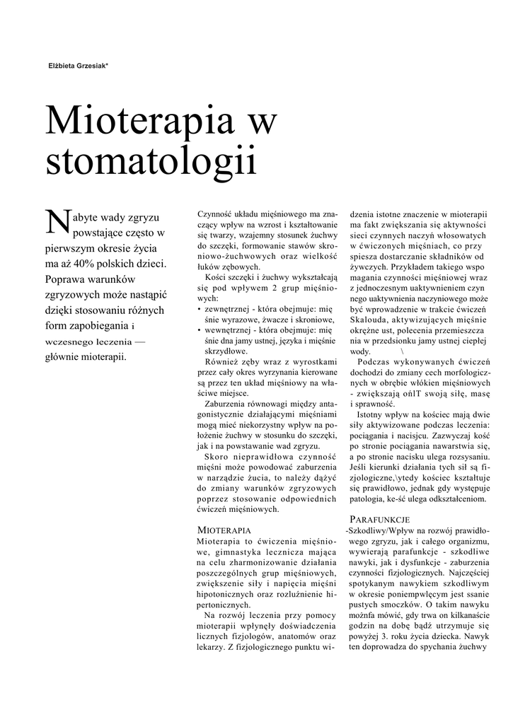 Elżbieta Grzesiak* Mioterapia w stomatologii N abyte wady zgryzu powstające często w pierwszym okresie życia ma aż 40% polskich dzieci. Poprawa warunków zgryzowych może nastąpić dzięki stosowaniu różnych form zapobiegania i wczesnego leczenia głównie mioterapii. — Czynność układu mięśniowego ma znaczący wpływ na wzrost i kształtowanie się twarzy, wzajemny stosunek żuchwy do szczęki, formowanie stawów skroniowo-żuchwowych oraz wielkość łuków zębowych. Kości szczęki i żuchwy wykształcają się pod wpływem 2 grup mięśniowych: • zewnętrznej - która obejmuje: mię śnie wyrazowe, żwacze i skroniowe, • wewnętrznej - która obejmuje: mię śnie dna jamy ustnej, języka i mięśnie skrzydłowe. Również zęby wraz z wyrostkami przez cały okres wyrzynania kierowane są przez ten układ mięśniowy na właściwe miejsce. Zaburzenia równowagi między antagonistycznie działającymi mięśniami mogą mieć niekorzystny wpływ na położenie żuchwy w stosunku do szczęki, jak i na powstawanie wad zgryzu. Skoro nieprawidło wa czynno ść mięśni może powodować zaburzenia w narządzie żucia, to należy dążyć do zmiany warunków zgryzowych poprzez stosowanie odpowiednich ćwiczeń mięśniowych. dzenia istotne znaczenie w mioterapii ma fakt zwiększania się aktywności sieci czynnych naczyń włosowatych w ćwiczonych mięśniach, co przy spiesza dostarczanie składników od żywczych. Przykładem takiego wspo magania czynności mięśniowej wraz z jednoczesnym uaktywnieniem czyn nego uaktywnienia naczyniowego może być wprowadzenie w trakcie ćwiczeń Skalouda, aktywizujących mięśnie okrężne ust, polecenia przemieszcza nia w przedsionku jamy ustnej ciepłej wody. \ Podczas wykonywanych ćwiczeń dochodzi do zmiany cech morfologicznych w obrębie włókien mięśniowych - zwiększają ońlT swoją siłę, masę i sprawność. Istotny wpływ na kościec mają dwie siły aktywizowane podczas leczenia: pociągania i nacisjcu. Zazwyczaj kość po stronie pociągania nawarstwia się, a po stronie nacisku ulega rozsysaniu. Jeśli kierunki działania tych sił są fizjologiczne,\ytedy kościec kształtuje się prawidłowo, jednak gdy występuje patologia, ke-ść ulega odkształceniom. PARAFUNKCJE MIOTERAPIA Mioterapia to ćwiczenia mięśnio we, gimnastyka lecznicza mająca na celu zharmonizowanie działania poszczególnych grup mięśniowych, zwiększenie siły i napięcia mięśni hipotonicznych oraz rozluźnienie hipertonicznych. Na rozwój leczenia przy pomocy mioterapii wpłynęły doświadczenia licznych fizjologów, anatomów oraz lekarzy. Z fizjologicznego punktu wi- -Szkodliwy/Wpływ na rozwój prawidłowego zgryzu, jak i całego organizmu, wywierają parafunkcje - szkodliwe nawyki, jak i dysfunkcje - zaburzenia czynności fizjologicznych. Najczęściej spotykanym nawykiem szkodliwym w okresie poniempwlęcym jest ssanie pustych smoczków. O takim nawyku możnfa mówić, gdy trwa on kilkanaście godzin na dobę bądź utrzymuje się powyżej 3. roku życia dziecka. Nawyk ten doprowadza do spychania żuchwy do tyłu, z jednoczesnym wypychaniem zębów siecznych szczęki. Prowadzi to do tyłozgryzu, protruzji siekaczy górnych lub zwężenia szczęk. Niekorzystną parafunkcją jest również ssanie palca; w zależności od jego ułożenia może prowadzić to do: wychylenia siekaczy górnych, zwężenia szczęki i retruzji siekaczy dolnych. U dzieci w wieku przedszkolnym często spotykaną parafunkcją jest ssanie wargi, języka bądź policzka. Powoduje to braki kontaktu zębów górnych z dolnymi i prowadzi do wystąpienia zgryzu otwartego przedniego bądź bocznego. W okresie wczesnoszkolnym dzieci przeżywają pierwsze stresy i wtedy upust tych emocji znajdują we wkładaniu do ust kredek, długopisów i innych przedmiotów i ich obgryzaniu. Również takie nawyki mogą prowadzić do powstania zgryzów otwartych bądź dotylnych. DYSFUNKCJE Zaburzone czynności fizjologiczne dysfunkcje - dotyczą głównie nie-' prawidłowego oddychania, złej pozycji podczas snu, karmienia. W trakcie oddychania przez usta nie ma impulsów ze strony mięśni i dochodzi do zaburzeń równowagi działania języka, policzków i warg. Dochodzi do zahamowania poprzecznego wzrostu szczęk, kształtuje się gotyckie podniebienie. W konsekwencji prowadzi to do powstania: tyłozgryzu, wychylenia zębów górnych przednich i zgryzu krzyżowego bocznego, a twarz dziecka nabiera charakterystycznego wyglądu -facies adenoidea. Taki stan często obserwujemy przy przeroście migdałów, gdy dziecko prawie cały czas ma niedomkniętą jamę ustną. W pierwszym półroczu życia dziecko przesypia większą część doby - ważne jest jego prawidłowe ułożenie do snu. By nie doszło do dysfunkcji związanej z ufożeniem podczas snu, należy pamiętać, by niemowlę było ułożone na plecach, ciało powinno być w po/zycji poziomej, natomiast głowa winna spoczywać na małej poduszce, dzięki czemu głowa będzie się nieznacznie przesuwać ku klatce piersiowej. Odpowiednie utrzymanie niemowlaka podczas karmienia jest także istotne w zwalczaniu nieprawidłowości. Wskazane jest, by niemowlę było karmione piersią, gdyż tylko wtedy nastąpi prawidłowy, harmonijny rozwój mięśni i narządu żucia. Niemowlę podczas karmienia piersią powinno być utrzymane niemal pionowo, co pozwala na fizjologiczne przesuwanie się żuchwy i ułatwia oddychanie przez nos. Błędy w karmieniu niemowlaka, jak i przedłużone karmienie butelką, mogą doprowadzić do zaburzeń w całym narządzie żucia: wad z grupy tyło zgryzów, nadmiernego wysklepienia podniebienia. Przetrwały niemowlęcy typ połykania jest dysfunkcją, w trakcie której przy rozchylonych szczękach język wsuwany jest przez dziecko między wały dziąsłowe. Przetrwanie takiego stanu powyżej 4. roku życia może prowadzić do zgryzu otwartego, tyłozgryzu bądź zgryzu krzyżowego - w zależności od teg