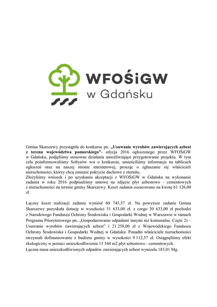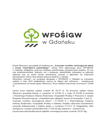 Gmina Skarszewy przystąpiła do konkursu pn. „Usuwanie wyrobów zawierających azbest z terenu województwa pomorskiego”- edycja 2016 ogłoszonego przez WFOŚiGW w Gdańsku, podjęliśmy stosowne działania umożliwiające przygotowanie projektu. W tym celu poinformowaliśmy Sołtysów wsi o konkursie, umieściliśmy informacje na tablicach ogłoszeń oraz na naszej stronie internetowej, prosząc o zgłaszanie się właścicieli nieruchomości, którzy chcą zmienić pokrycie dachowe z eternitu. Złożyliśmy wniosek i po uzyskaniu akceptacji z WFOŚiGW w Gdańsku na wykonanie zadania w roku 2016 podpisaliśmy umowę na zdjęcie płyt azbestowo - cementowych z nieruchomości na terenie gminy Skarszewy. Koszt zadania oszacowano na kwotę 61 126,00 zł. Łączny koszt realizacji zadania wyniósł 60 745,57 zł. Na powyższe zadanie Gmina Skarszewy pozyskała dotację w wysokości 51 633,00 zł, z czego 30 633,00 zł pochodzi z Narodowego Funduszu Ochrony Środowiska i Gospodarki Wodnej w Warszawie w ramach Programu Priorytetowego pn. „Gospodarowanie odpadami innymi niż komunalne. Część 2) – Usuwanie wyrobów zawierających azbest” i 21 258,00 zł z Wojewódzkiego Funduszu Ochrony Środowiska i Gospodarki Wodnej w Gdańsku. Ponadto właściciele nieruchomości otrzymali dofinansowanie z budżetu gminy w wysokości 9 112,57 zł. Osiągnęliśmy efekt ekologiczny w postaci unieszkodliwienia 13 544 m2 płyt azbestowo - cementowych. Łączna masa unieszkodliwionych odpadów zawierających azbest wyniosła 183,01 Mg. Punkt informacyjny dotyczący usuwania azbestu na terenie Gminy Skarszewy. Właściciele nieruchomości z terenu Gminy Skarszewy mogą uzyskać informacje na temat usuwania azbestu w Urzędzie Miejskim w Skarszewach, pok. nr 3, numer telefony 58/ 588 22 01 wew. 28, e-mail: [email protected] ABC o azbeście Azbest jest substancją o szkodliwym działaniu dla organizmu człowieka. Zagrożeniem są bardzo małe włókna azbestowe, które przedostają się z powietrzem do płuc i zwykle po kilkunastu latach mogą spowodować szereg chorób płuc z rakiem płuc włącznie. Od 1997 r. w na terenie Polski obowiązuje zakaz produkcji, handlu oraz stosowania wyrobów zawierających azbest. Zakaz taki wprowadzono ustawą z 19 czerwca 1997 r. o zakazie stosowania wyrobów zawierających azbest (Dz. U. z 2004 r. Nr 3, poz. 20 z późn. zm.). Dnia 14 maja 2002 r. Rada Ministrów przyjęła „Program usuwania azbestu i wyrobów zawierających azbest stosowanych na terytorium Polski”. Program ten zastąpiony został przez "Program Oczyszczania Kraju z Azbestu na lata 2009-2032", ustanowiony uchwałą Nr 122/2009 Rady Ministrów z dnia 14 lipca 2009 r., zmienioną uchwałą Nr 39/2010 Rady Ministrów z dnia 15 marca 2010 r. Obowiązujący program krajowy utrzymuje dotychczasowe cele i określa zadania niezbędne do oczyszczenia kraju z azbestu. W sposób szczegółowy określa również wymagania dotyczące postępowania z wyrobami i odpadami azbestowymi, obowiązki organów administracji, a także właścicieli i zarządców nieruchomości w tym zakresie oraz obowiązki wykonawców prac polegających na zabezpieczeniu i usuwaniu wyrobów zawierających azbest. Polskie prawodawstwo dopuszcza wykorzystywanie azbestu lub wyrobów zawierających azbest w użytkowanych budynkach, instalacjach lub urządzeniach nie dłużej niż do dnia 31 grudnia 2032 roku. Więcej informacji dotyczących usuwania azbestu, m. in. na temat zmian legislacyjnych, źródeł finansowania projektów związanych z azbestem można znaleźć na stronie serwisu internetowego Ministerstwa Gospodarki: www.mg.gov.pl/Bezpieczenstwo+gospodarcze/Program+Oczyszczania+Kraju+z+Azbestu Strony internetowe zawierające informacje o azbeście: I. Ministerstwo Gospodarki: www.mg.gov.pl/Bezpieczenstwo+gospodarcze/Program+Oczyszczania+Kraju+z+Azbestu 2. Baza azbestowa www.bazaazbestowa.gov.pl 3. Federacja Zielonych GAJA www.gajanet.pl i www.bezazbestu.com.pl Usuwanie azbestu na terenie Gminy Skarszewy. W roku 2015 łączna masa unieszkodliwionych odpadów zawierających azbest wyniosła 126,56 Mg. Łączny koszt realizacji zadania wyniósł 55 087,76 zł. Na powyższe zadanie Gmina Skarszewy pozyskała dotację w wysokości 46 810,00 zł, z czego 27 533,00 zł pochodzi z Narodowego Funduszu Ochrony Środowiska i Gospodarki Wodnej w Warszawie w ramach Programu Priorytetowego pn. „Gospodarowanie odpadami innymi niż komunalne. Część 2) – Usuwanie wyrobów zawierających azbest” i 19 277,00 zł z Wojewódzkiego Funduszu Ochrony Środowiska i Gospodarki Wodnej w Gdańsku. Ponadto właściciele nieruchomości otrzymali dofinansowanie z budżetu gminy w wysokości 8 277,76 zł. Osiągnęliśmy efekt ekologiczny w postaci unieszkodliwienia 9 361 m2 płyt azbestowo - cementowych. W 2014 r. w projekcie uczestniczyło 17 właścicieli nieruchomości. Łączna masa unieszkodliwionych odpadów zawierających azbest wyniosła 52,36 Mg. Koszt realizacji zadania wyniósł 24 592,87 zł. Na powyższe zadanie Gmina Skarszewy pozyskała dotację w wysokości 23 855,08 zł, z czego 50% kwoty, tj. 11 927,54 zł pochodziło z Narodowego Funduszu Ochrony Środowiska i Gospodarki Wodnej w Warszawie w ramach Programu Priorytetowego pn. „Gospodarowanie odpadami innymi niż komunalne. Część 2) – Usuwanie wyrobów zawierających azbest” i 50 % kwoty, tj. 11 927,54 zł z Wojewódzkiego Funduszu Ochrony Środowiska i Gospodarki Wodnej w Gdańsku. Ponadto właściciele nieruchomości otrzymali dofinansowanie z budżetu gmin w wysokości 737,79 zł.