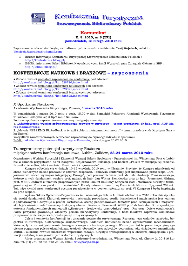 Komunikat R. 8: 2010, nr 8 (251) poniedziałek, 15 lutego 2010 roku Zapraszam do odwiedzin blogów, aktualizowanych w zasadzie codziennie, Twój Wojciech, redaktor, [email protected] o o Bieżące informacje Konfraterni Turystycznej Stowarzyszenia Bibliotekarzy Polskich : http://konfraternia.bloog.pl/ ISBNik: informator Sekcji Bibliotek Niepaństwowych Szkół Wyższych przy Zarządzie Głównym SBP : http://isbnik.bloog.pl/ KONFERENCJE NAUKOWE i BRANŻOWE – z a p r o s z e n i a ● Zobacz również pozostałe zaproszenia na konferencje pod adresem: http://konfraternia1.bloog.pl/kat,528786,index.html ● Zobacz również terminarz konferencji naukowych pod adresem : http://konfraternia1.bloog.pl/kat,528521,index.html ● Zobacz również terminarz konferencji branżowych pod adresem: http://konfraternia1.bloog.pl/kat,528522,index.html X Spotkanie Naukowe Akademia Wychowania Fizycznego, Poznań, 1 marca 2010 roku W poniedziałek 1 marca 2010 roku o godz. 15.00 w Sali Senackiej Rektoratu Akademii Wychowania Fizycznego w Poznaniu odbędzie się X Spotkanie Naukowe. Podczas spotkania zaprezentowane zostaną następujące tematy: 1. „Aksjologiczny wymiar zrównoważonego rozwoju w turystyce" - temat przedstawi dr hab., prof. AWF Marek Kazimierczak, 2. „Metoda FES i EMG Biofeedback w terapii kobiet z nietrzymaniem moczu” - temat przedstawi dr Krystyna Garstka-Namysł Wszystkich zainteresowanych serdecznie zapraszamy do czynnego udziału w spotkaniu Źródło : Akademia Wychowania Fizycznego w Poznaniu, data dostępu 20.02.2010 Transgraniczny potencjał turystyczny Roztocza międzynarodowa konferencja naukowa, Lublin, Żółkiew, 23-24 marca 2010 roku Organizator : Wydział Turystyki i Ekonomii Wyższej Szkoły Społeczno - Przyrodniczej im. Wincentego Pola w Lublinie w ramach przygotowań do VI Kongresu Krajoznawstwa Polskiego pod hasłem ,,Polska w europejskiej rodzinie. Przenikanie kultur, idei i wartości. Powinności krajoznawców". Kongres odbędzie się w dniach 10-12 września 2010 roku w Olsztynie. Przyjęto, że Kongres niezależnie od obrad plenarnych będzie pracował w czterech zespołach. Tematyka konferencji jest inspirowana przez zespół „Krajoznawstwo wobec wymagań integrującej Europy”, pod przewodnictwem prof. dr hab. Andrzeja Tomaszewskiego, którego w tych działaniach wspiera prof. nadzw. dr hab. Jan Wiktor Sienkiewicz oraz dr hab. Franciszek Midura, prof. WSSP. Jednym z tematów proponowanych przez komitet naukowy Kongresu jest: ,,Możliwość turystyki transgranicznej na Roztoczu polskim i ukraińskim". Koordynatorami tematu są Franciszek Midura i Zygmunt Wilczek. Tak więc wyniki prac konferencji zostaną przedstawione w postaci referatu na sesji VI Kongresu i będą inspiracją do prac zespołu. Wyższa Szkoła Społeczno-Przyrodnicza im. Wincentego Pola w Lublinie obchodzi w 2010 roku dziesięciolecie swojej działalności. Kierunek turystyka i rekreacja prowadzący studia licencjackie i magisterskie jest jednym z podstawowych i decyduje o profilu kształcenia. szereg podejmowanych tematów prac licencjackiech i magisterskich jak również badań naukowych dotyczy obszaru Roztocza. Pracownik WSSP prof. dr hab. Jan Buraczyński jest autorem fundamentalnych monografii (,,Roztocze - środowisko przyrodnicze" oraz ,,Roztocze. Dzieje osadnictwa"). Fakty powyższe gwarantują właściwy poziom merytoryczny konferencji, a baza lokalowa zapewnia komfortowe przeprowadzenie wszystkich przedsięwzięć z nią związanych. Celem i tematyką konferencji jest ukazanie potencjału turystycznego Roztocza, jego walorów, zasobów, bogactwa kulturowego, historycznego krajoznawczego. Zadaniem konferencji będzie wypracowanie mechanizmów, które wpłyną na zaktywizowanie transgranicznego ruchu turystycznego. Ważna jest także prezentacja ginącego piękna pogranicza polsko-ukraińskiego, tradycji, obyczajów oraz zabytków pogranicza jako świadectwa przenikania kultur. Pokazanie również możliwości wspierania rozwoju turystyki transgranicznej w obszarze europejskim i promocji medialnej transgranicznych walorów turystycznych. Adres organizatora: Wyższa Szkoła Społeczno-Przyrodnicza im. Wincentego Pola, ul. Choiny 2, 20-816 Lublin, tel. (81) 740-72-40, 740-25-08, email: [email protected] Pełną informację znajdziesz tutaj >>> : http://www.wssp.edu.pl/?module=Default&action=ContentController§ionId=322&parentId=1, data dostępu 16.02.2010 Źródło: Wyższa Szkoła Społeczno-Przyrodnicza im. Wincentego Pola w Lublinie, data dostępu 16.02.2010 Obszary metropolitalne we współczesnym środowisku geograficznym 58. Zjazd Polskiego Towarzystwa Geograficznego, Łódź, 8-12 września 2010 roku Organizatorzy: Polskie Towarzystwo Geograficzne, Oddział Łódzki Polskiego Towarzystwa Geograficznego, Wydział Nauk Geograficznych Uniwersytetu Łódzkiego, Urząd Miasta Łodzi Rada Naukowa 58 Zjazdu PTG pod przewodnictwem prof. dr hab. Stanisława Liszewskiego dokonała podziału obrad Zjazdu na poszczególne sekcje tematyczne: 1. geografii fizycznej ogólnej – koordynator prof. dr hab. Joanna Wibig; 2. geografii ekonomicznej; 3. dydaktyki geografii – koordynator dr hab. Elżbieta Szkurłat prof. UŁ; 4. geografii społeczno-kulturowej – koordynator dr hab. Andrzej Suliborski prof. UŁ; 5. geografii politycznej i historycznej – koordynator prof. dr hab. Marek Sobczyński; 6. geografii miast – koordynator dr hab. Jolanta Jakóbczyk-Gryszkiewicz prof. UŁ; 7. geografii turyzmu – koordynator dr hab. Bogdan Włodarczyk, prof. UŁ; 8. geografii wsi – koordynator dr Marcin Wójcik; 9. klimatu i wód obszarów miejskich – koordynator prof. dr hab. Paweł Jokiel. Adres korespondencyjny: Robert Wiluś, Instytut Geografii Miast i Turyzmu Uniwersytetu Łódzkiego, ul. Kopcińskiego 31, 90-142 Łódź (z dopiskiem 58. Zjazd PTG), tel. (42) 635-45-55, (42) 635-45-83, fax. (42) 635-45-50; email: [email protected] Szczegóły programowe i organizacyjne znajdziesz tutaj 