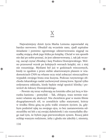 X Najważniejszy dzień życia Marka Lemona zapowiadał się bardzo nerwowo. Obudził się wcześnie rano, zjadł szpitalne śniadanie i pomimo ogromnego zdenerwowania sięgnął na szafkę stojącą obok jego łóżka po książkę. Chciał w ten sposób nie dać po sobie poznać, że jest zdenerwowany, i, tak jak wczoraj, zaczął czytać Zbrodnię i karę Fiodora Dostojewskiego. Wolno przesuwał wzrok po kolejnych wersach książki, nic z niej nie rozumiejąc. Myślami był już w godzinach wieczornych, kiedy to zgodnie z przez siebie ukartowanym planem w wiadomościach CNN na własne oczy miał zobaczyć nieszczęśliwy wypadek swojego brata oraz kuzyna. Podczas rutynowego obchodu lekarskiego nadal zachowywał zimną krew. Spytał tylko ordynatora oddziału, kiedy będzie mógł opuścić klinikę i powrócił do lektury Dostojewskiego. – Pewnie się teraz wybierają na lotnisko albo już lecą w kierunku kanionu – pomyślał. – Tak, chłopcy, wasz termin ważności właśnie się skończył. Nie chcieliście grać w moim filmie drugoplanowych ról, to zostaliście tylko statystami, którzy w środku filmu giną na polu walki zwanym życiem. Ja, gdybym podniósł rękę na swojego ojca, to bez zastanowienia odstrzeliłby mi łeb z tej swojej dubeltówki i nie rozmyślałby długo nad tym, że byłem jego pierworodnym synem. Rzucę jakiś ochłap waszym rodzinom, żeby z głodu nie zdechły i, niestety, 116 kokainowa milosc.indd 116 2013-10-21 17:23:11 — Kokainowa Miłość — będę wam musiał wyprawić godny pogrzeb ze stypą na paręset osób, aby się nikt nie zorientował. A najgorsze, że naprawdę będę musiał udawać, jak mi jest was bardzo żal. Najchętniej za to, co mi zrobiliście, przywiązałbym wam po kamieniu do szyi i wrzucił do oceanu. A tu jeszcze na takie dwa ścierwa będę musiał wydać tyle mojej kasy. Energicznym ruchem ręki zamknął książkę i położył na szafkę. Spojrzał w okno i na wiszący obok niego niewielki zegar. Dochodziła właśnie godzina jedenasta. Czekając na szczęśliwe rozwiązanie swego genialnego planu, pod wpływem bólu po nożu wbitym mu pomiędzy bark a klatkę piersiową przez Freda i napięcia spowodowanego tym, co ma się wkrótce wydarzyć, pewien swojej decyzji zamknął oczy i zasnął. Tymczasem Alan, siedząc za sterami sportowego samolotu, łagodnie unosił swą rozpędzoną po pasie maszynę z pasa startowego pod Los Angeles. Z boku siedział wieczny kawaler Kurt, a z tyłu żona Alana wraz z synem i ciężarną córką. Alan wzbił się na jakieś pięćset metrów i zrobił jak zawsze ostry wiraż w lewo, aby napawać się widokiem swojego rodzinnego Los Angeles. Roczny samolot sprawował się fantastycznie. Lekkie ruchy wykonywane przez Alana od razu przekładały się na prawidłowy lot awionetki. Wytapicerowany w środku naturalną jasnoczekoladową skórą pokrywającą grubą elastyczną gąbkę samolot był bardzo wygodny. Przeleciał nad miastem i obrał kurs na Wielki Kanion. Alan włączył swoją ulubioną płytę Franka Sinatry i zadowolony z siebie leciał po bezchmurnym niebie, myśląc o czekającej go rozmowie z Markiem. Kurt oparł głowę o zagłówek fotela i podziwiał, w jakim pięknym kraju przyszło mu żyć. Żona Alana jak zwykle przekomarzała się z córką o imię dla jeszcze nienarodzonego dziecka. Nudził 117 kokainowa milosc.indd 117 2013-10-21 17:23:11 Robert Gong się tylko syn Alana. Miał gdzieś tę całą wycieczkę nad Wielki Kanion; wolałby zostać w domu i iść ze swoją dziewczyną i kolegami na mecz futbolu amerykańskiego. Jednak kategoryczne zdanie jego ojca, z którym nie mógł polemizować, przymusiło go do tej wycieczki. Siedział, patrząc beznamiętnie w okno i na zadawane pytania odpowiadał tylko „tak” lub „nie”. Po jakichś dziesięciu minutach lotu i pierwszych sprzeczkach rodzinnych silnik awionetki nagle zgasł. Nerwowe próby Alana, by go uruchomić, spełzły na niczym i w pewnym momencie pilot zdał sobie sprawę, iż ma tylko jedno wyjście z tej beznadziejnej sytuacji: musi sterować samolotem jak szybowcem i znaleźć jakąś równą drogę, na której mógłby wylądować. – Nie dasz rady, Alan – smutno oznajmił Kurt. – Dlaczego? – rzucił przerażony kuzyn. – Za dużo wzięliśmy bagażu do luków bocznych. W oczy Alana po raz pierwszy w życiu zajrzała śmierć. Kurt miał rację, pomimo manewrów Alana samolot z wysokości prawie kilometra zaczął spadać coraz szybciej, aż w końcu osiągnął prędkość zrzuconej z samolotu bomby. W kabinie awionetki rozległ się paniczny krzyk kobiet i po chwili z impetem samolot wbił się w mało uczęszczaną drogę. Z odległości paru kilometrów było widać słup ognia, a później już tylko unoszący się nad tym miejscem ciemny, duszący dym. Po parunastu minutach do miejsca wypadku przybyły wszystkie służby ratownicze na czele ze strażą pożarną. Zjawił się też szeryf miasta Los Angeles, Jim Marey, który był również w domku letniskowym po napadzie na Marka Lemona. Chodził wkoło i przyglądał się na wpół zwęglonym porozrzucanym ciałom rodziny Lemonów. Nie robiło to na nim większego wrażenia; w swojej długiej policyjnej służbie widział już takie rzeczy, 118 kokainowa milosc.indd 118 2013-10-21 17:23:11 — Kokainowa Miłość — a ten wypadek był jednym z wielu i to wcale nie najkrwawszy. Wszystkie osoby katastrofy z wielką starannością zawinięto do czarnych worków i specjalnie przystosowanym samochodem przewieziono do prosektorium na sekcję zwłok. Marey tymczasem chodził wkoło pogorzeliska i dokładnie wszystkiemu się przyglądał. – To nie jest zbieg okoliczności – pomyślał – na pewno to nie jest zbieg okoliczności – powtórzył w myślach. Nie wiem w jaki sposób ten bydlak to zrobił, ale to robota Marka Lemona. Fuck – zaklął soczyście, aż zwrócili na niego uwagę podwładni. – Znowu mam tylko przypuszc